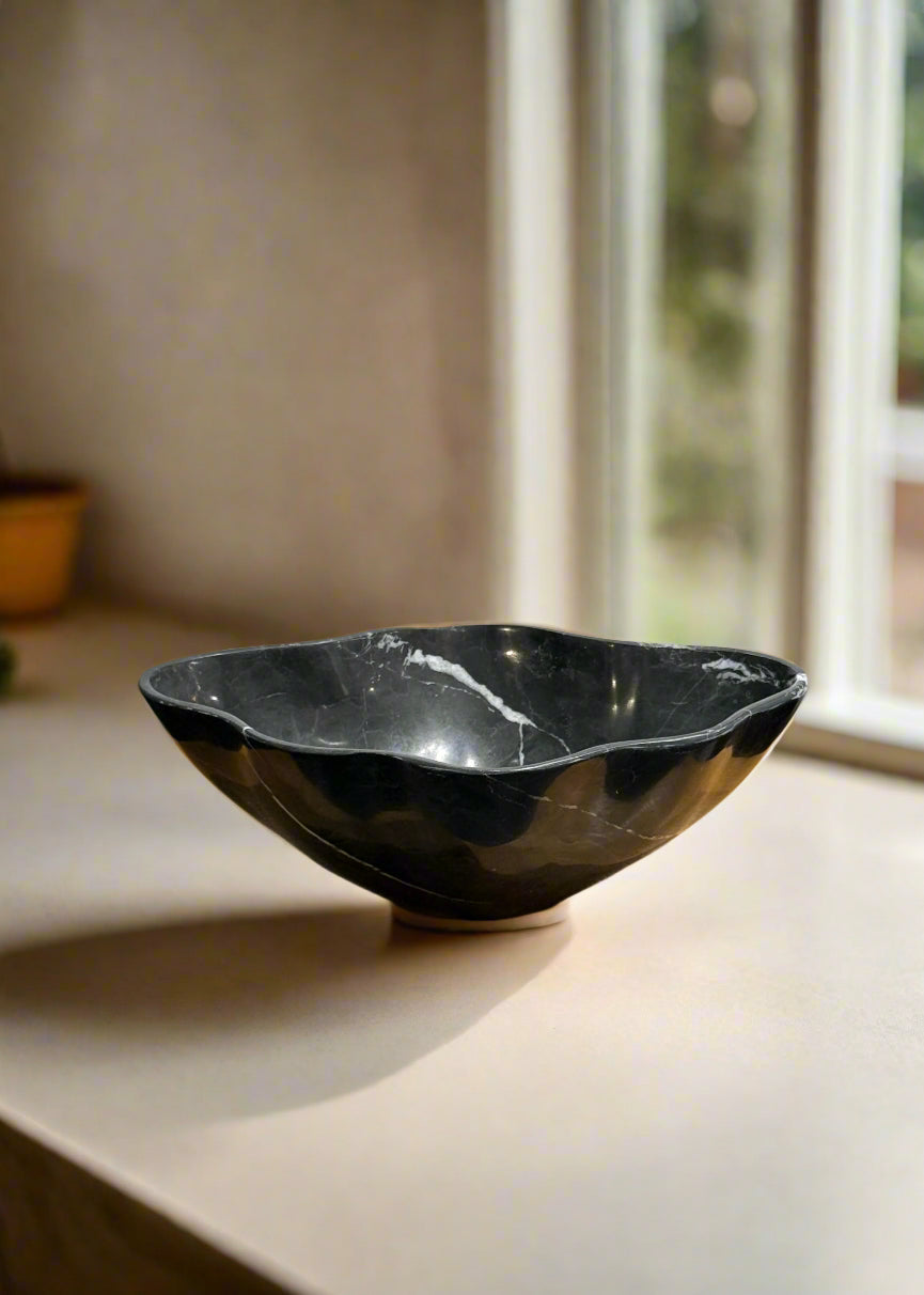 This elegant black marble bowl, sourced from Mexico, showcases the natural beauty and durability of premium marble. Its semi polished finish, smooth edge, and deep hues make it a refined centerpiece or functional accessory for any setting. Ideal for both decorative and practical use, this handcrafted piece combines timeless craftsmanship with lasting strength.