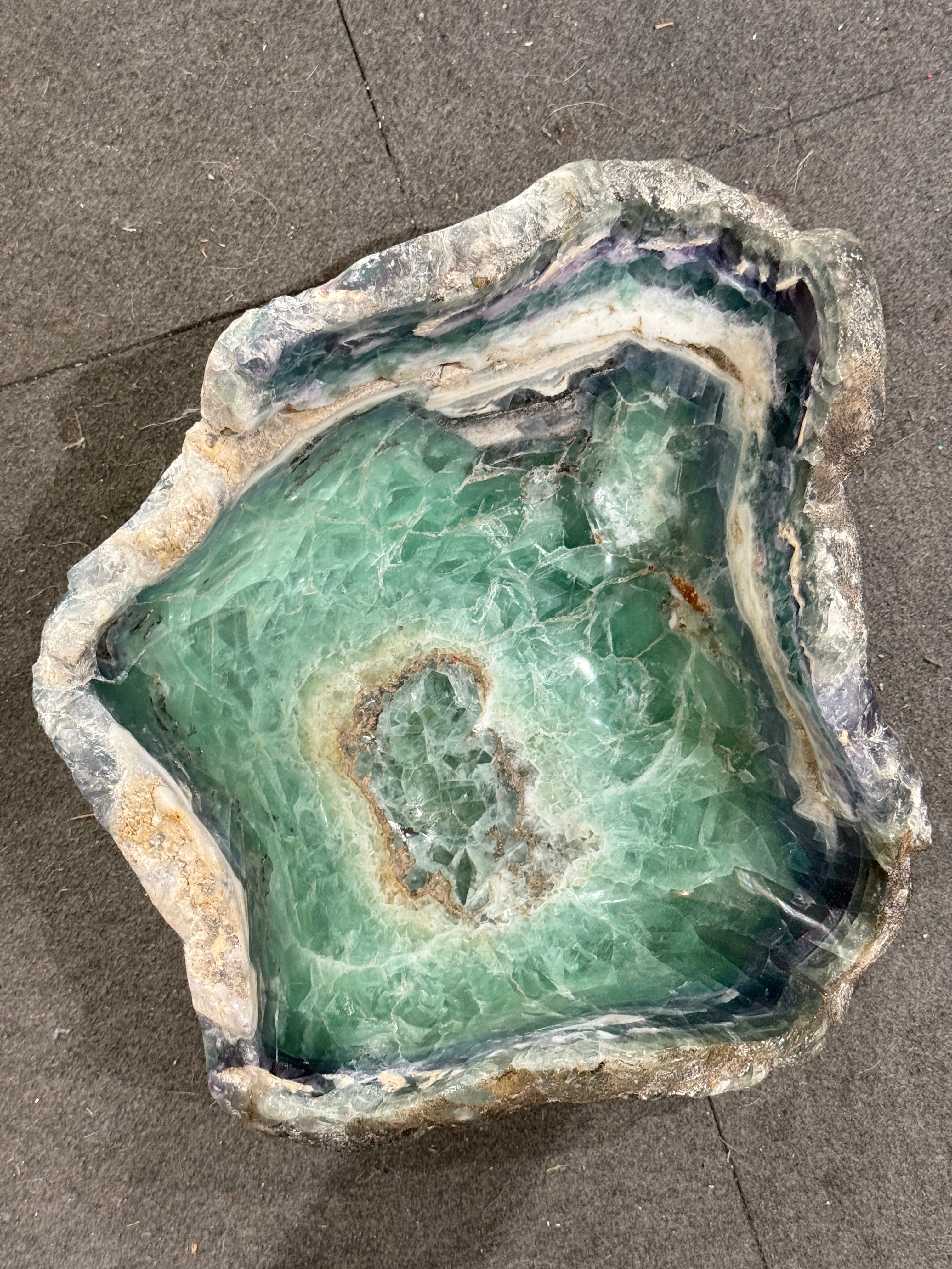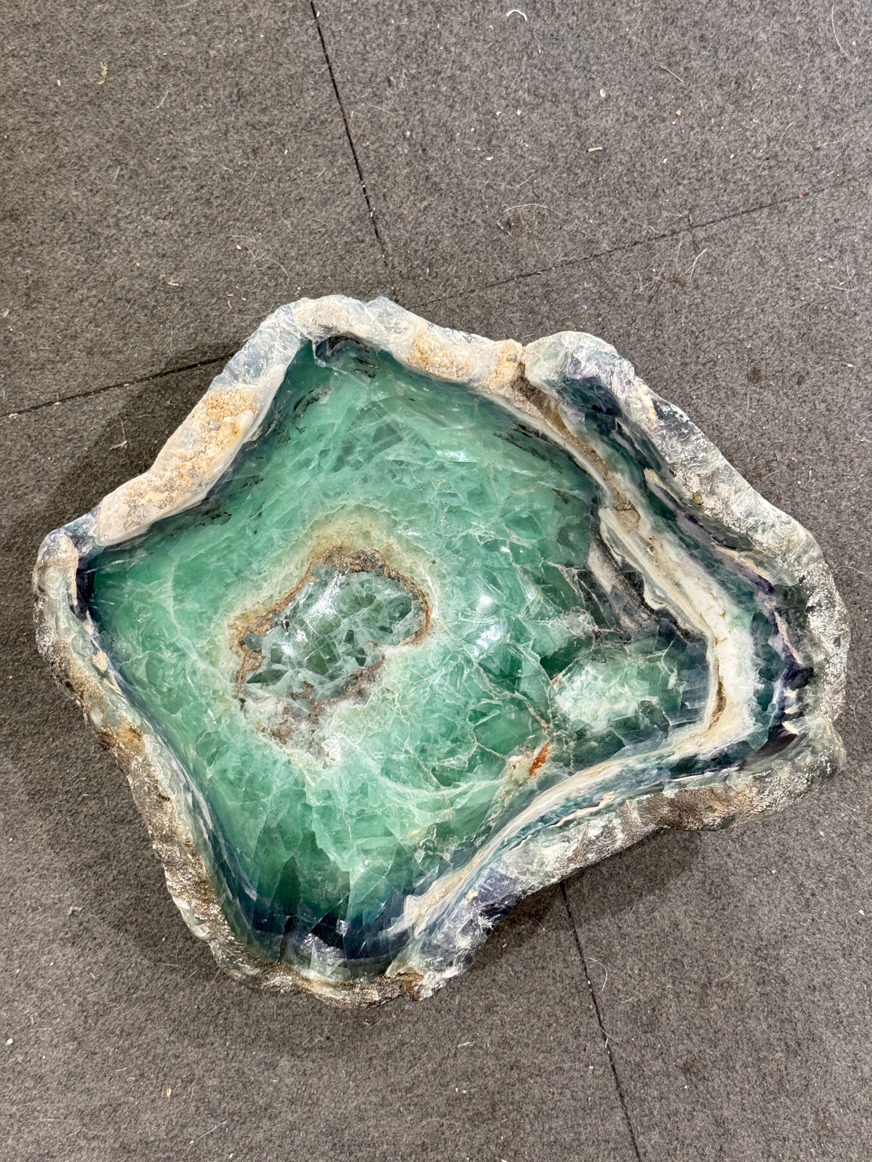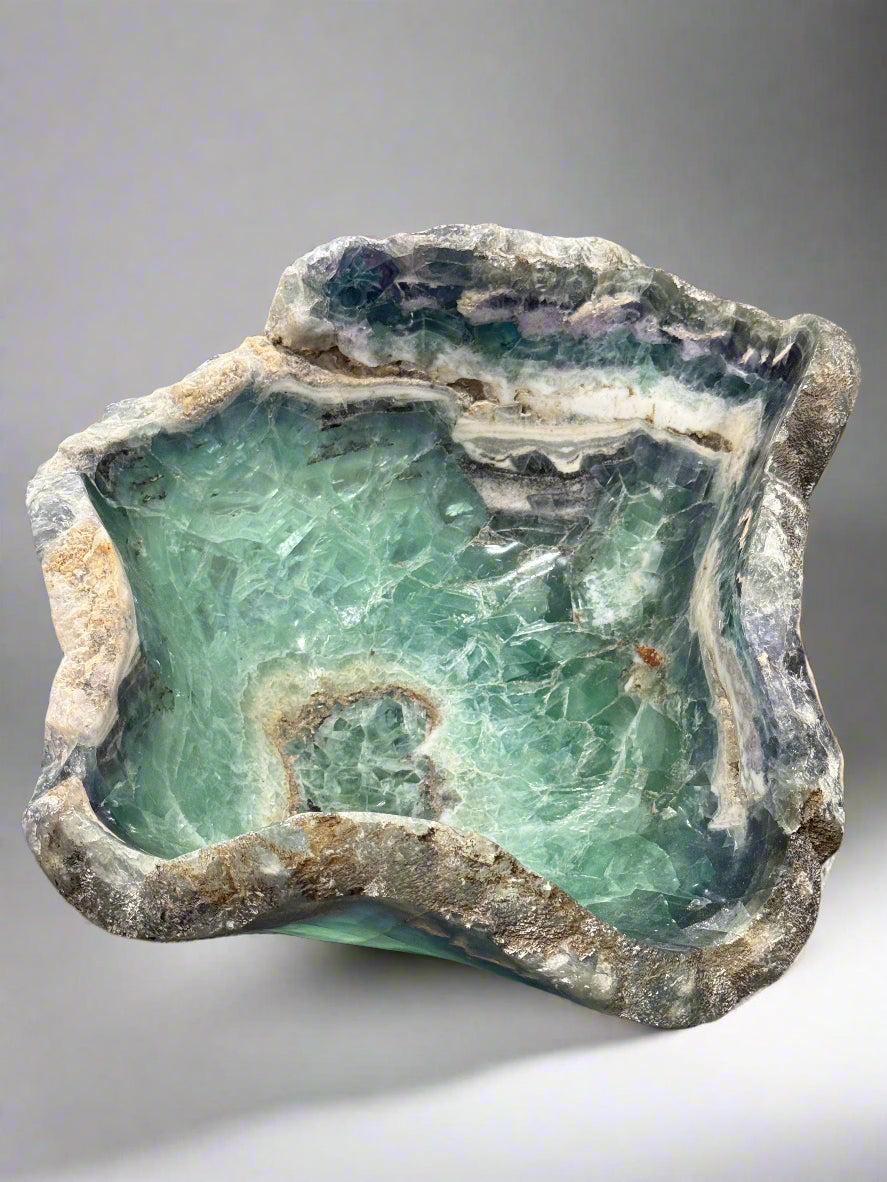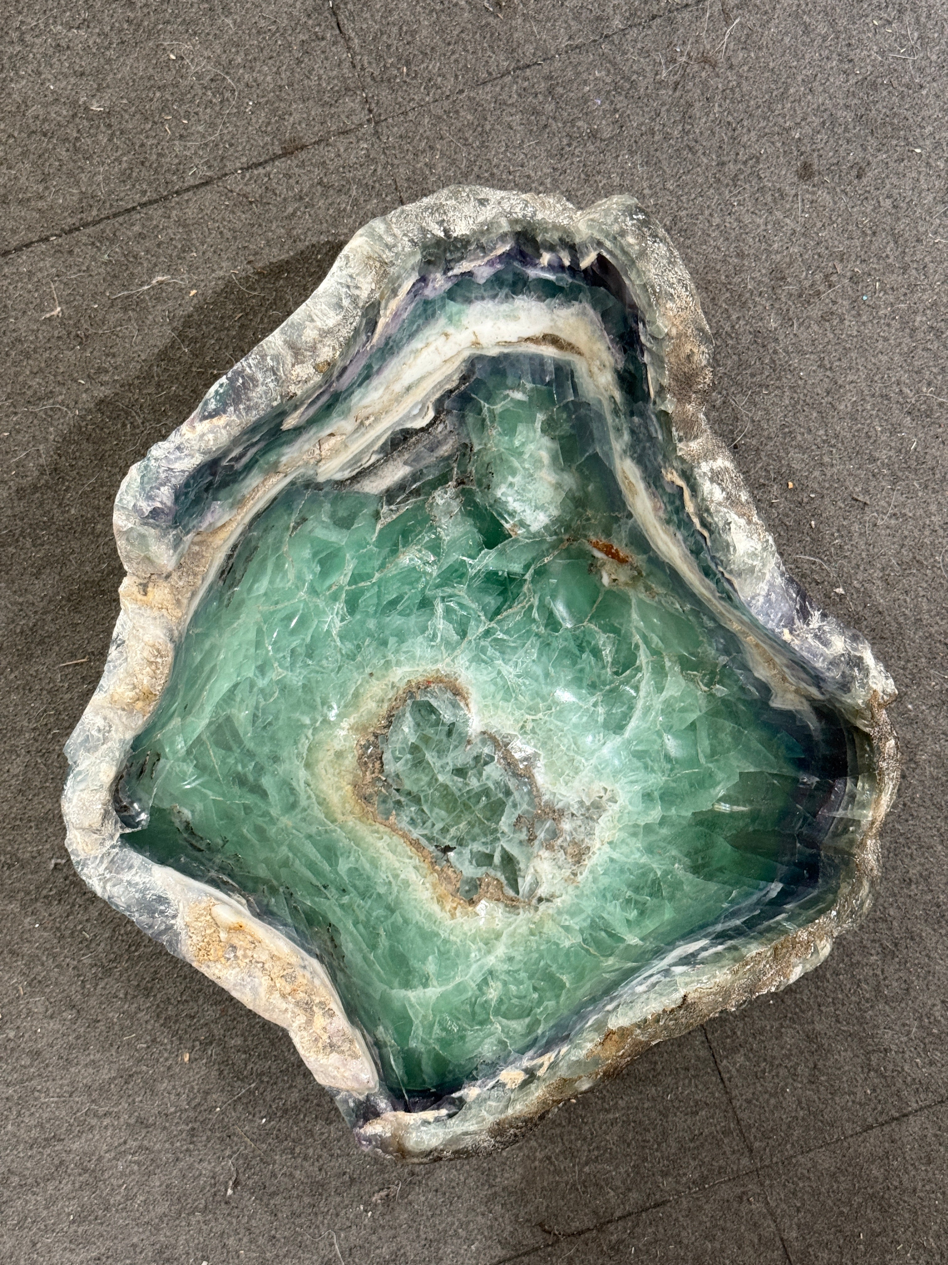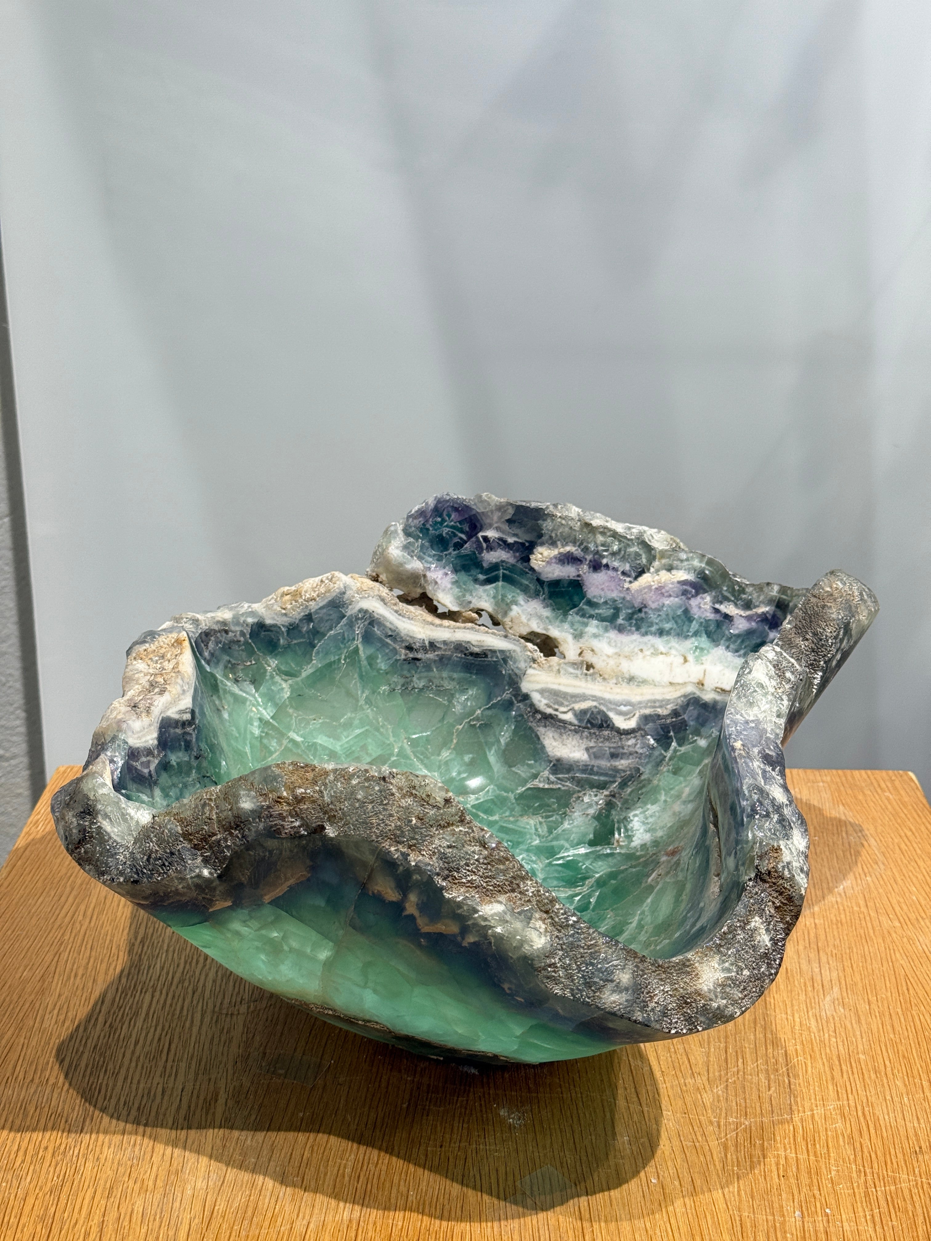 This Fluorite Bowl, sourced directly from Mexico, showcases the natural beauty and vibrant colors characteristic of high-quality fluorite. Expertly crafted to highlight the stone’s unique banding and translucency, it serves as both a functional piece and a striking decorative accent. Ideal for collectors and enthusiasts, this bowl combines mineralogical significance with artisanal craftsmanship.