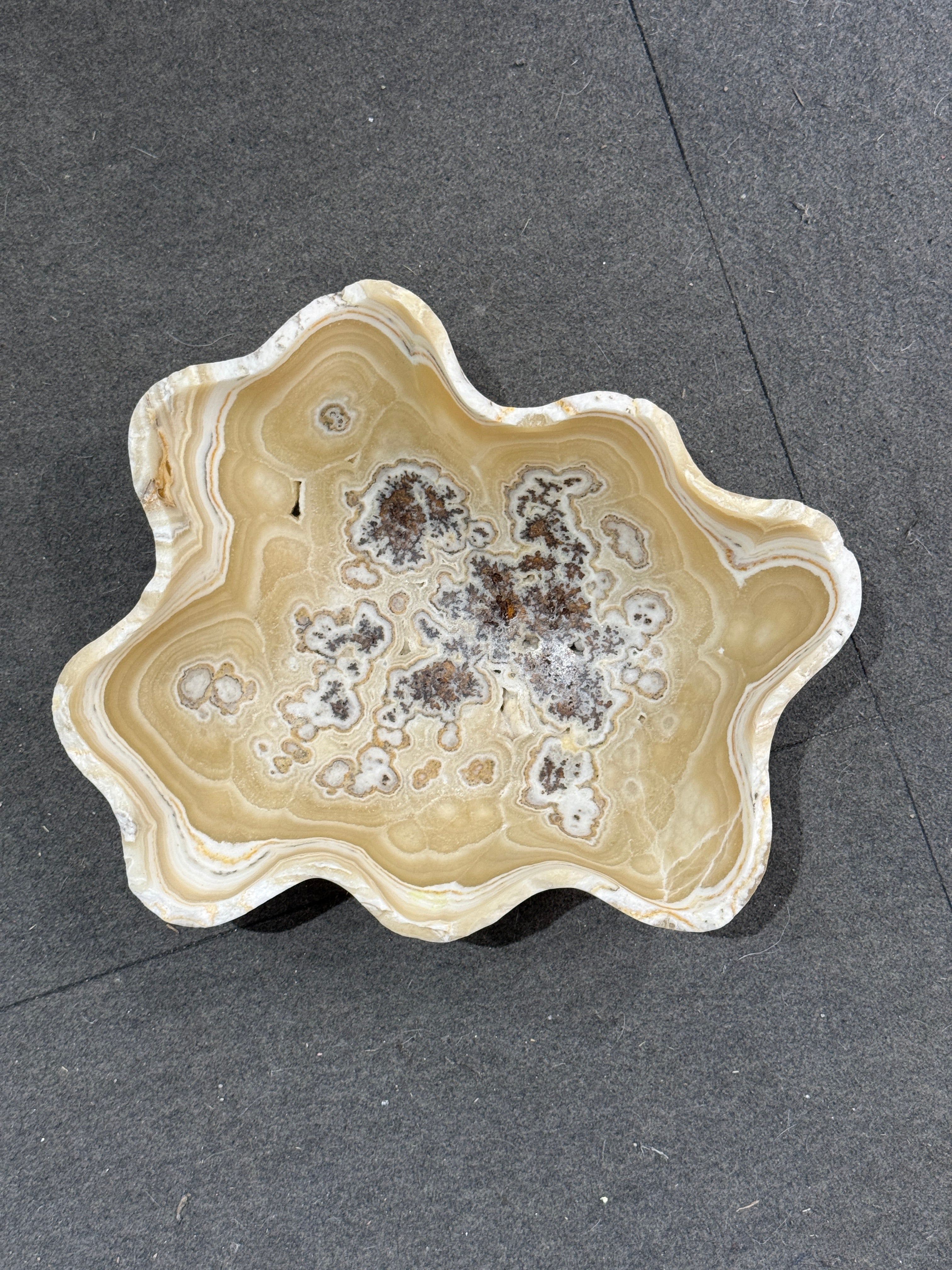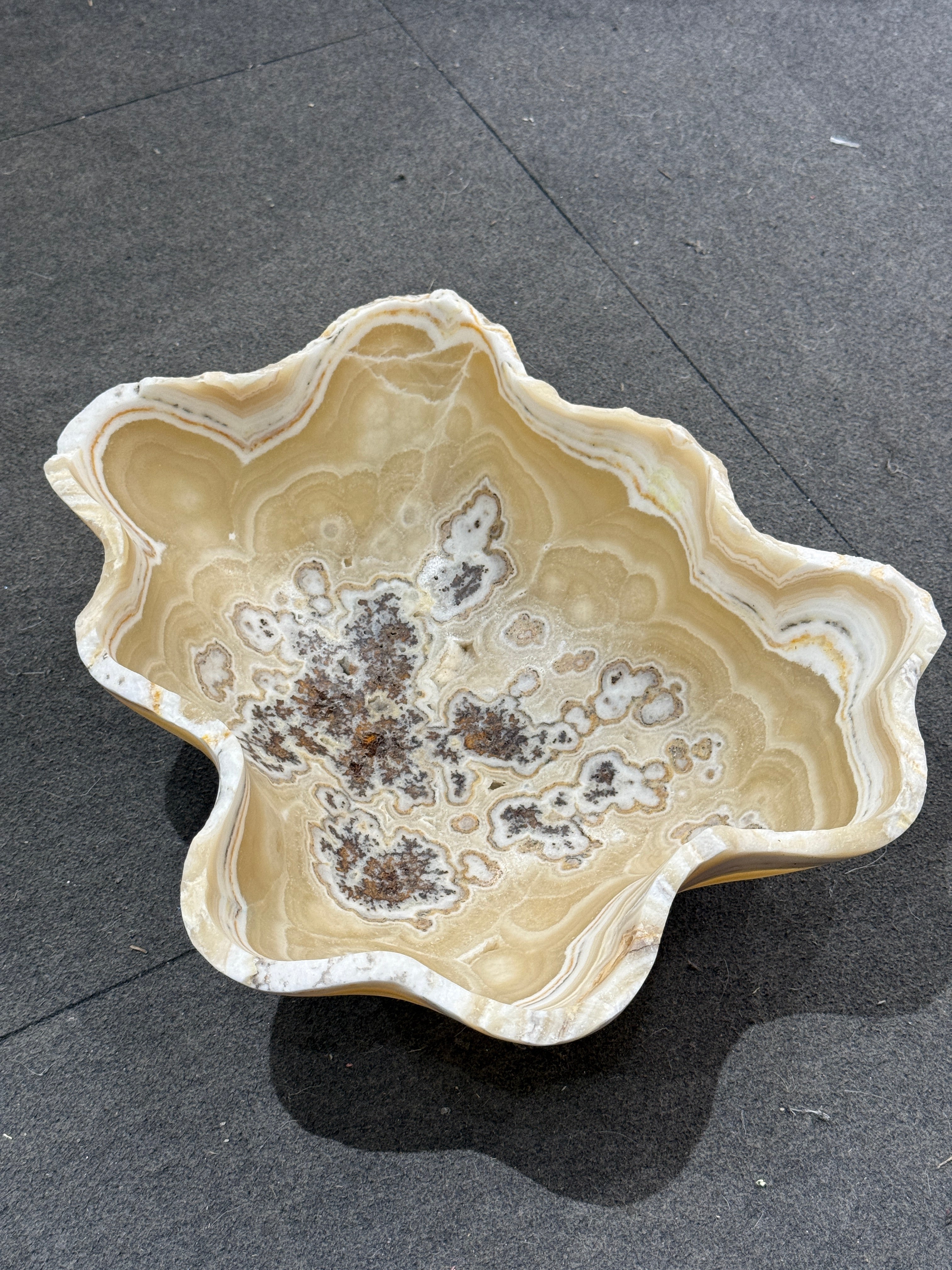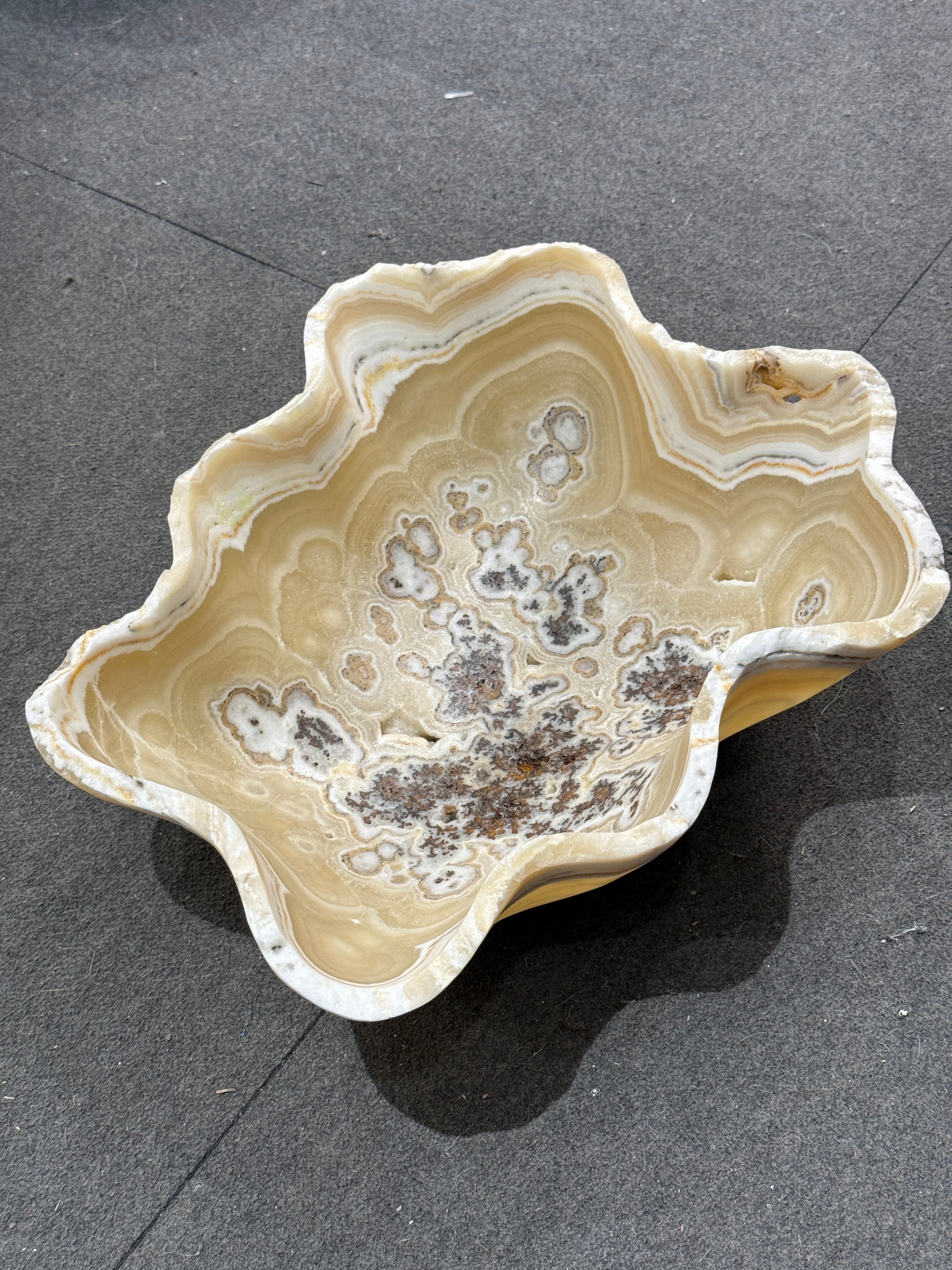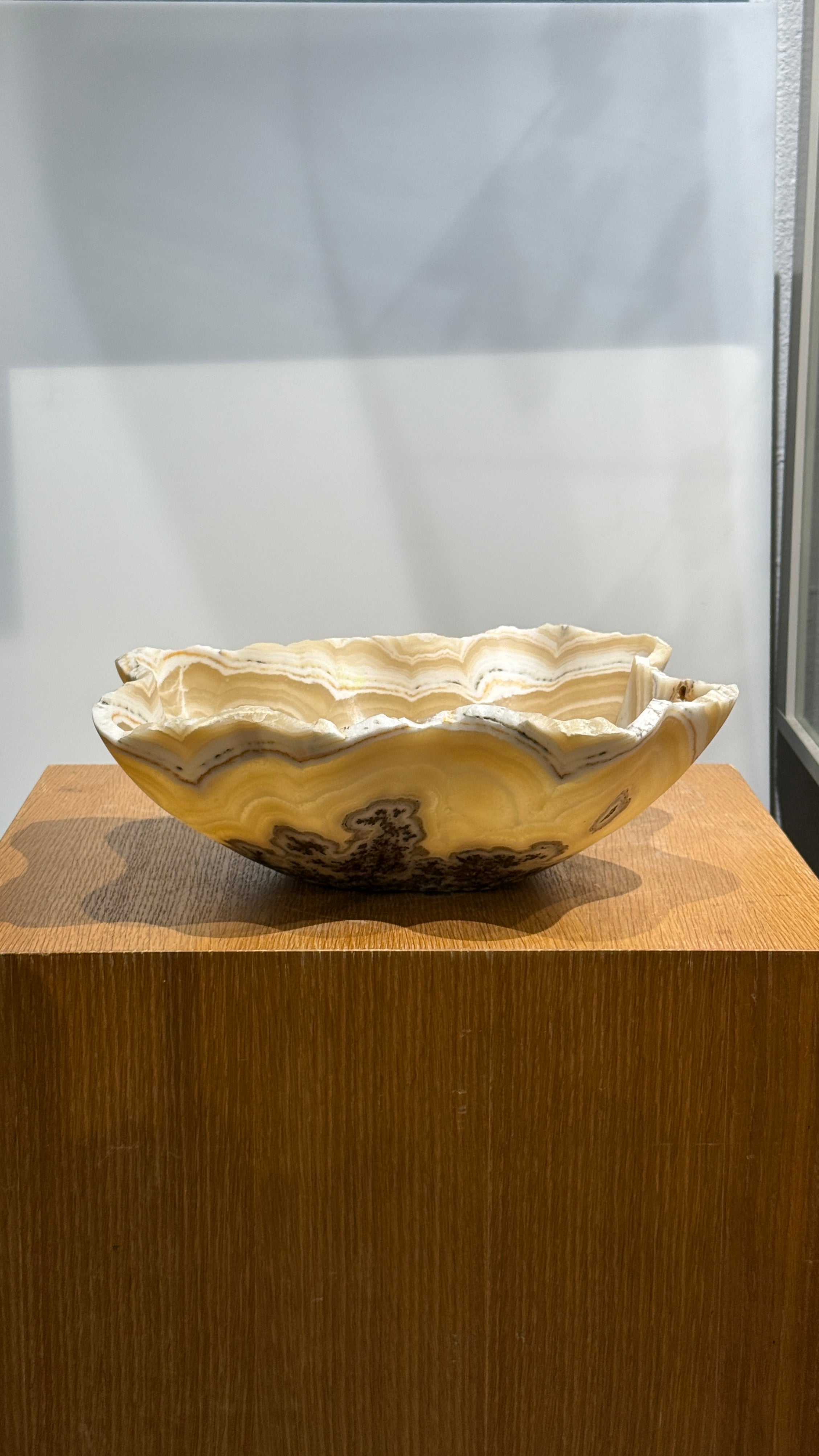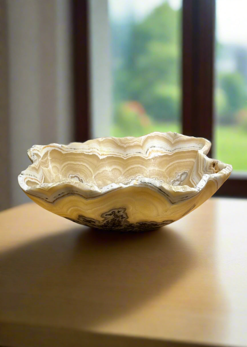 Crafted from exquisite beige colored Onyx sourced in Mexico, this bowl features distinctive brown inclusions that add depth and natural character. Its unique patterns, matte finish and live edge make it a sophisticated centerpiece, perfect for showcasing fine decor or serving purposes, combining artisan craftsmanship with the inherent beauty of stone.