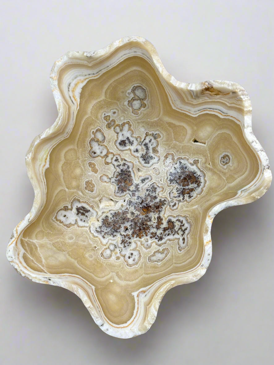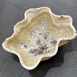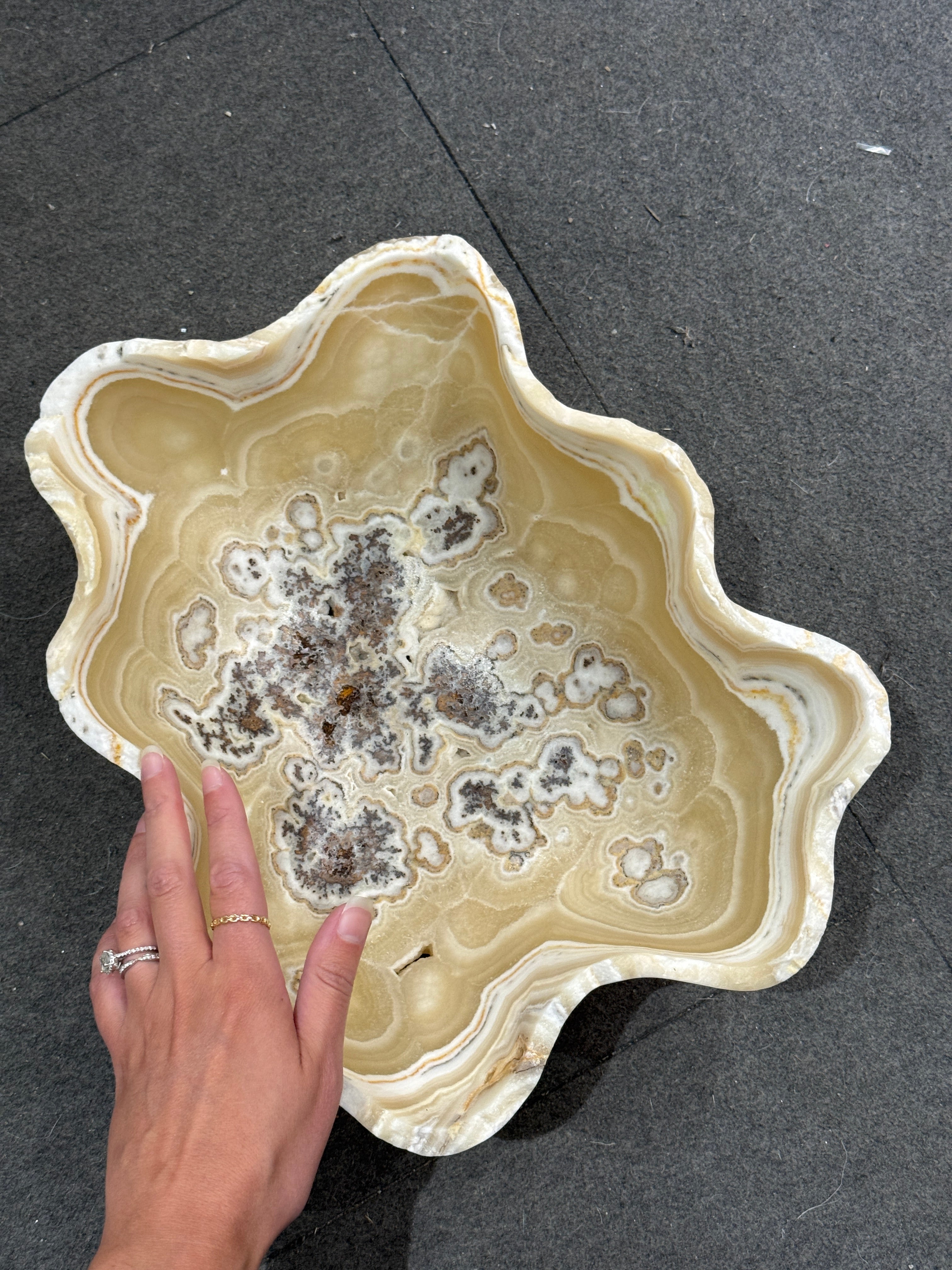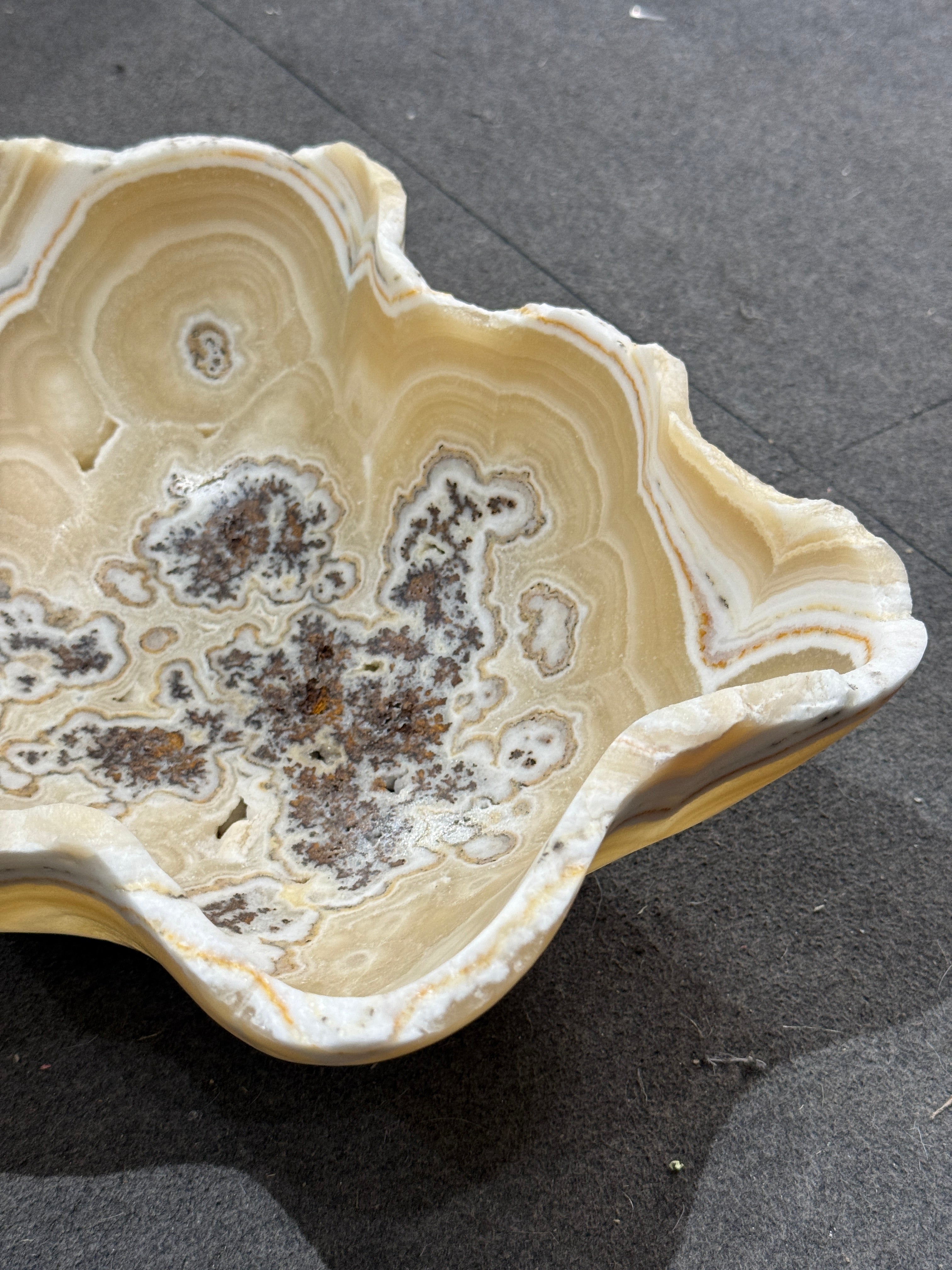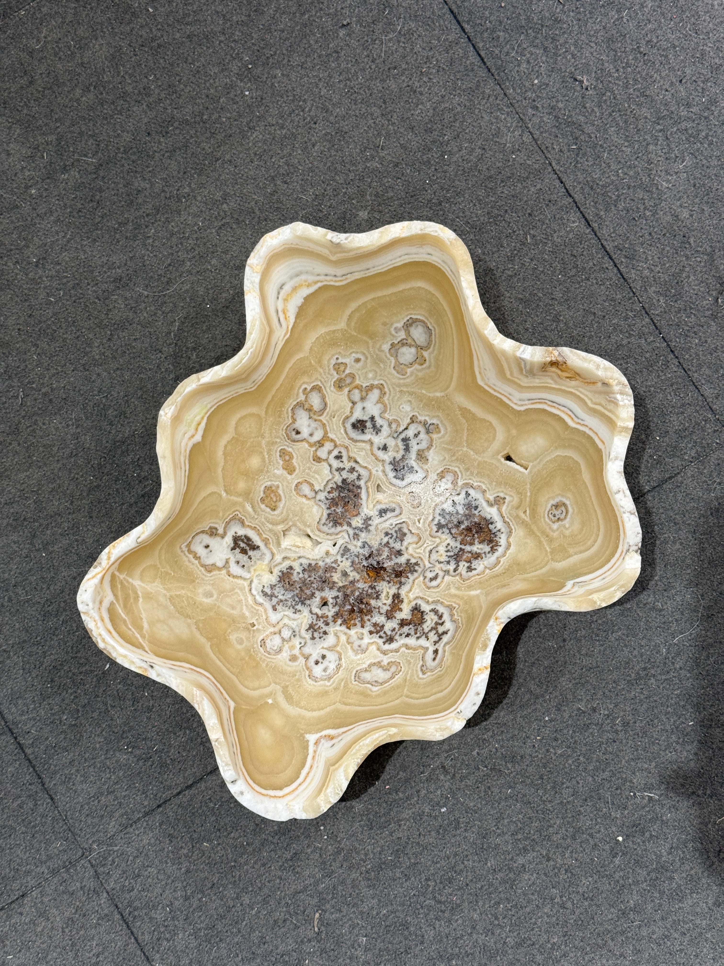 Crafted from exquisite beige colored Onyx sourced in Mexico, this bowl features distinctive brown inclusions that add depth and natural character. Its unique patterns, matte finish and live edge make it a sophisticated centerpiece, perfect for showcasing fine decor or serving purposes, combining artisan craftsmanship with the inherent beauty of stone.