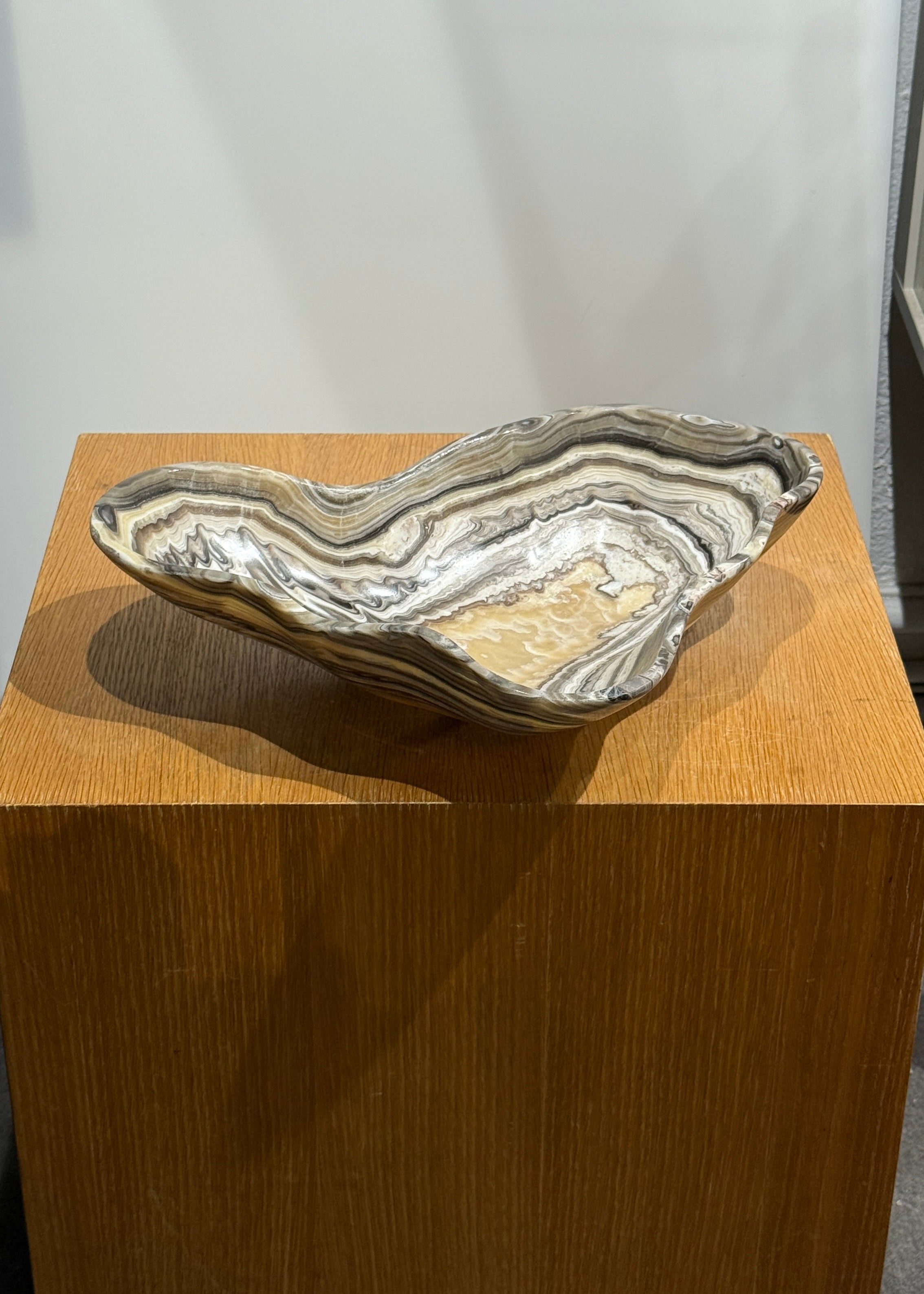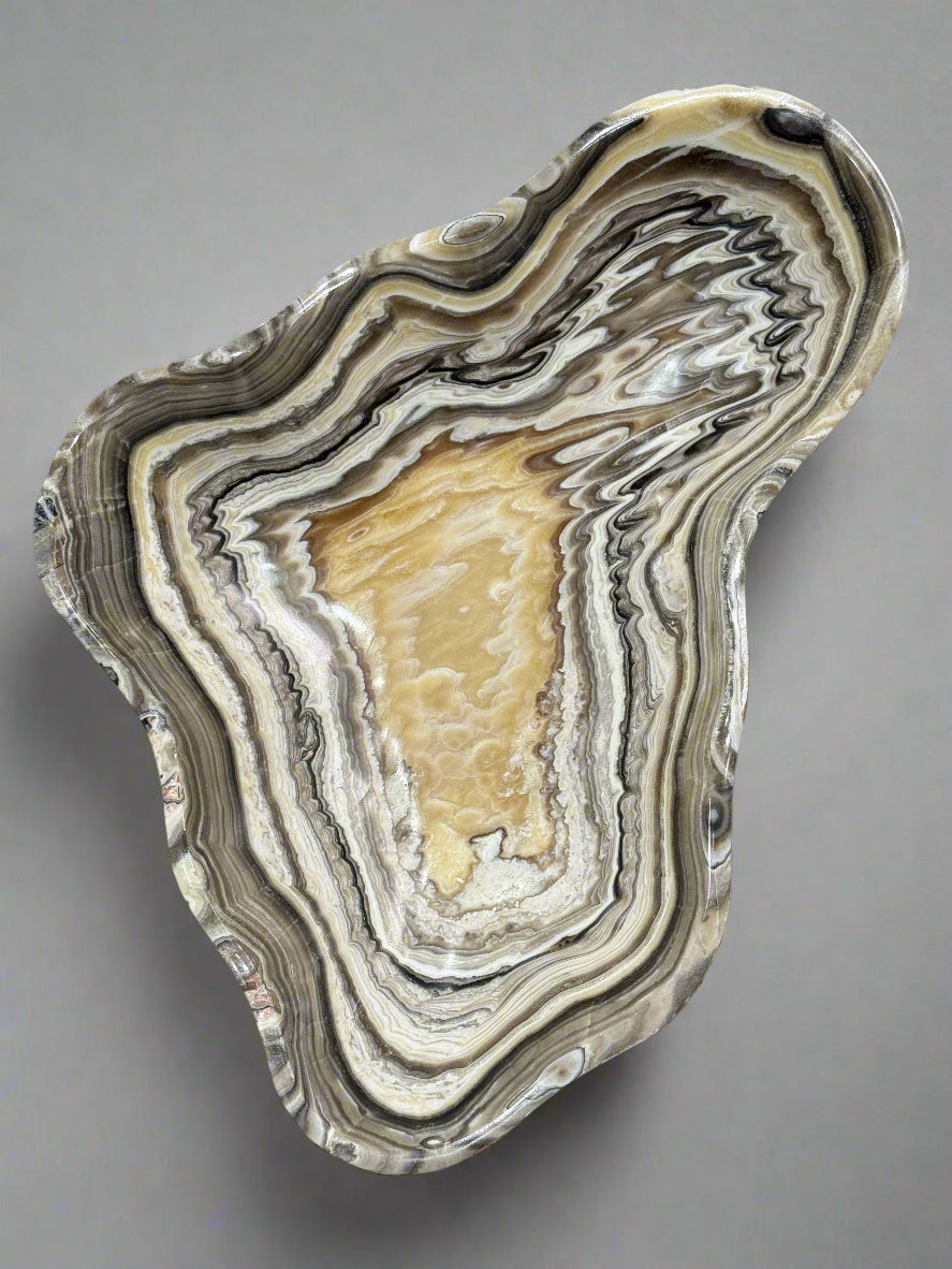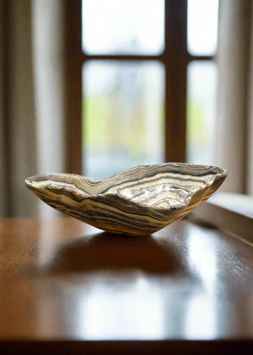 Crafted in Mexico, this grey and gold multi striped Onyx Bowl with a polished finish and a smooth edge showcases natural stone artistry with its unique banding of grey and gold hues. Each bowl is hand-carved, highlighting the distinctive veining and color contrasts inherent to onyx. Perfect for sophisticated decor settings, it serves as both a functional piece and an elegant accent that reflects expert craftsmanship and natural beauty.