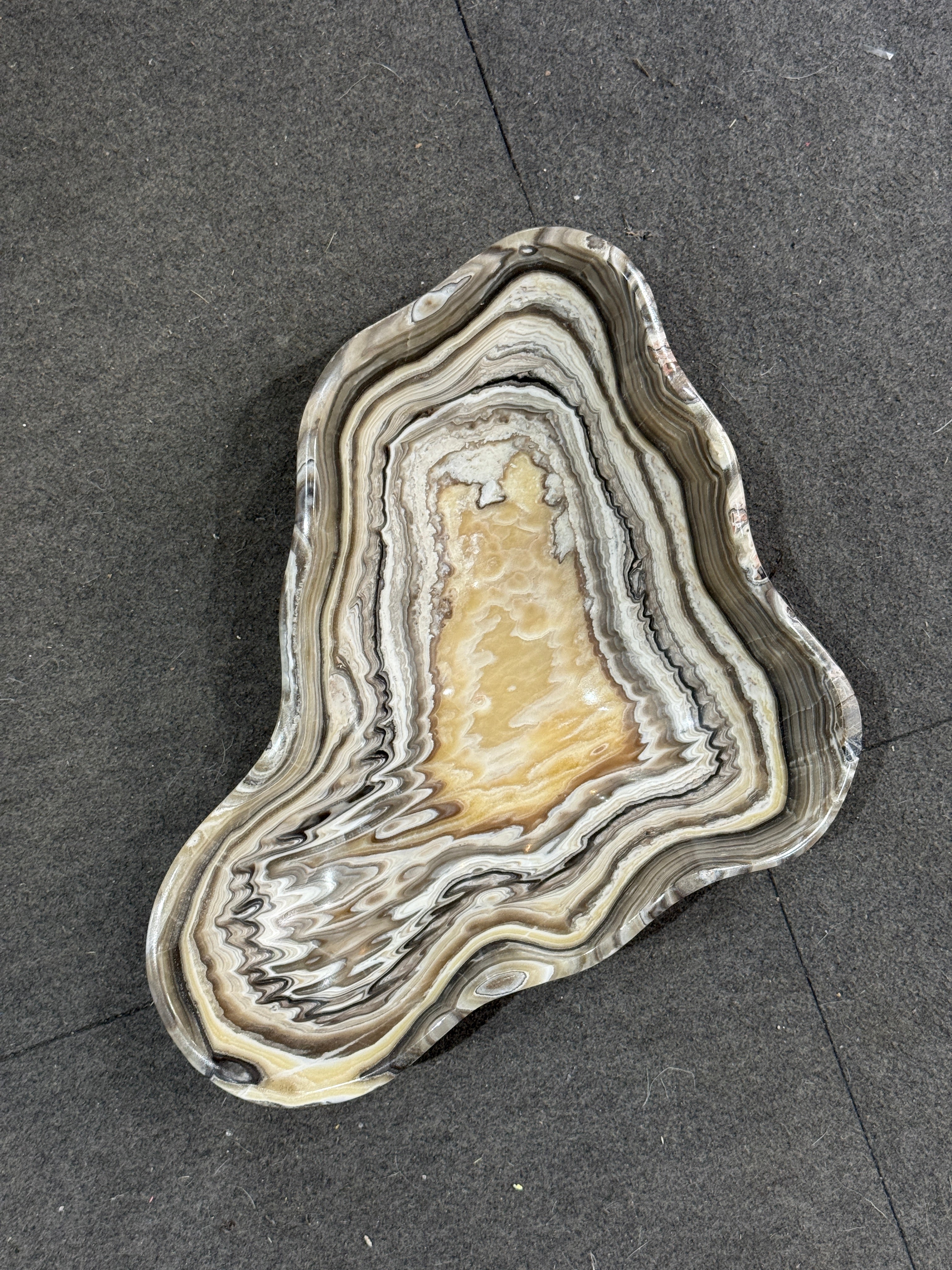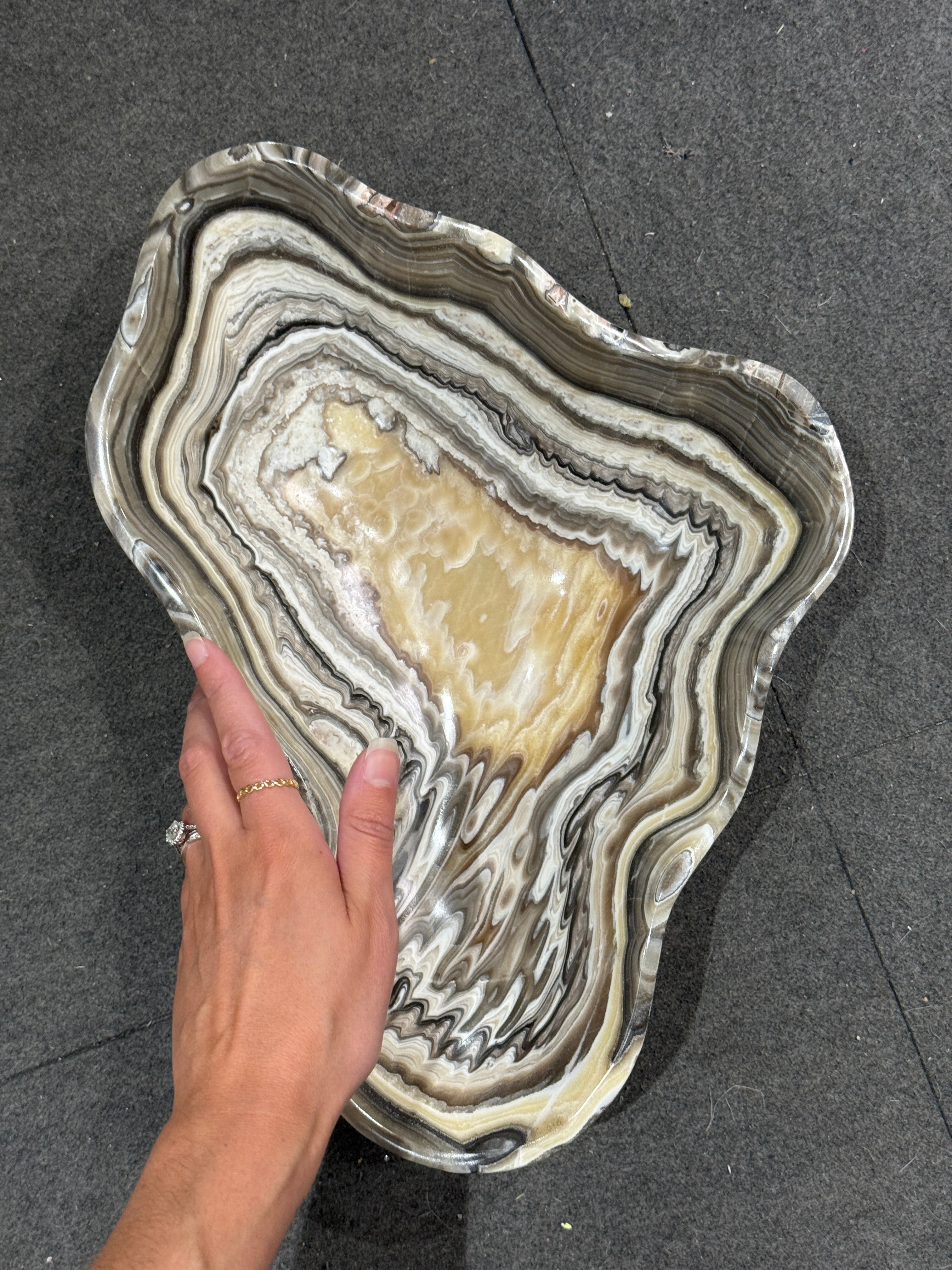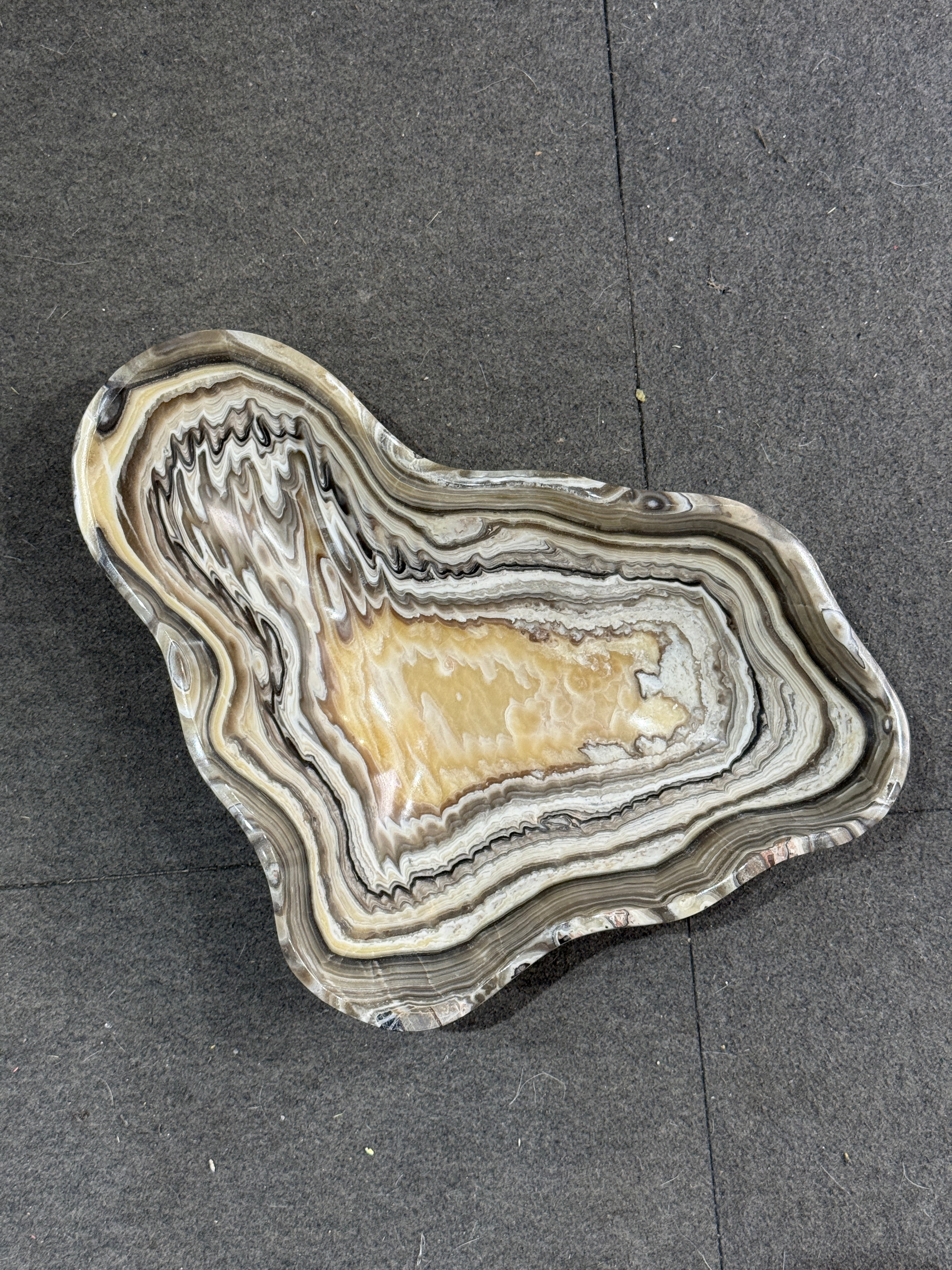 Crafted in Mexico, this grey and gold multi striped Onyx Bowl with a polished finish and a smooth edge showcases natural stone artistry with its unique banding of grey and gold hues. Each bowl is hand-carved, highlighting the distinctive veining and color contrasts inherent to onyx. Perfect for sophisticated decor settings, it serves as both a functional piece and an elegant accent that reflects expert craftsmanship and natural beauty.