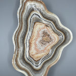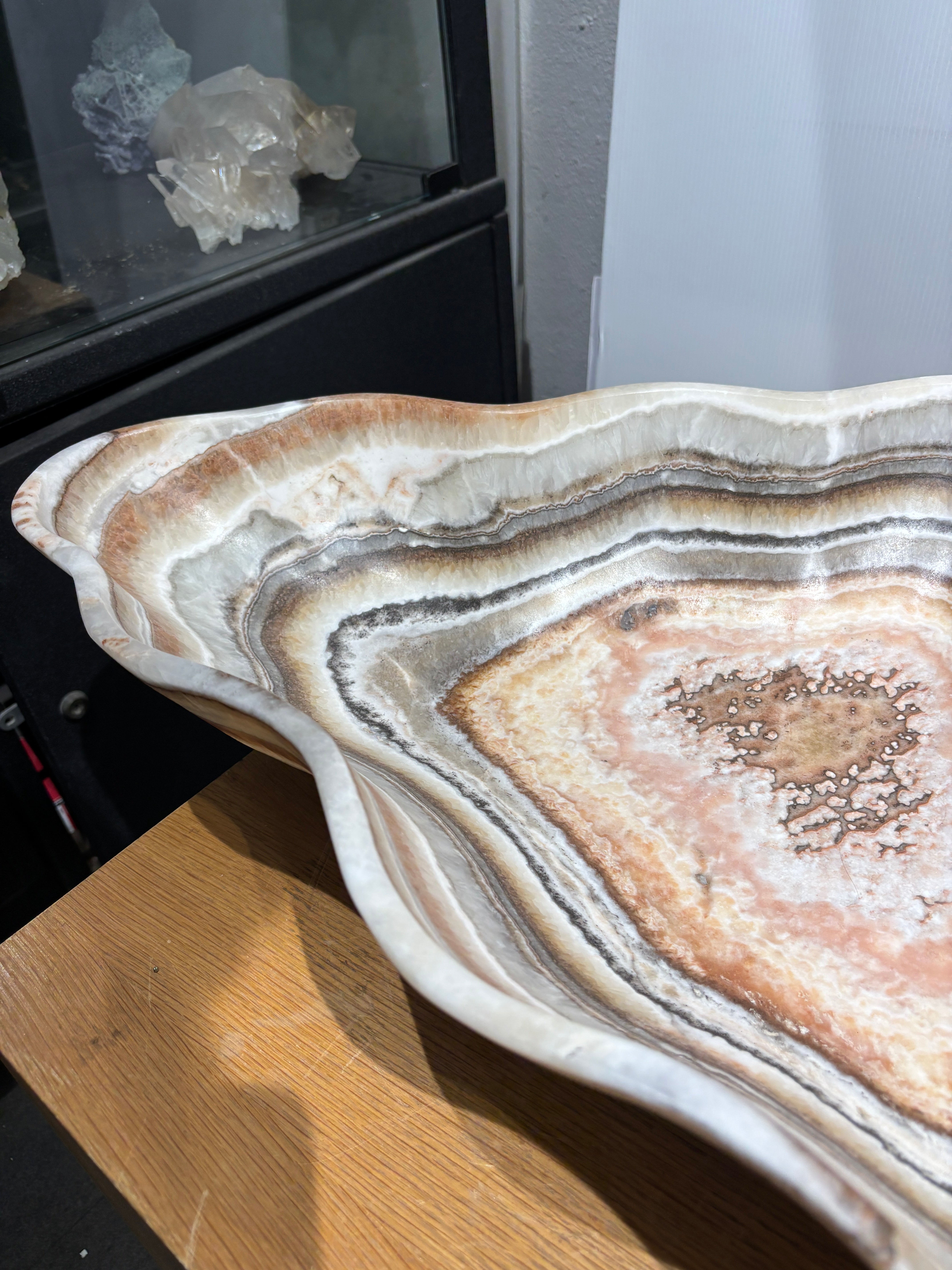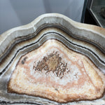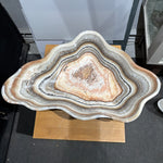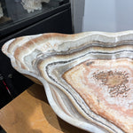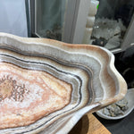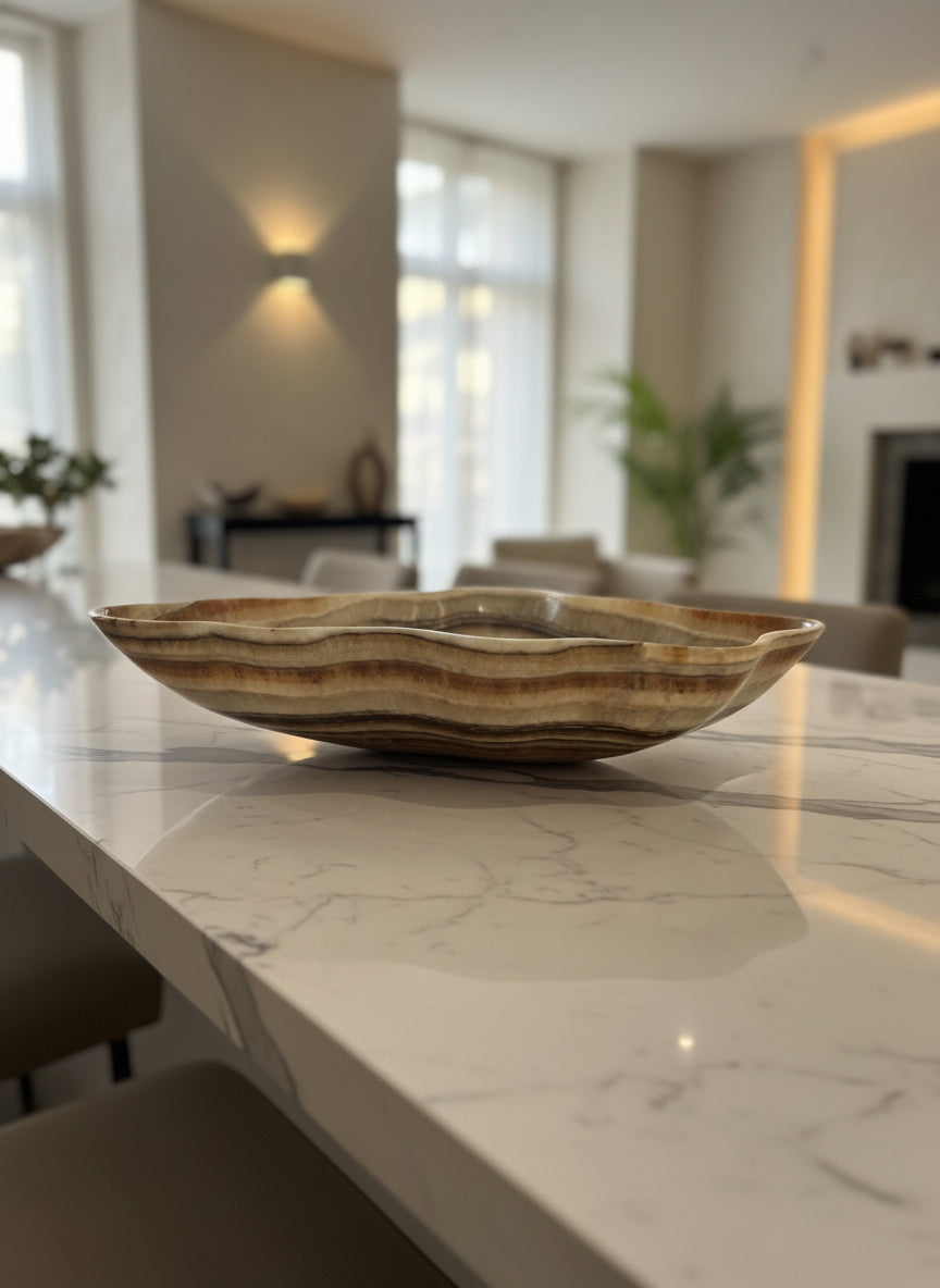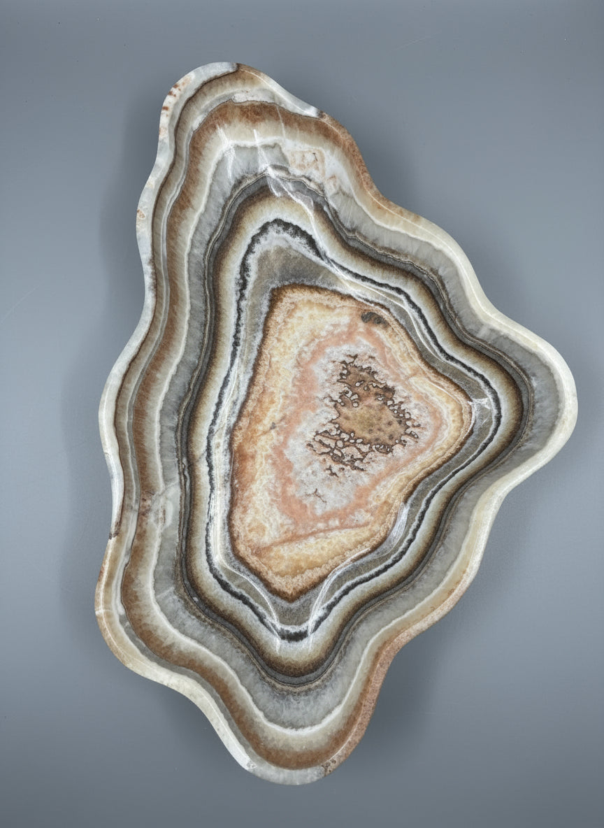 This striking onyx (banded calcite) bowl showcases natural salmon and gray banding that creates a sophisticated visual depth. Hand-carved from premium onyx stone, the piece features a refined matte finish that enhances the subtle color variations and mineral patterns inherent to the material. The smooth, polished interior contrasts beautifully with the textured exterior, making it an ideal accent for contemporary or transitional interiors. Perfect as a decorative centerpiece or functional vessel, this bowl demonstrates the timeless elegance of natural stone craftsmanship.