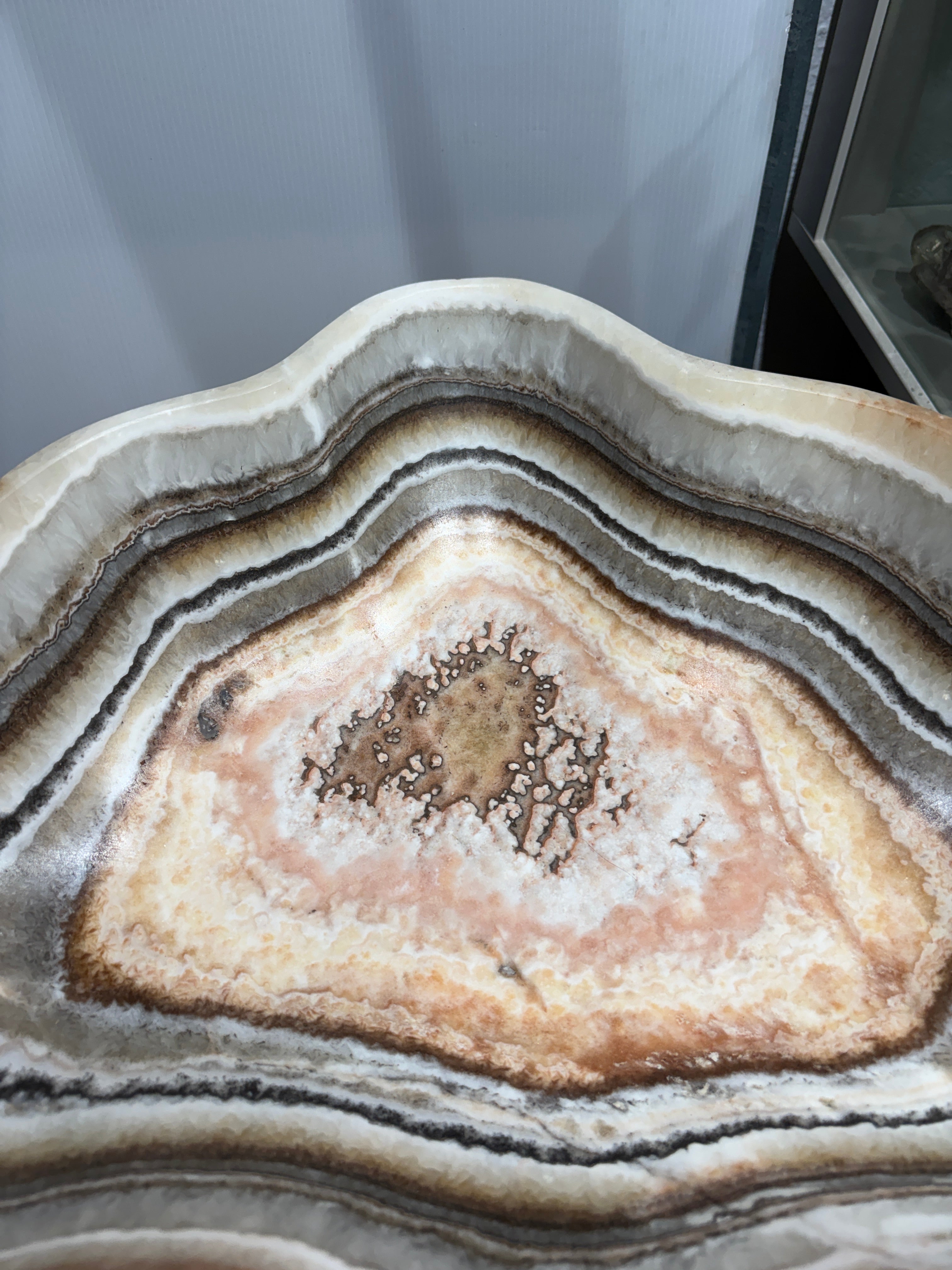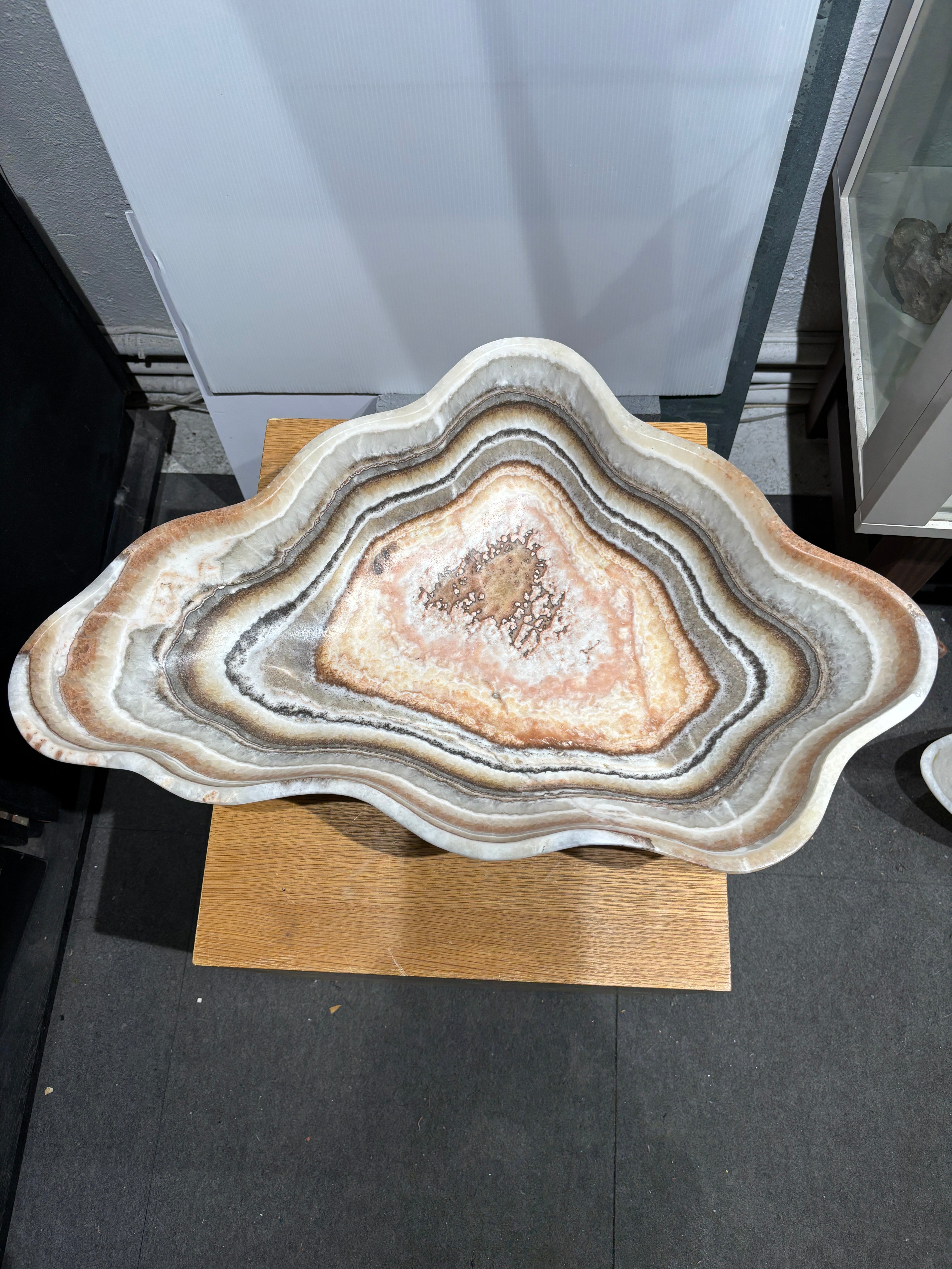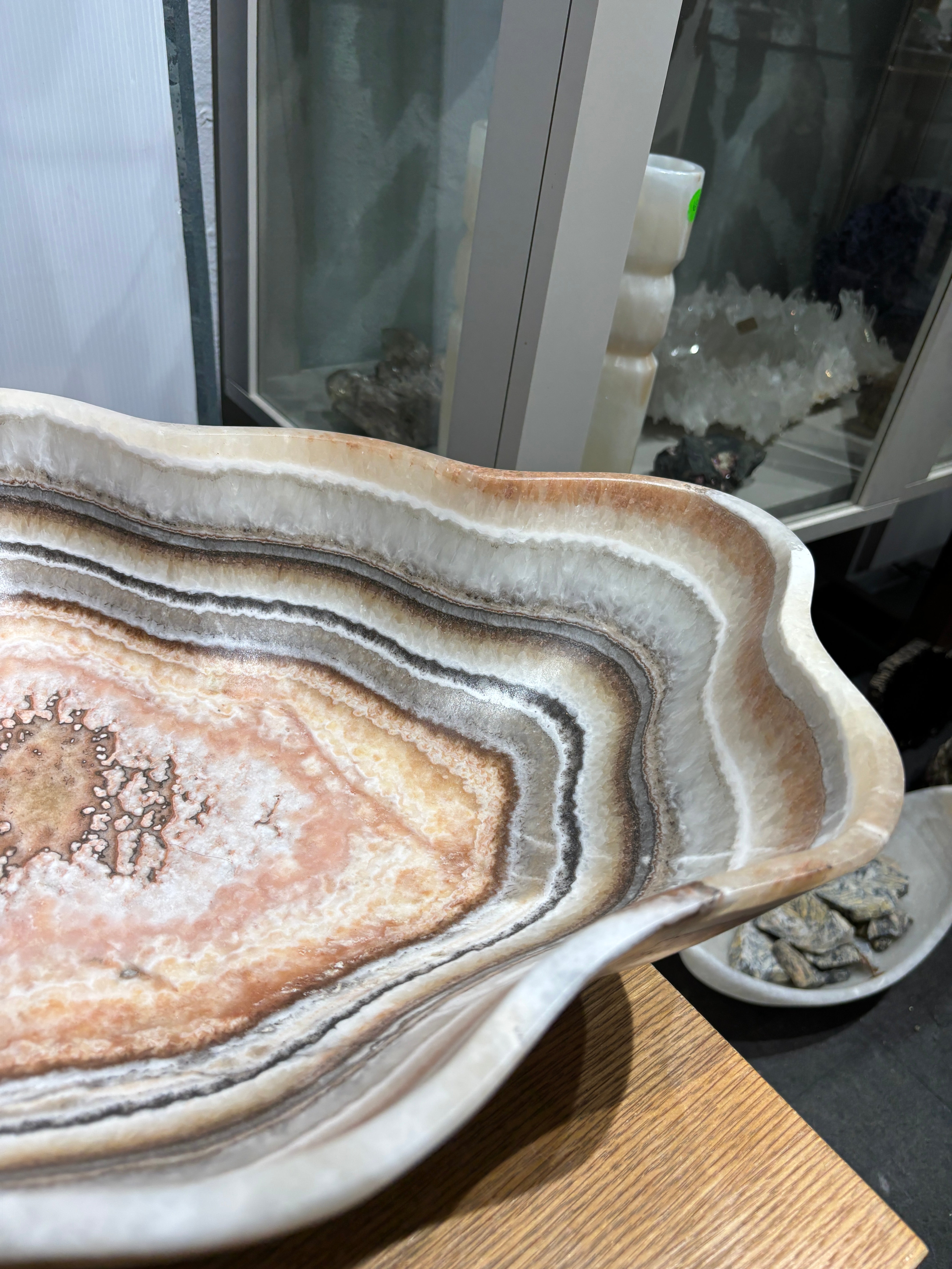 This striking onyx (banded calcite) bowl showcases natural salmon and gray banding that creates a sophisticated visual depth. Hand-carved from premium onyx stone, the piece features a refined matte finish that enhances the subtle color variations and mineral patterns inherent to the material. The smooth, polished interior contrasts beautifully with the textured exterior, making it an ideal accent for contemporary or transitional interiors. Perfect as a decorative centerpiece or functional vessel, this bowl demonstrates the timeless elegance of natural stone craftsmanship.
