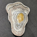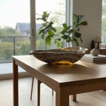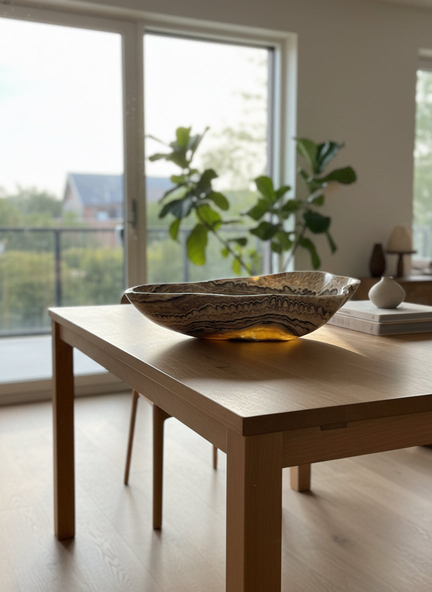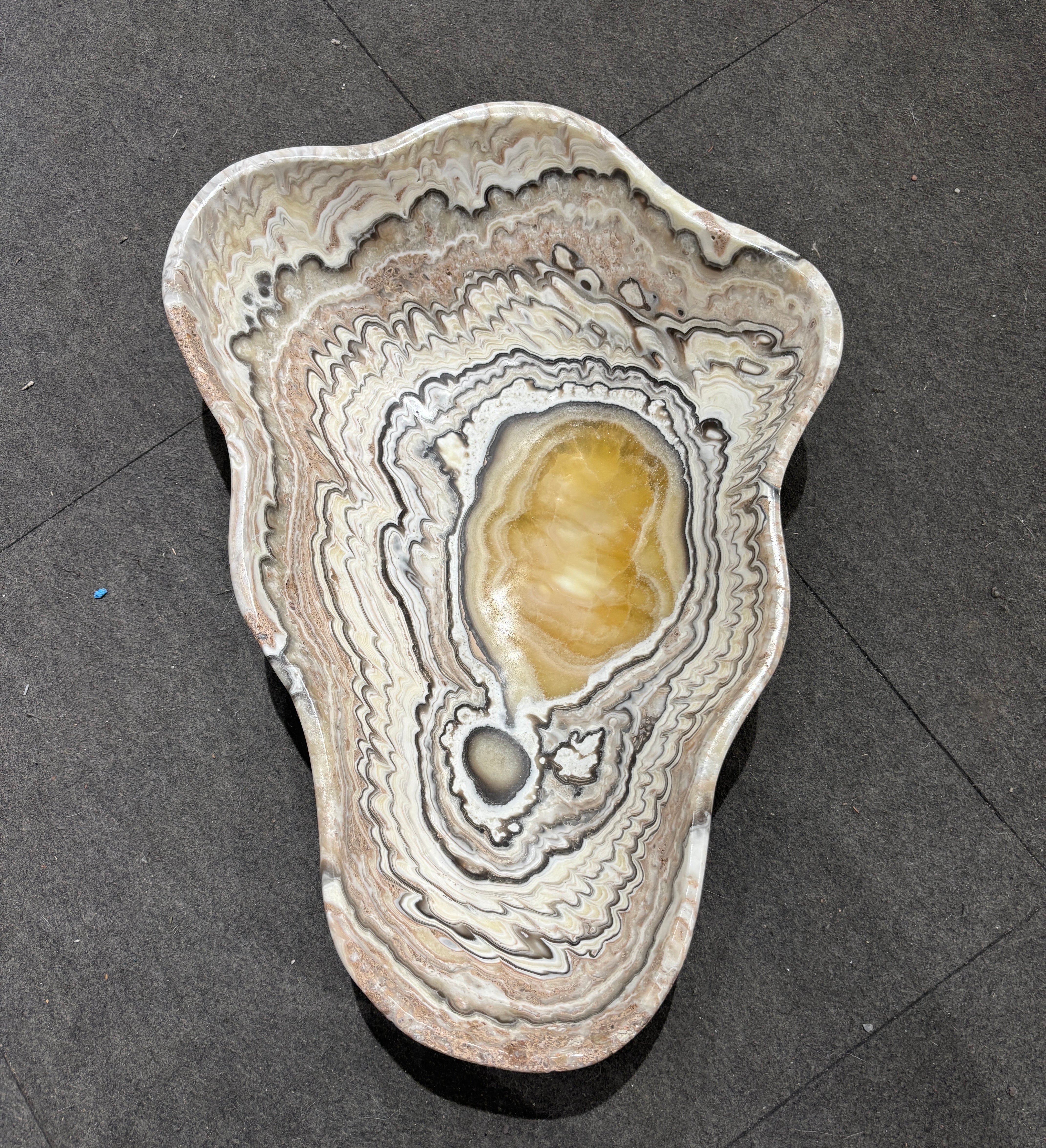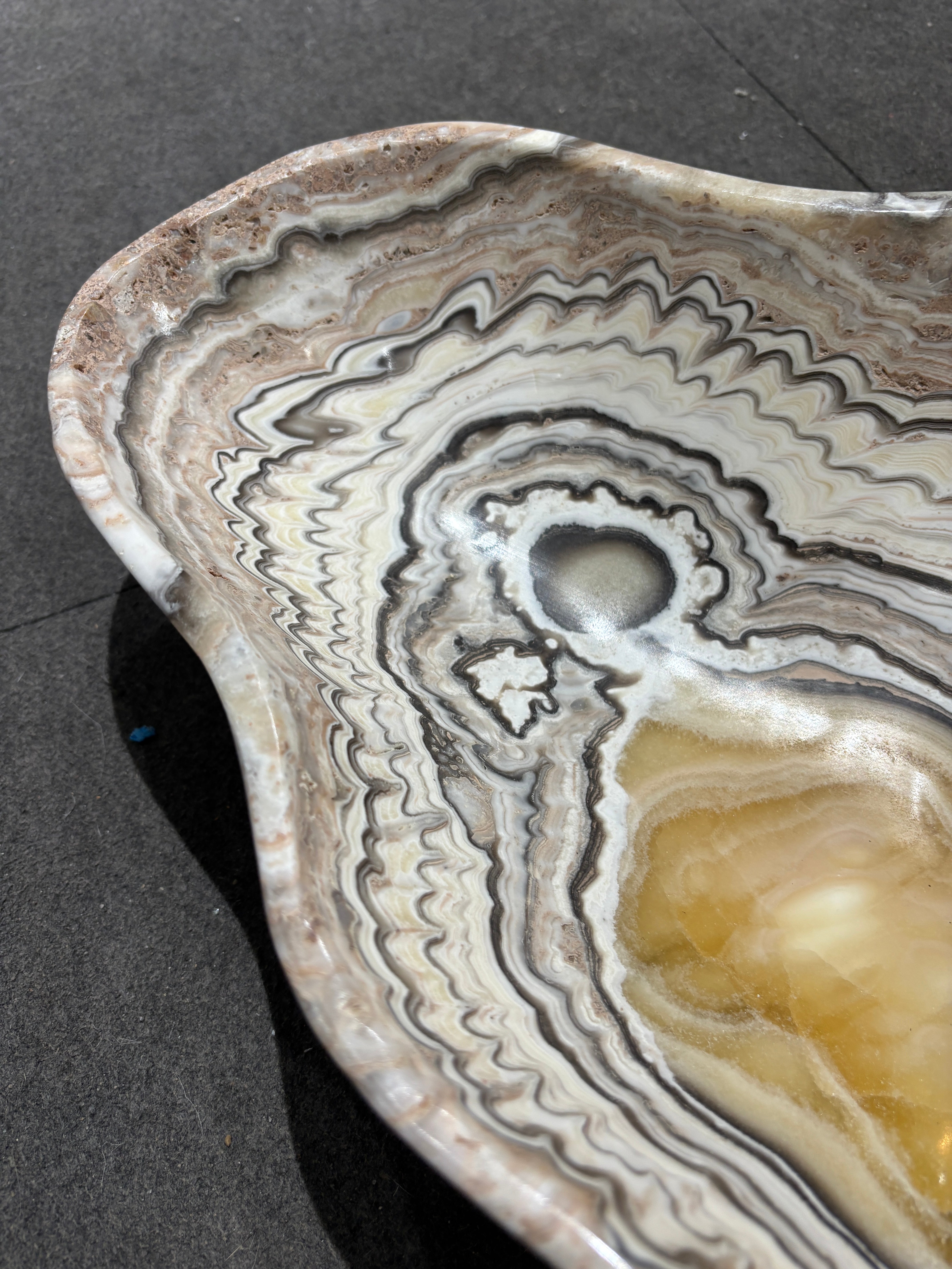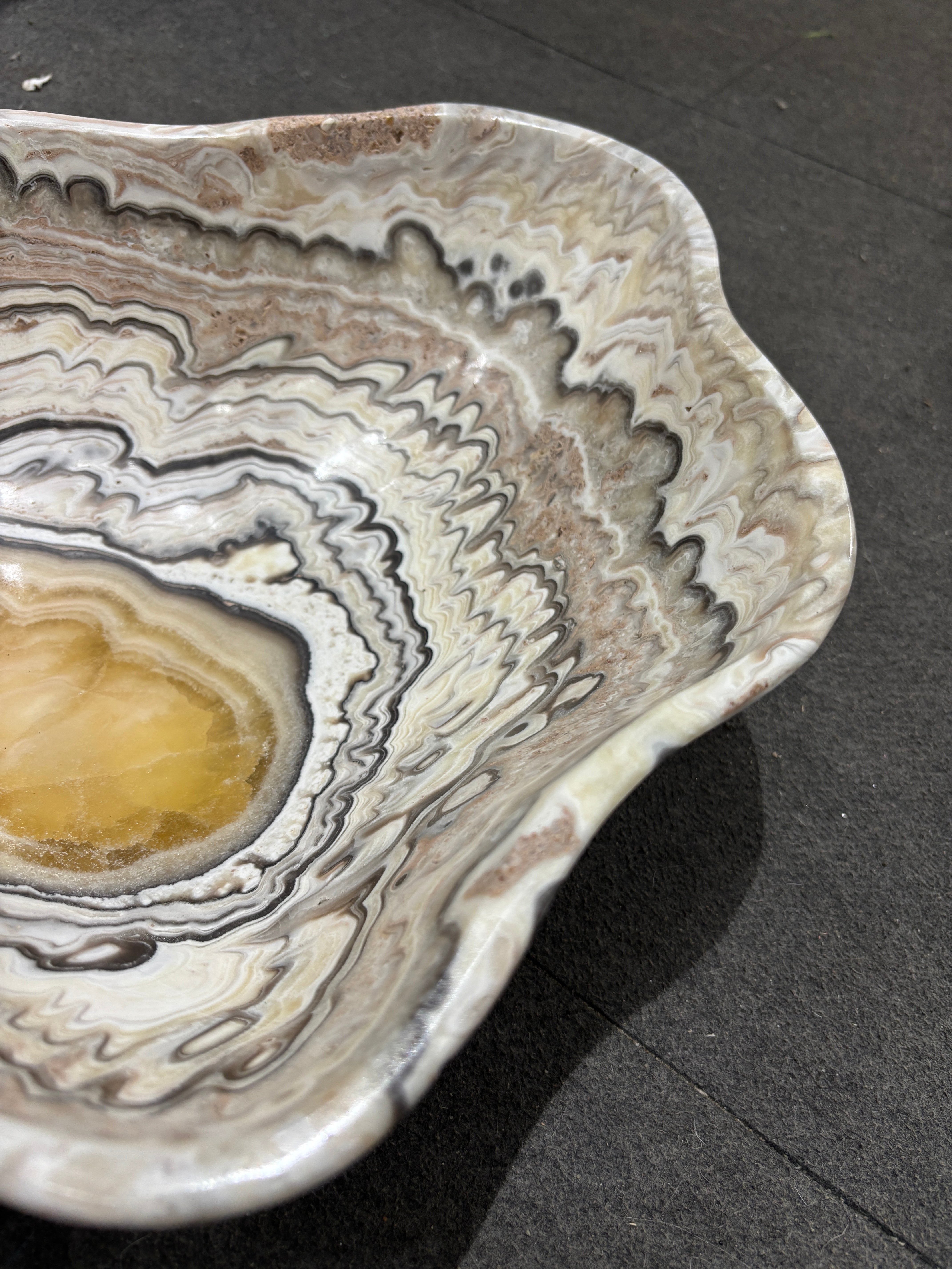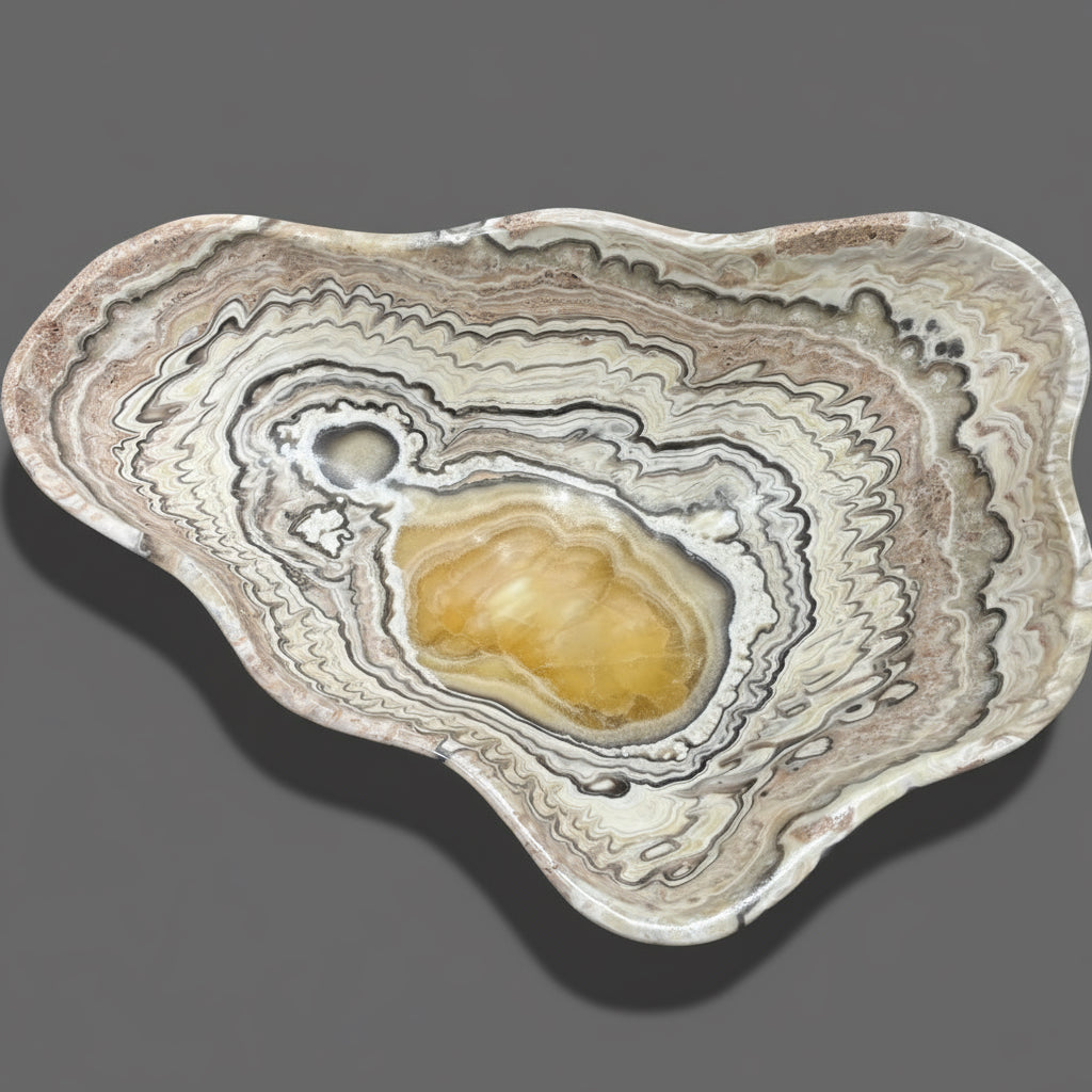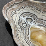 This distinct onyx (banded calcite) bowl showcases a distinctive tiger-striped banded pattern that creates dramatic visual contrast. Handcrafted in Mexico, each piece features a polished finish that enhances the natural veining and brings out the stone's rich depth and luster. The smooth, refined surface makes it an ideal decorative accent for contemporary or eclectic interiors, while the unique striping ensures no two bowls are identical. A sophisticated addition to any collection of natural stone pieces.