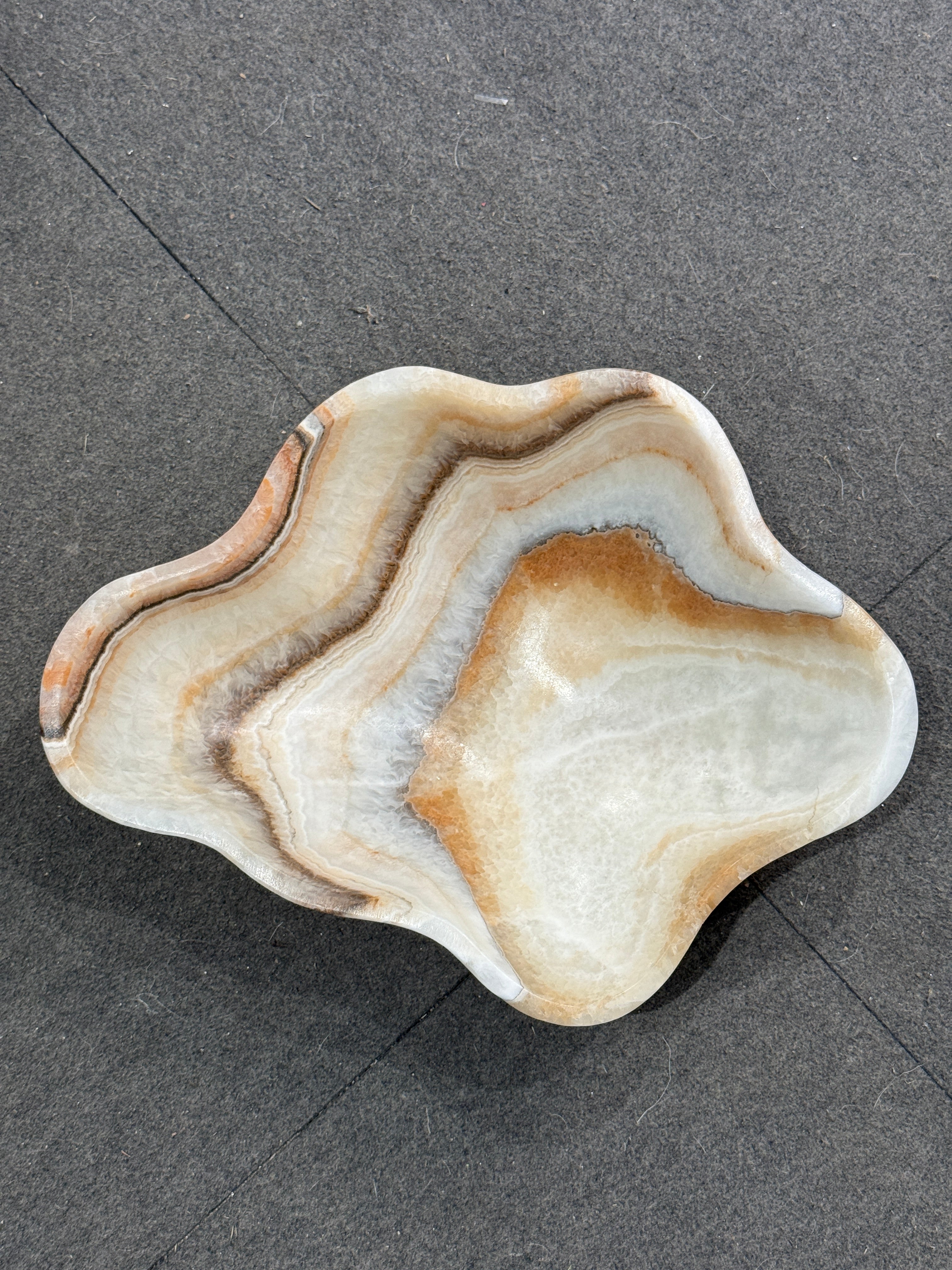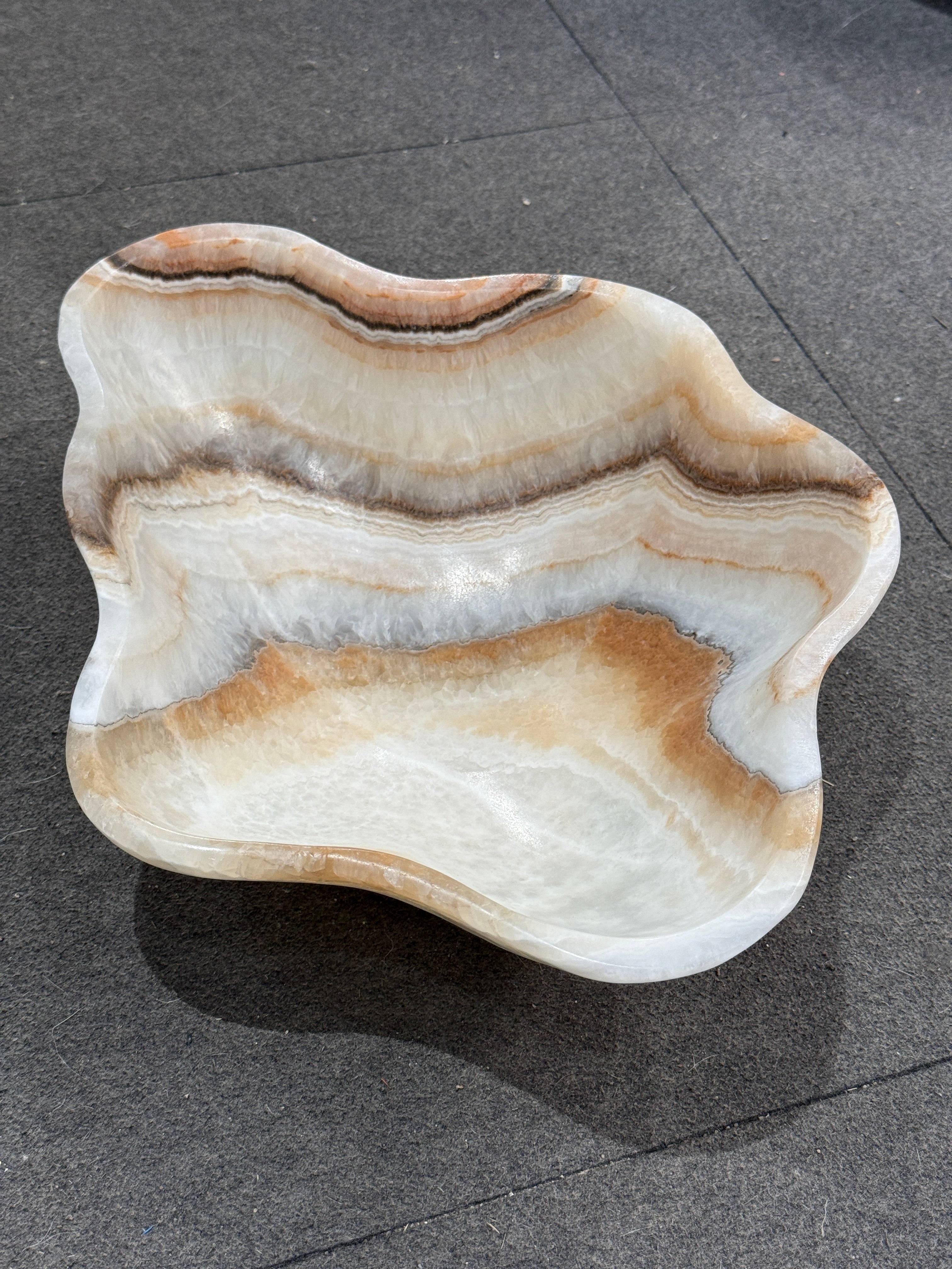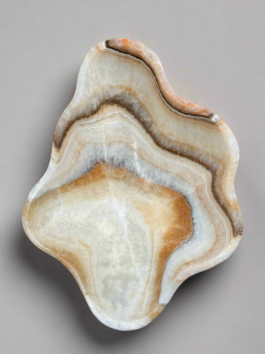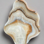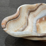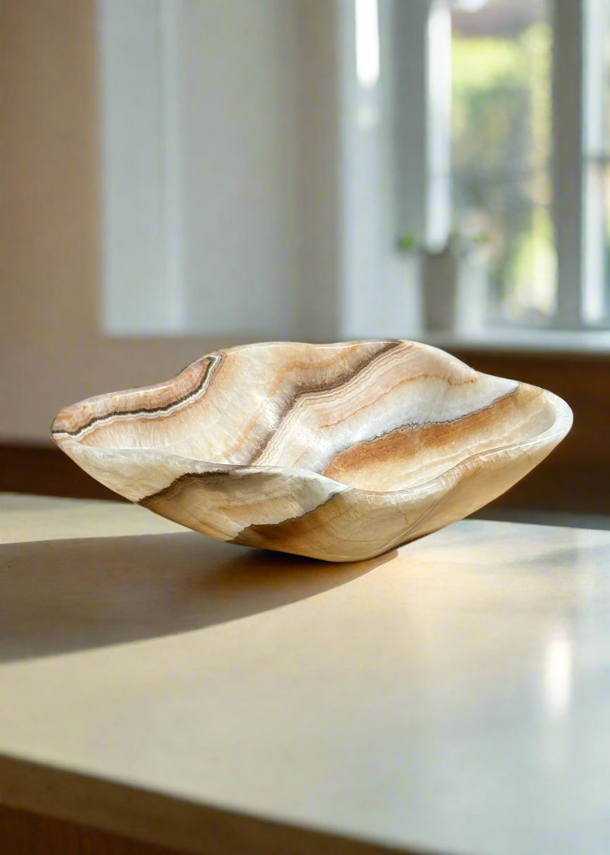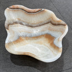 This exquisite onyx bowl features a striking blend of white, orange, and brown hues, as well as a matte finish and a smooth edge. Skillfully crafted in Mexico, its natural stone composition offers a unique, durable piece that enhances any space with warm, earthy tones. Ideal for showcasing decorative items or as a standalone centerpiece, this bowl combines artisanal craftsmanship with elegant functionality.