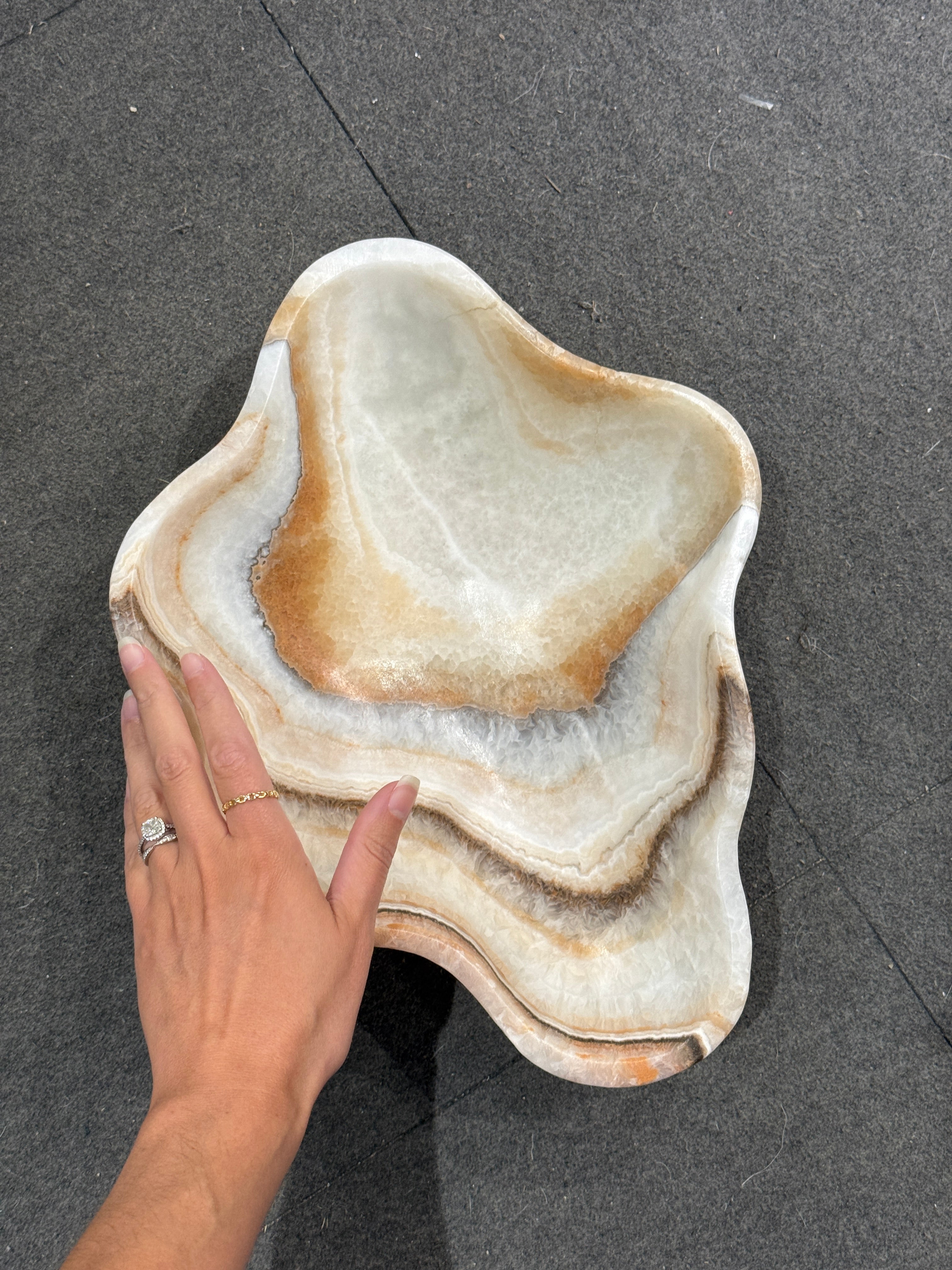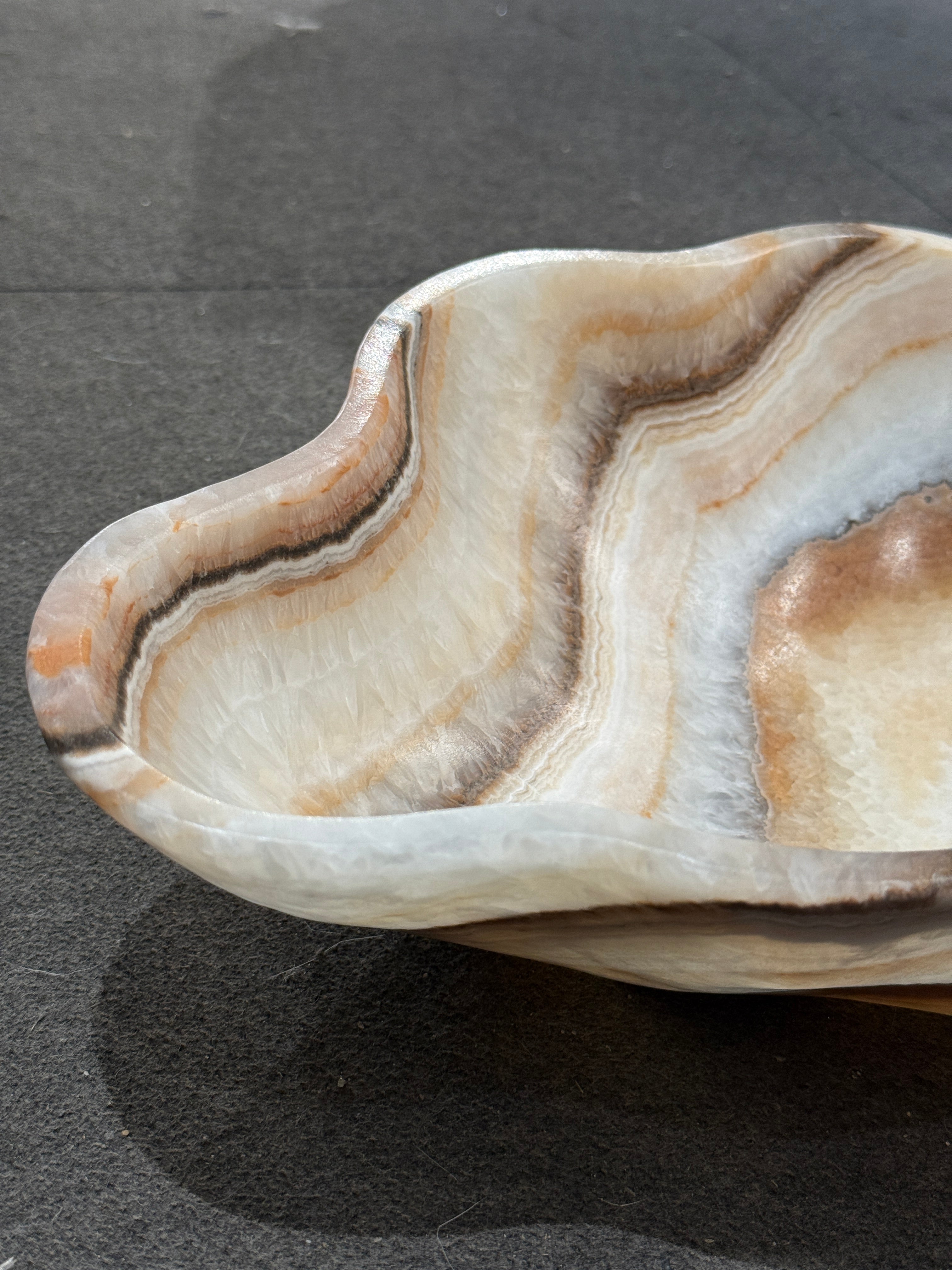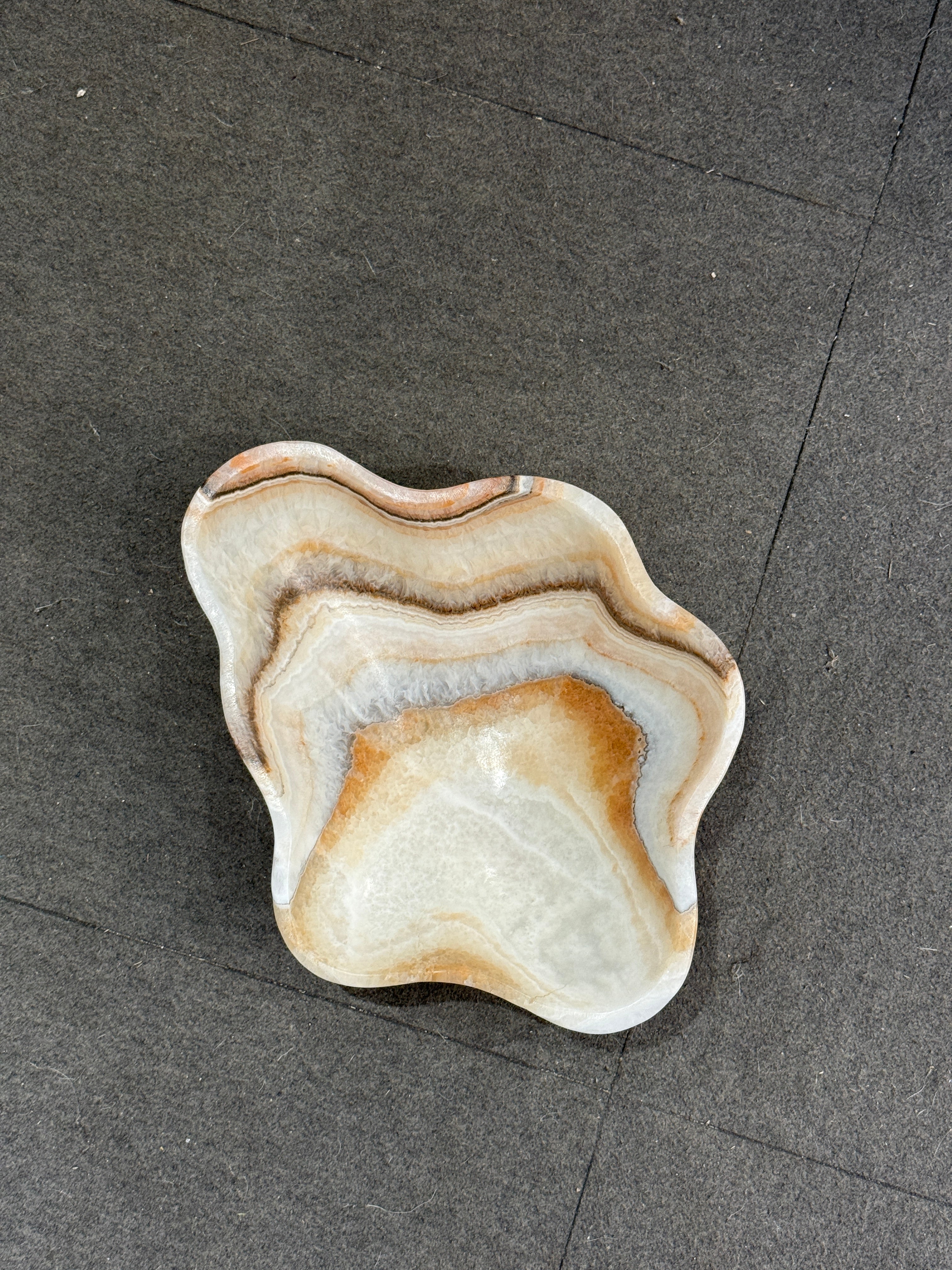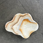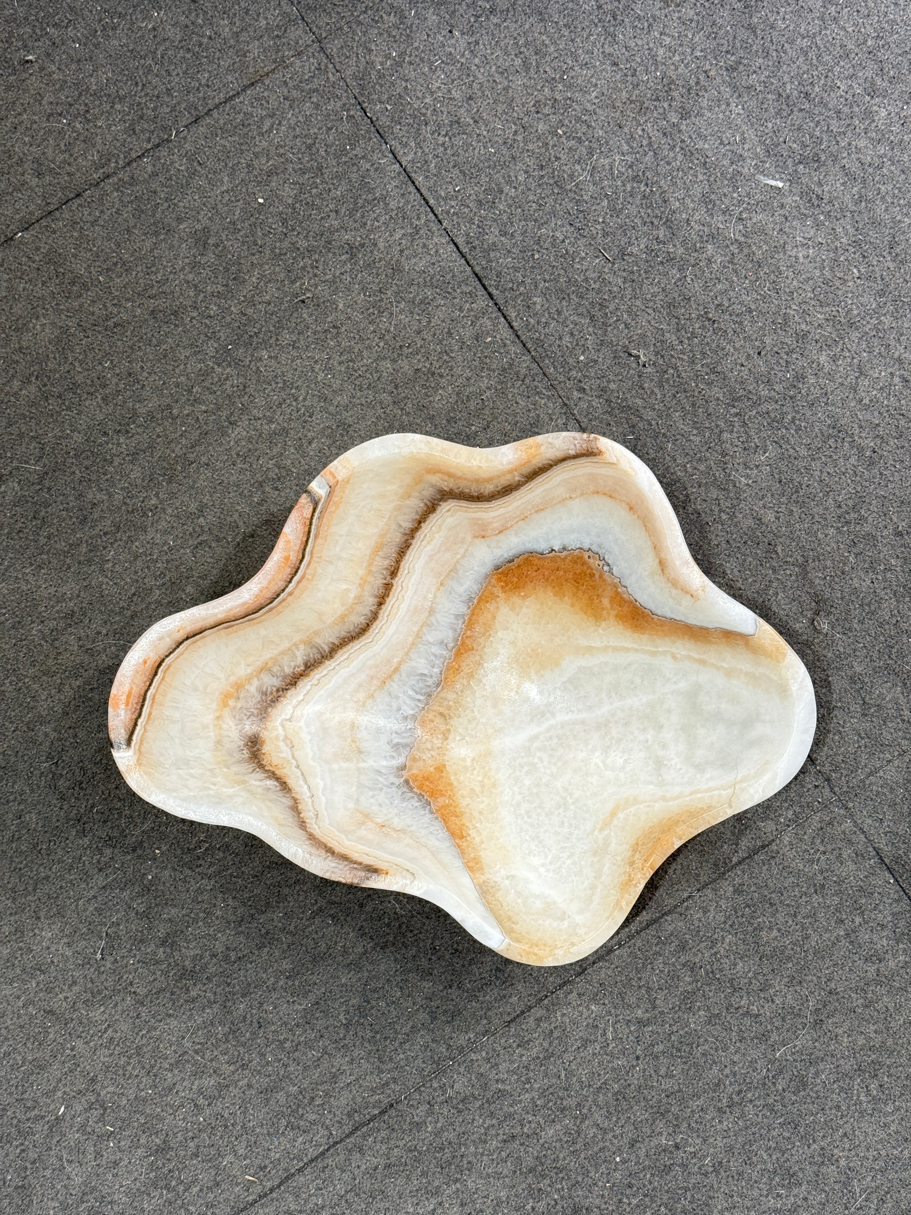This exquisite onyx bowl features a striking blend of white, orange, and brown hues, as well as a matte finish and a smooth edge. Skillfully crafted in Mexico, its natural stone composition offers a unique, durable piece that enhances any space with warm, earthy tones. Ideal for showcasing decorative items or as a standalone centerpiece, this bowl combines artisanal craftsmanship with elegant functionality.