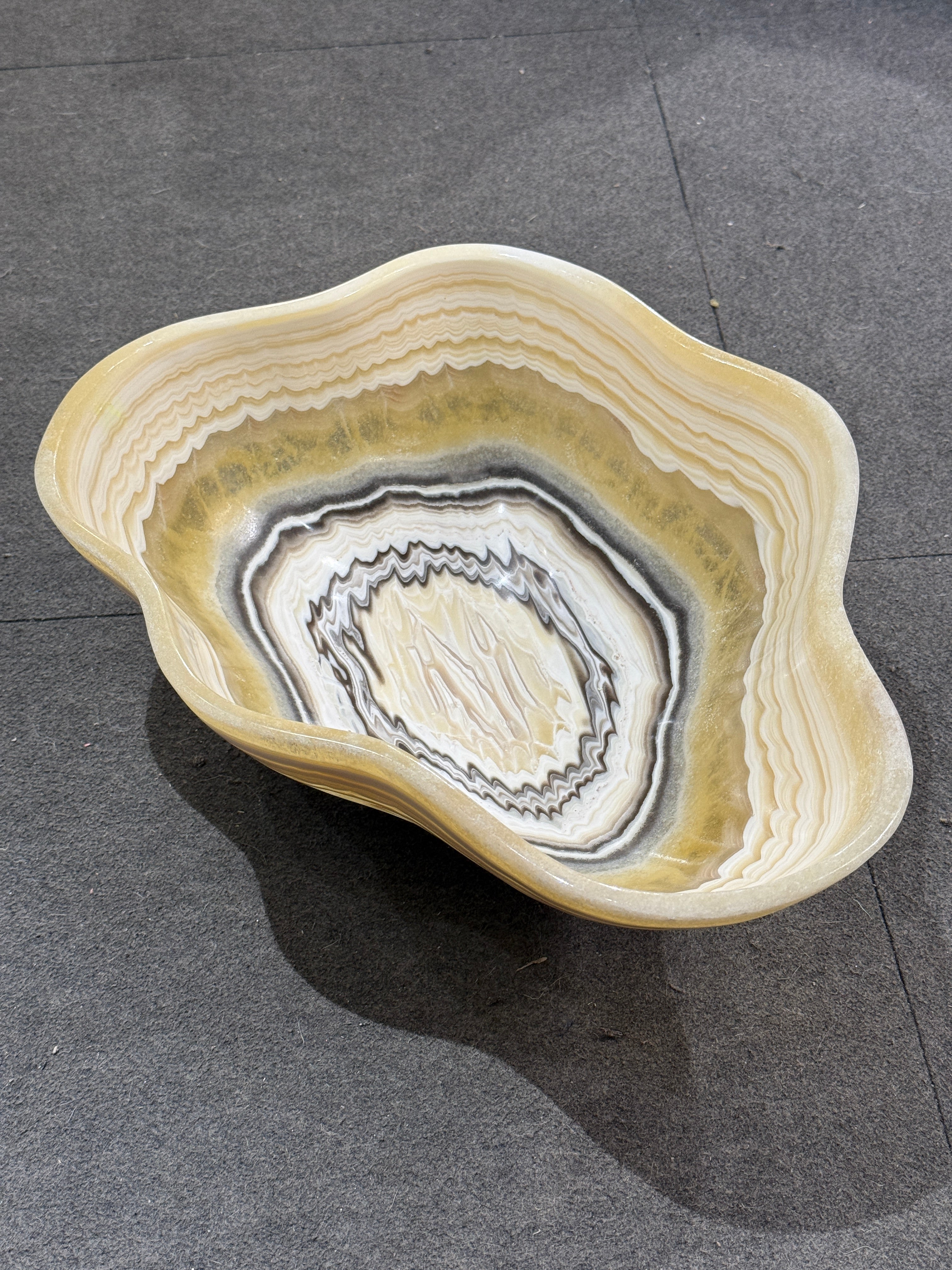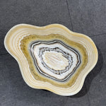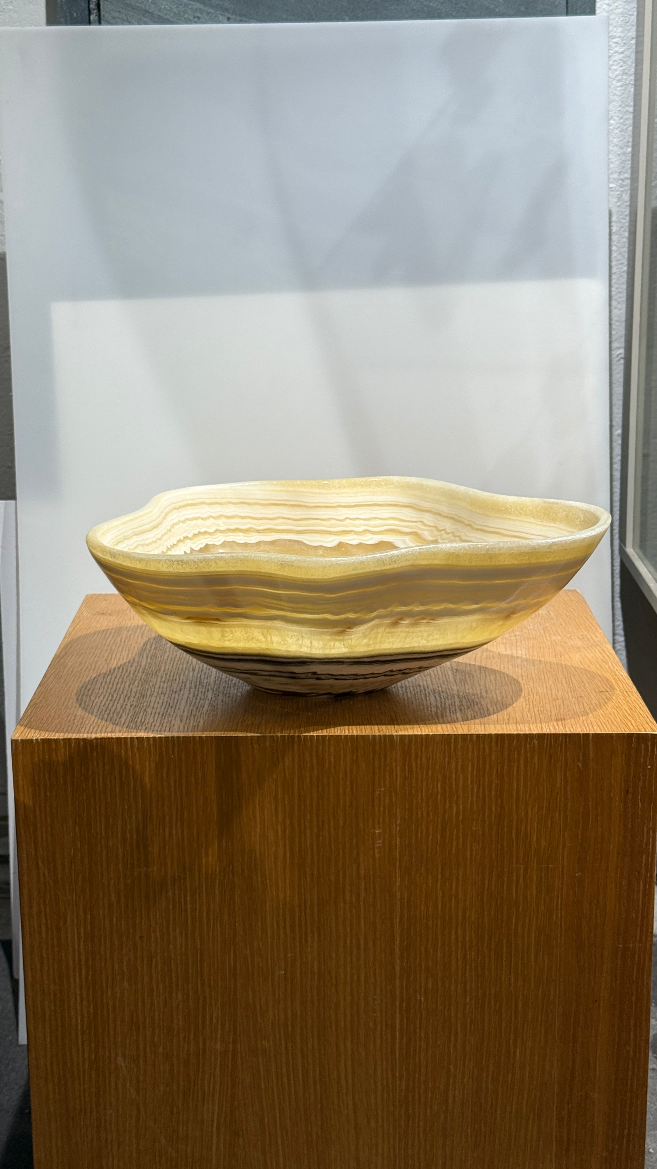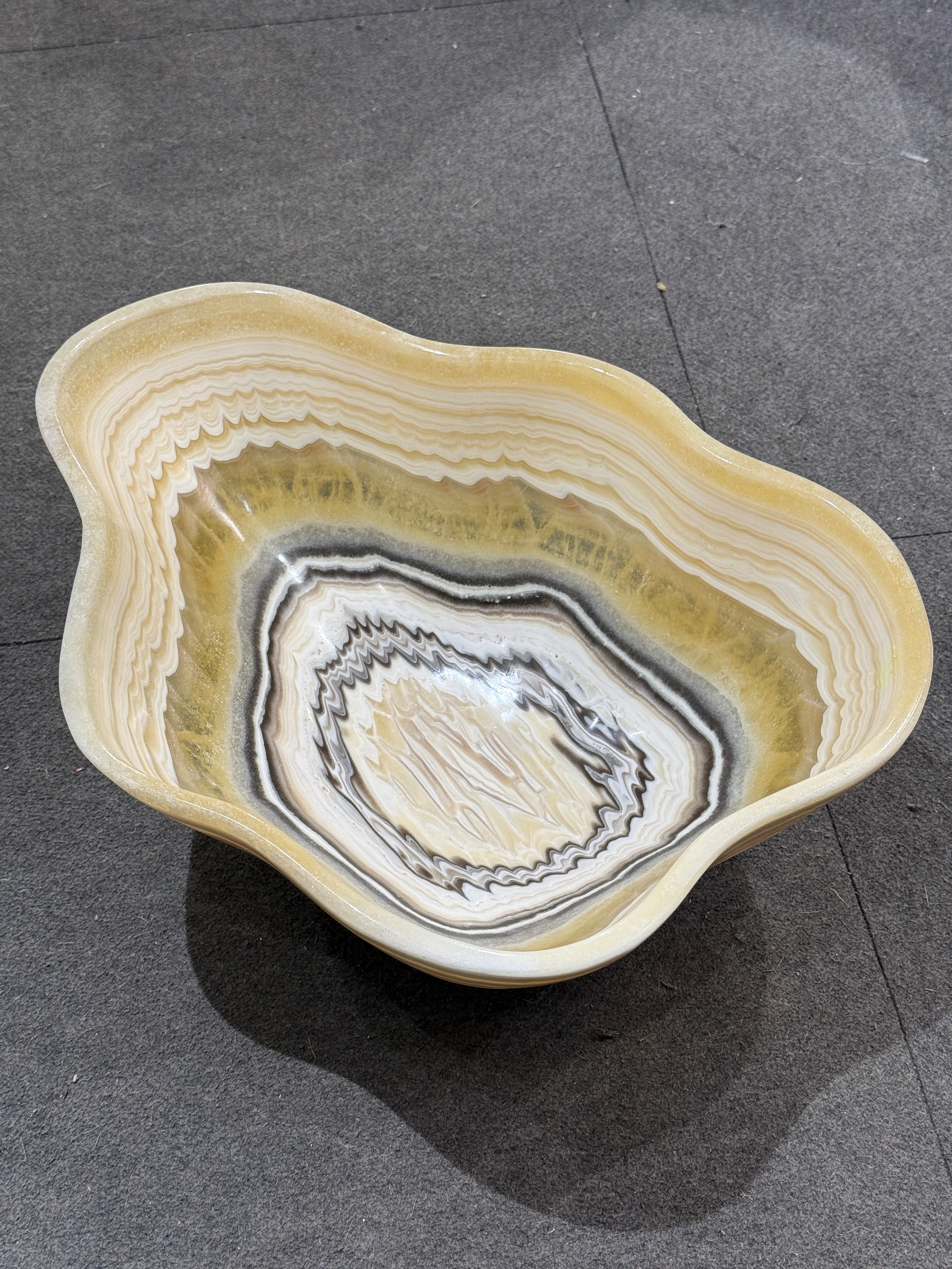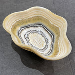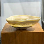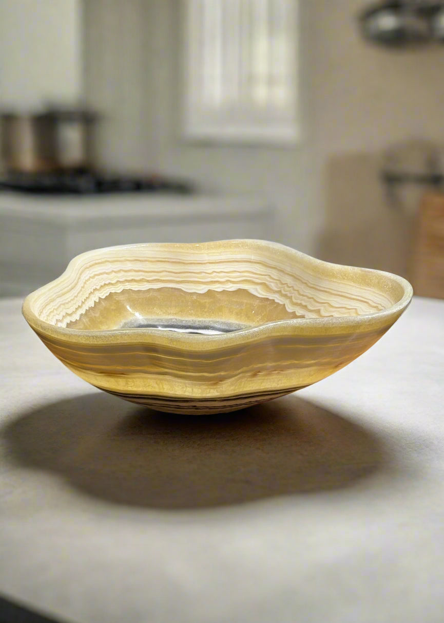 This yellow striped Onyx Bowl from Mexico with a polished finish and a smooth edge showcases exquisite natural stone craftsmanship. Its vibrant stripes highlight the unique patterns inherent to onyx, making each piece distinct. Perfect for adding a sophisticated, natural element to your interior design, this bowl blends artistic beauty with functional use. Ideal for display or serving, it reflects expert stonework and the rich tradition of Mexican artisans.