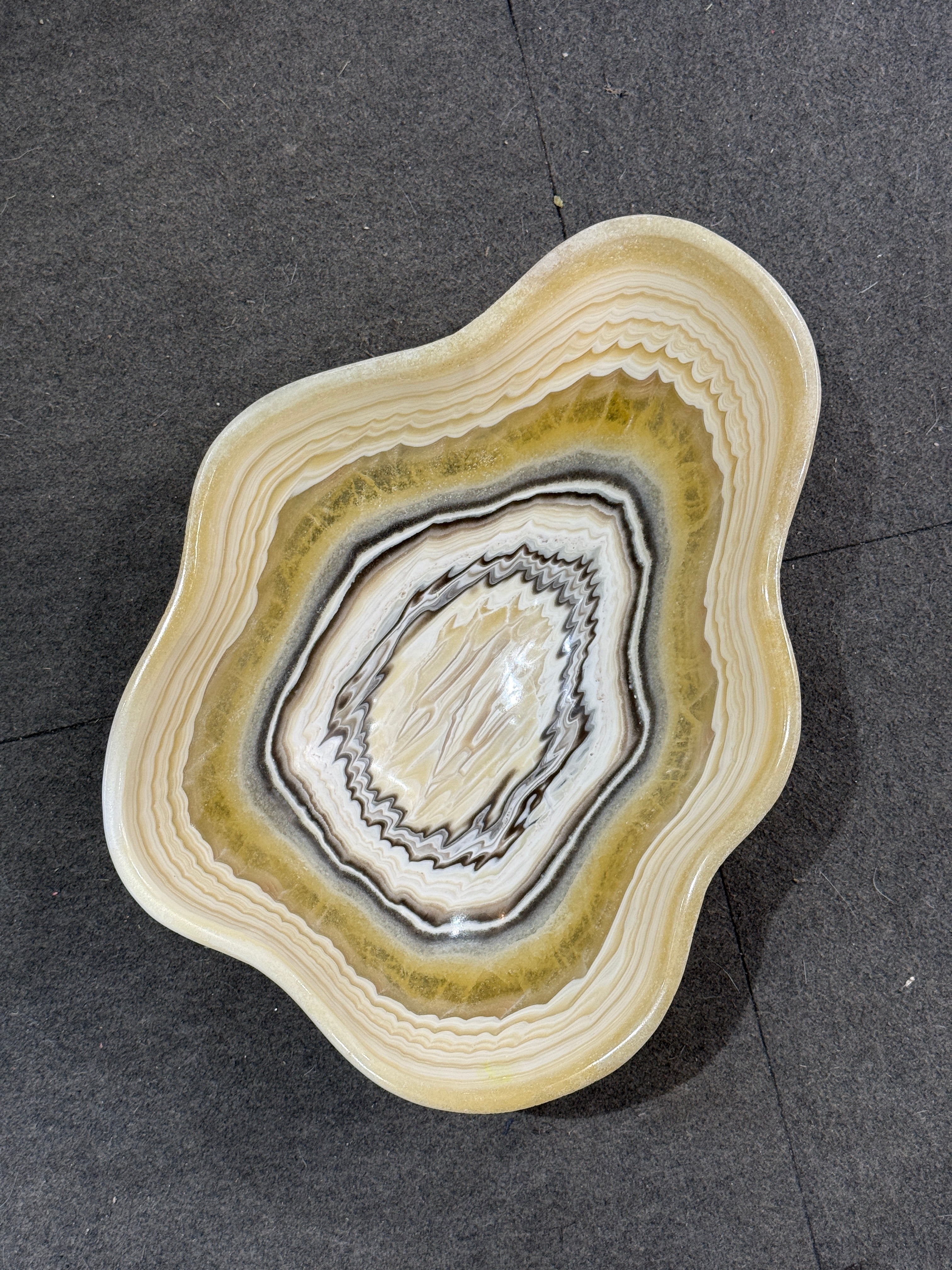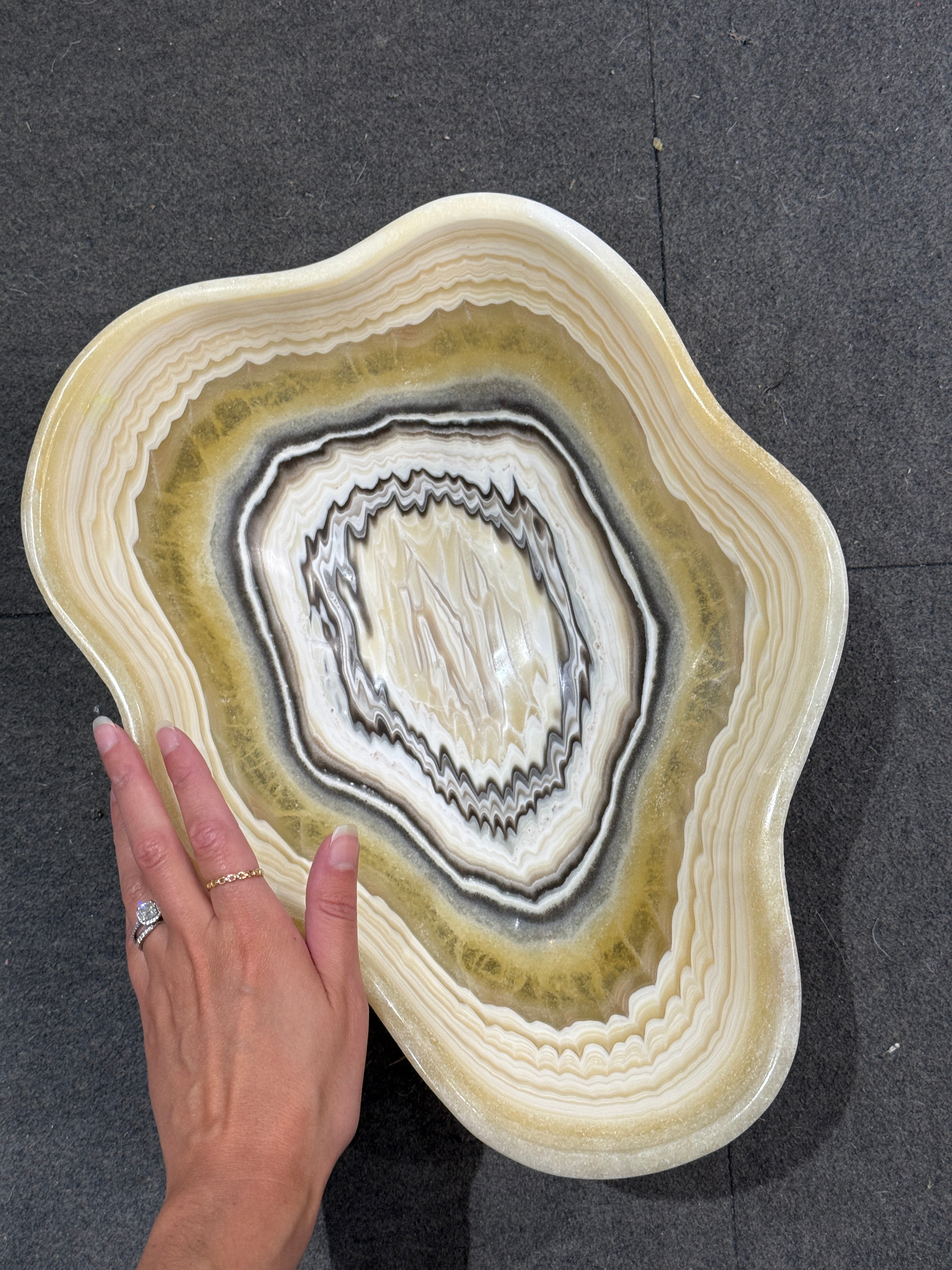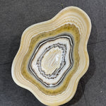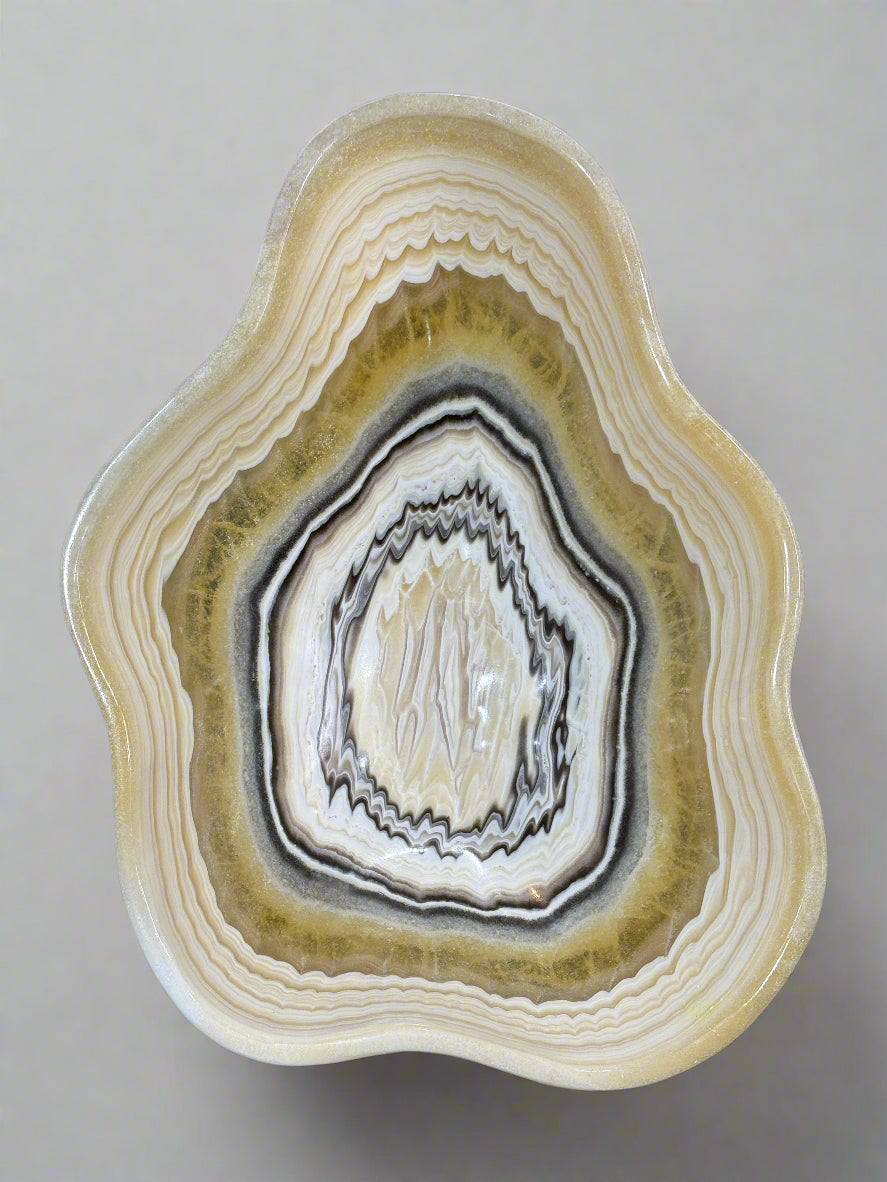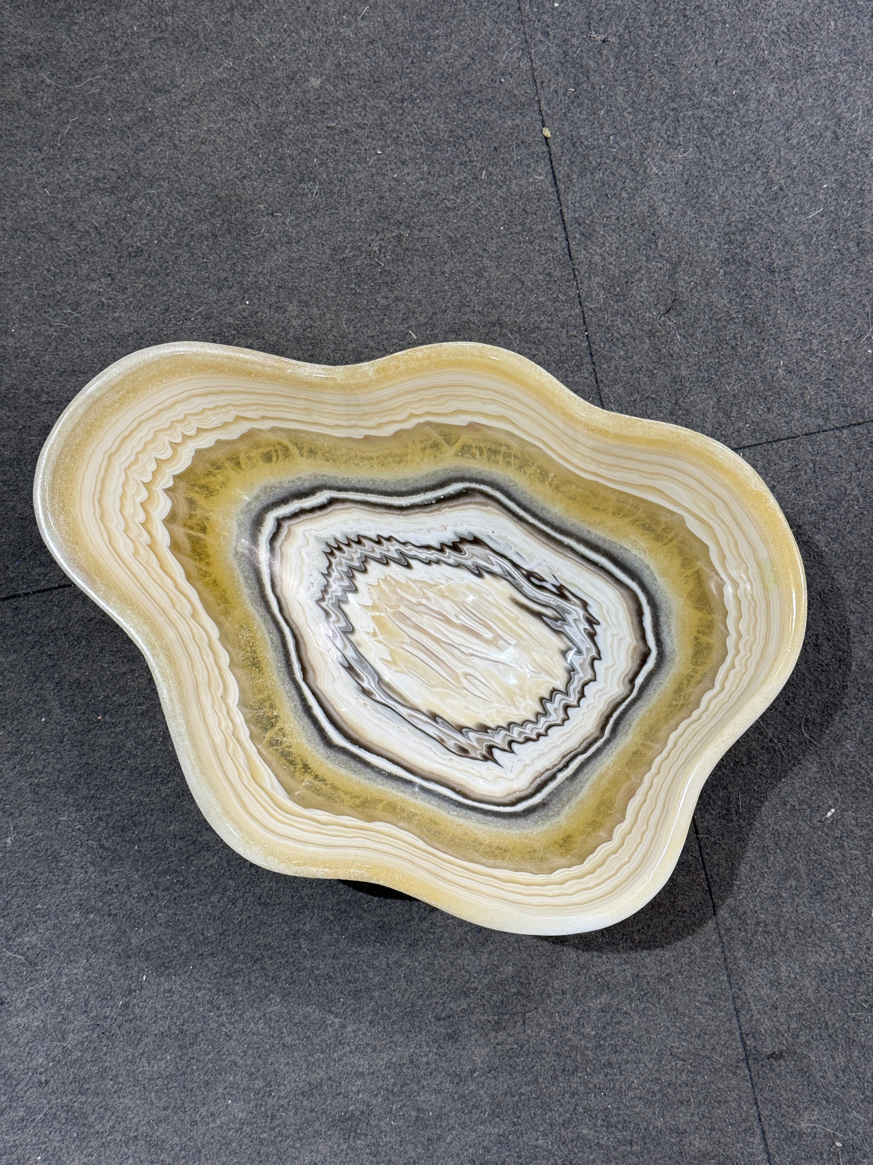 This yellow striped Onyx Bowl from Mexico with a polished finish and a smooth edge showcases exquisite natural stone craftsmanship. Its vibrant stripes highlight the unique patterns inherent to onyx, making each piece distinct. Perfect for adding a sophisticated, natural element to your interior design, this bowl blends artistic beauty with functional use. Ideal for display or serving, it reflects expert stonework and the rich tradition of Mexican artisans.