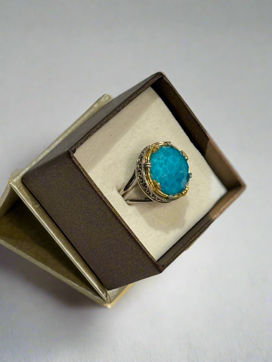 This elegant Anatoli Jewelry ring features a stunning Chrysocolla Doublet, creating a beautiful and unique piece of jewelry. With expert craftsmanship and high quality materials, this ring offers both style and durability. Perfect for any occasion, this ring is a must-have for any jewelry collection.