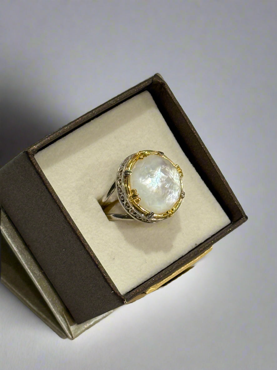This exquisite Mother of Pearl ring from Anatoli Jewelry showcases the beauty and elegance of nature's own creation. Crafted with intricate details and a timeless design, this ring is a true statement piece. Elevate your style with the luxurious touch of Mother of Pearl.