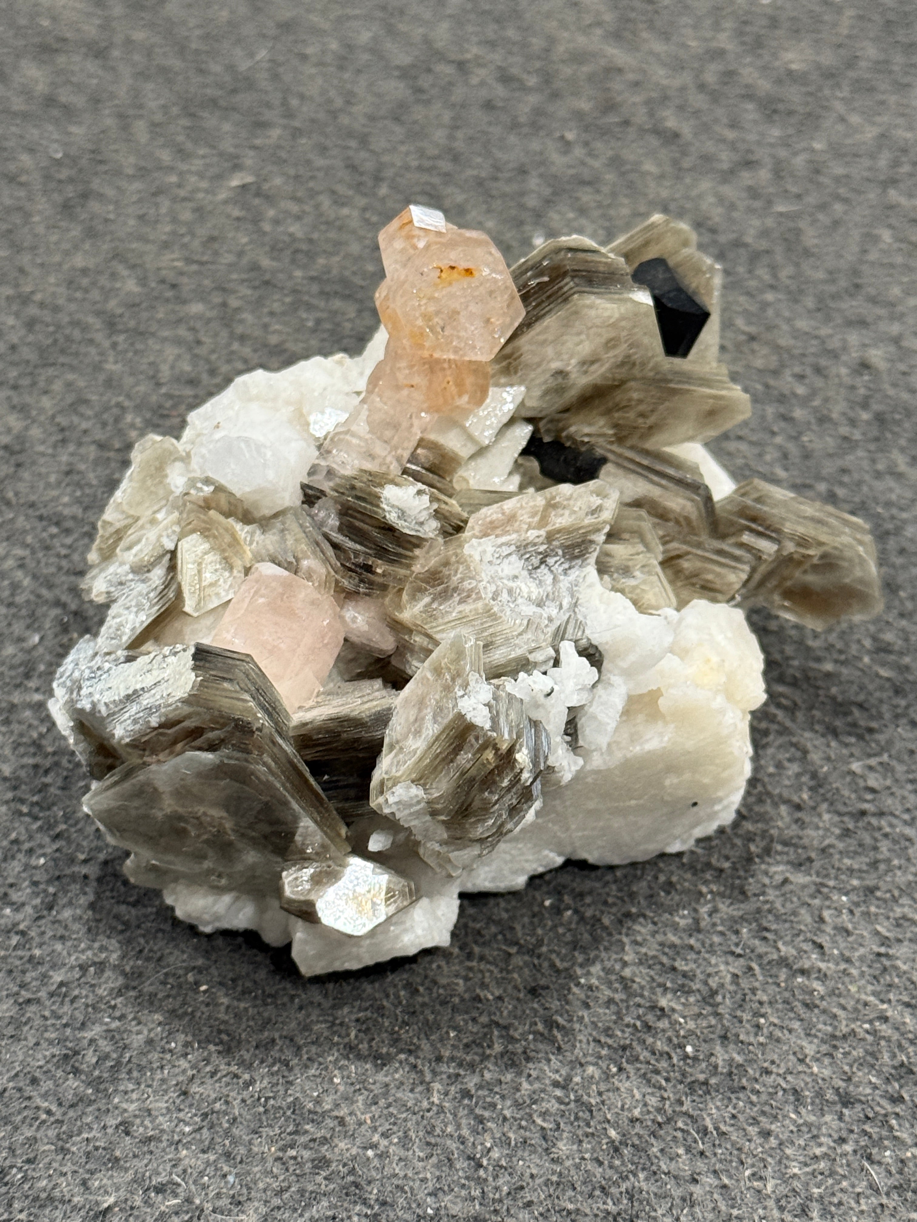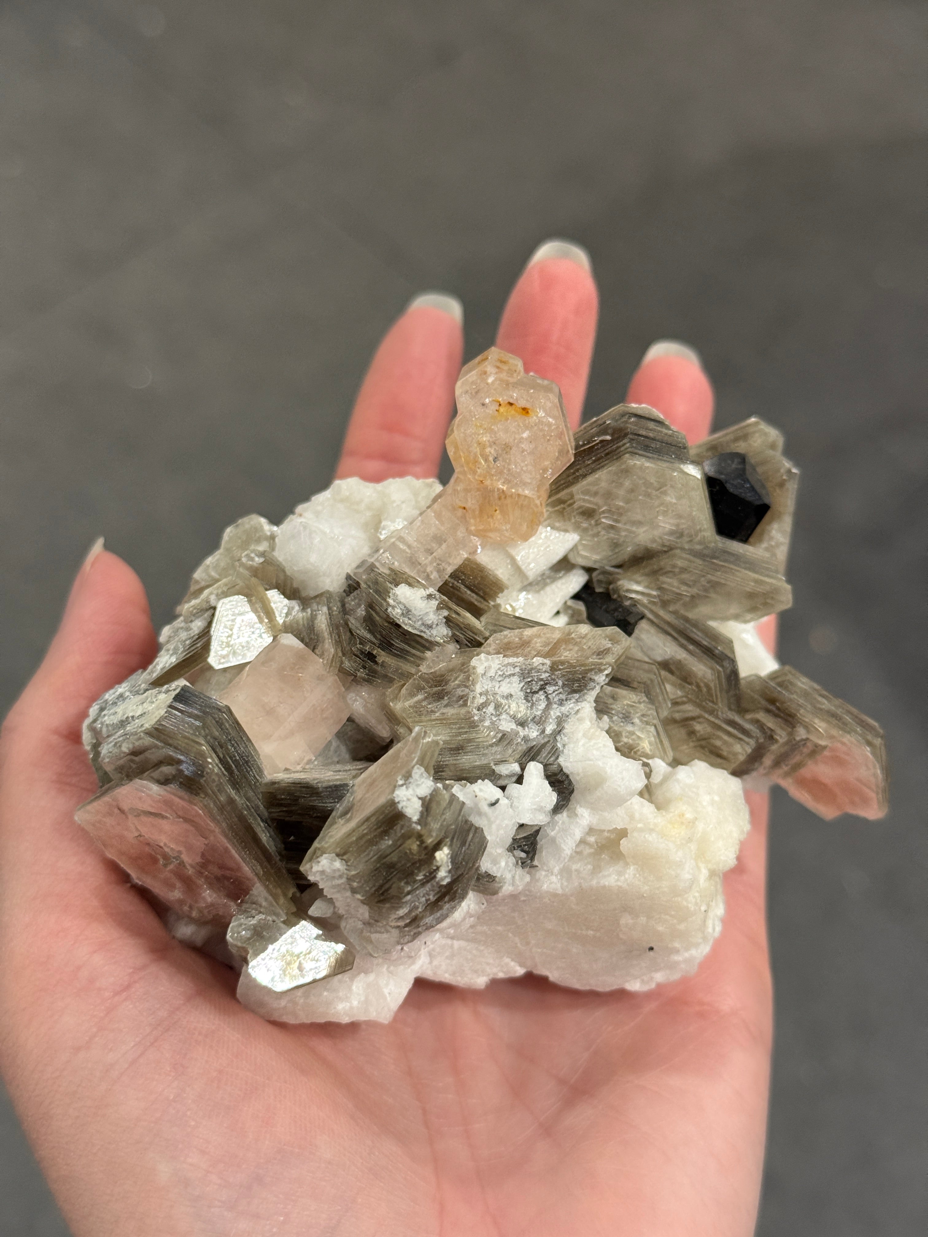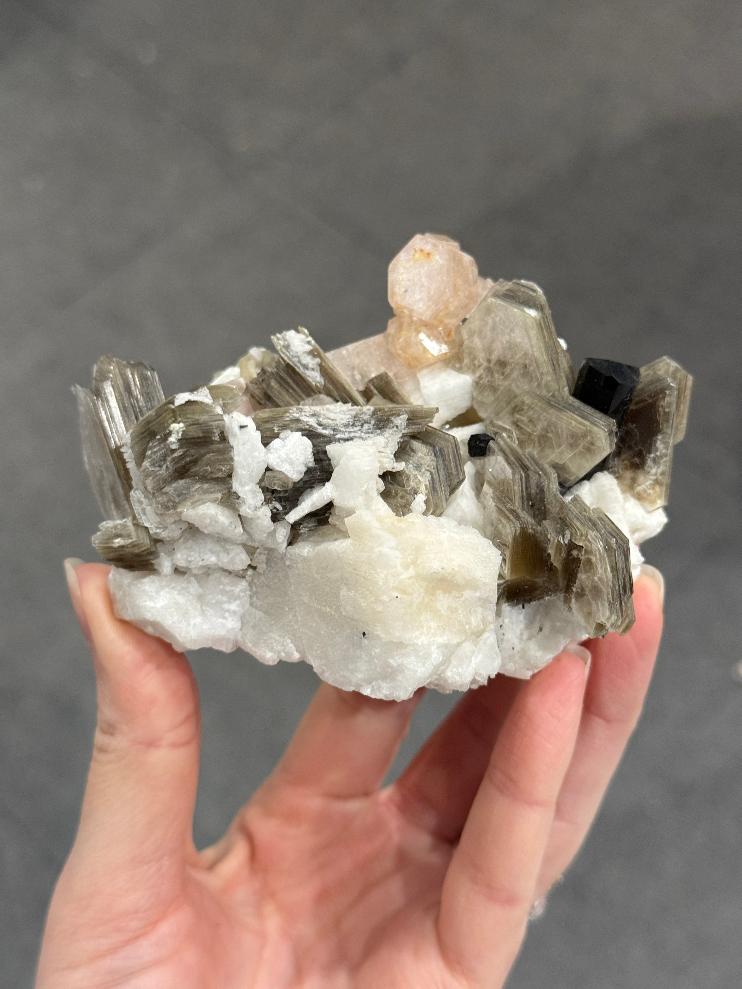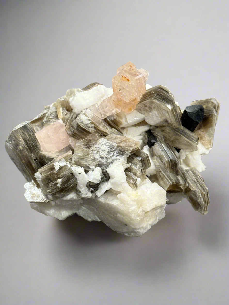 Indulge in the beauty of this piece of Apatite, Black Tourmaline, Muscovite, and Feldspar from Nagar, Pakistan. This unique combination of gemstones, sourced from the remote mountains of Pakistan, exudes elegance and sophistication. Enhance your collection with this rare, high-quality stone.