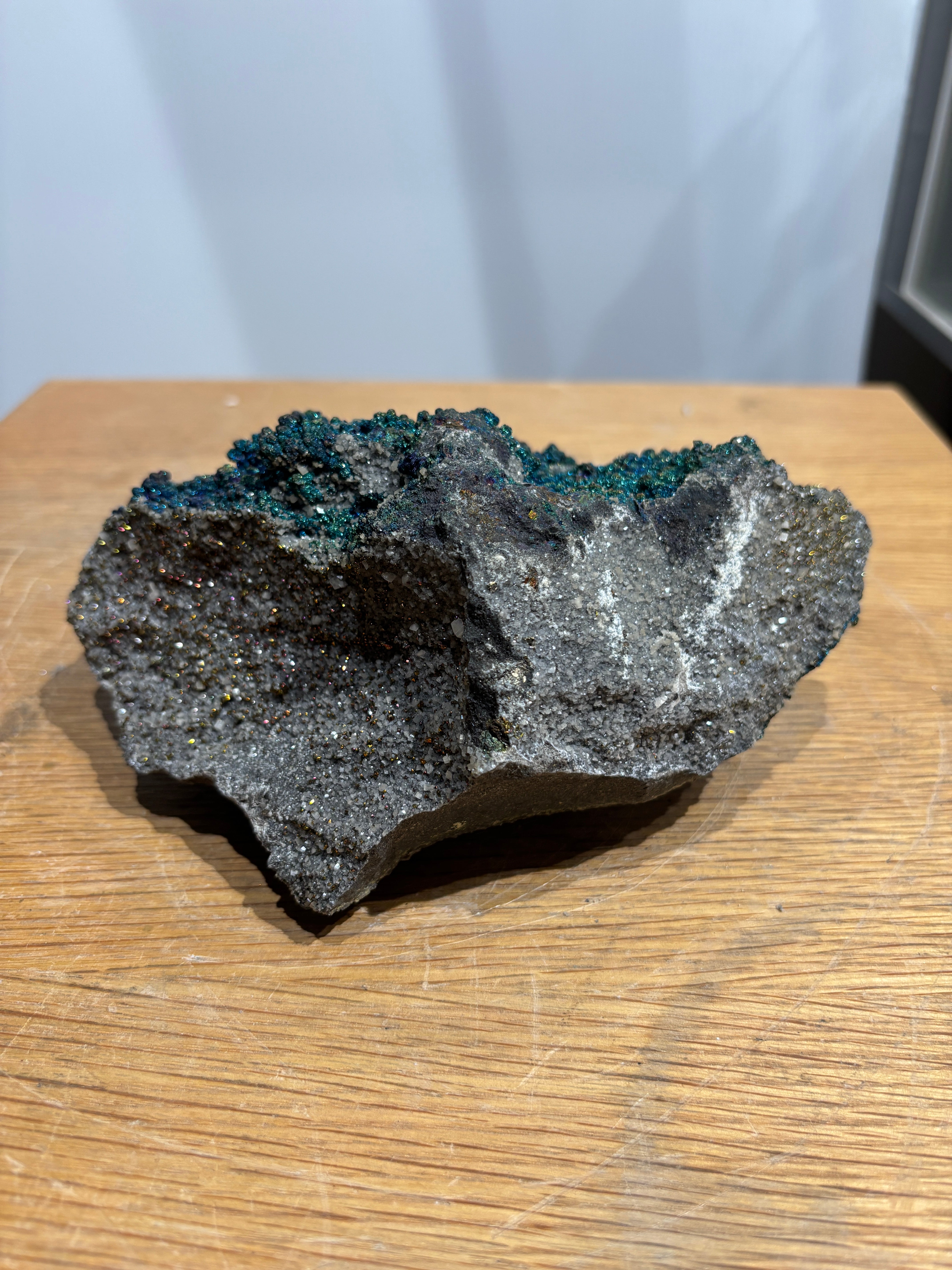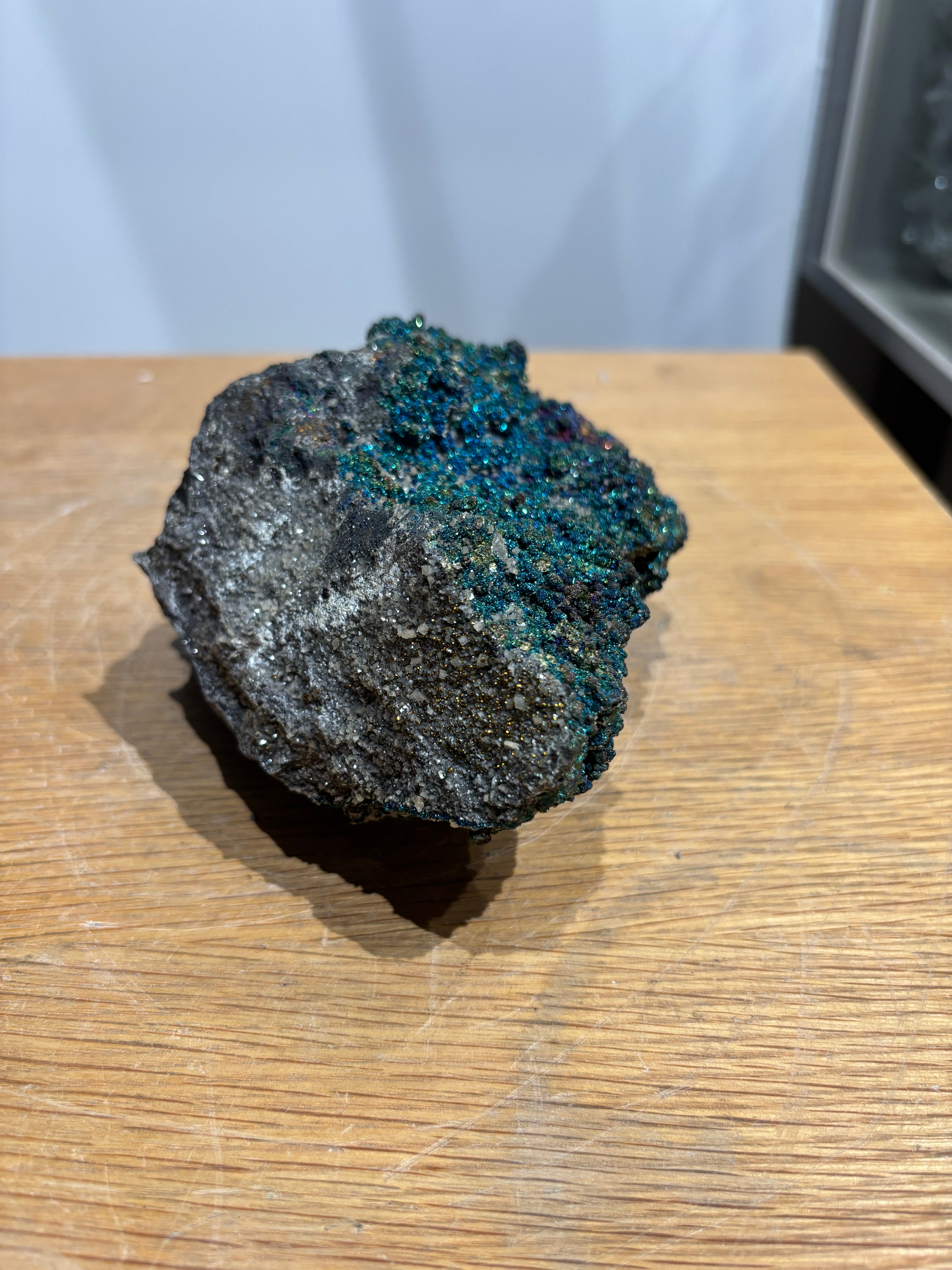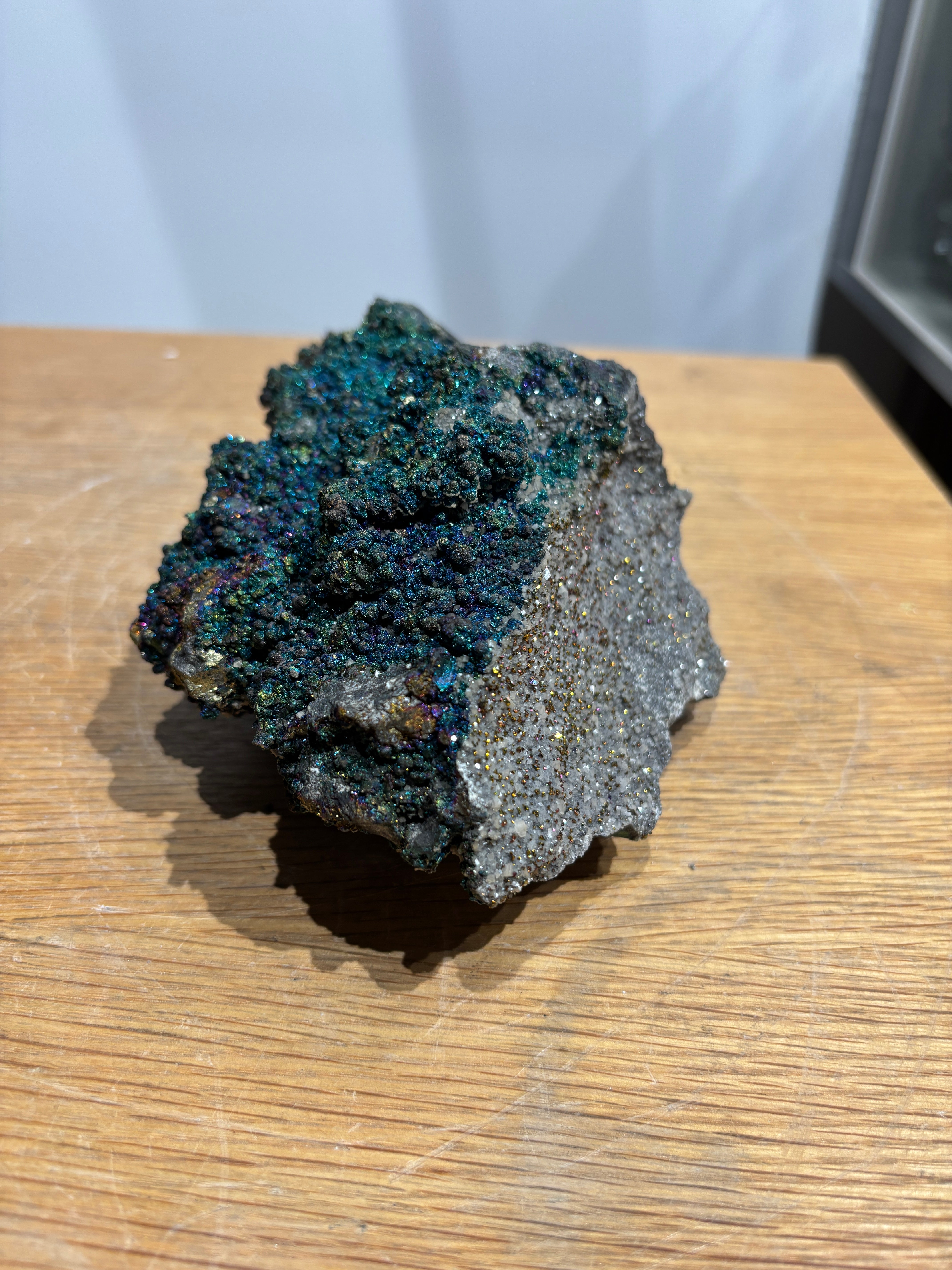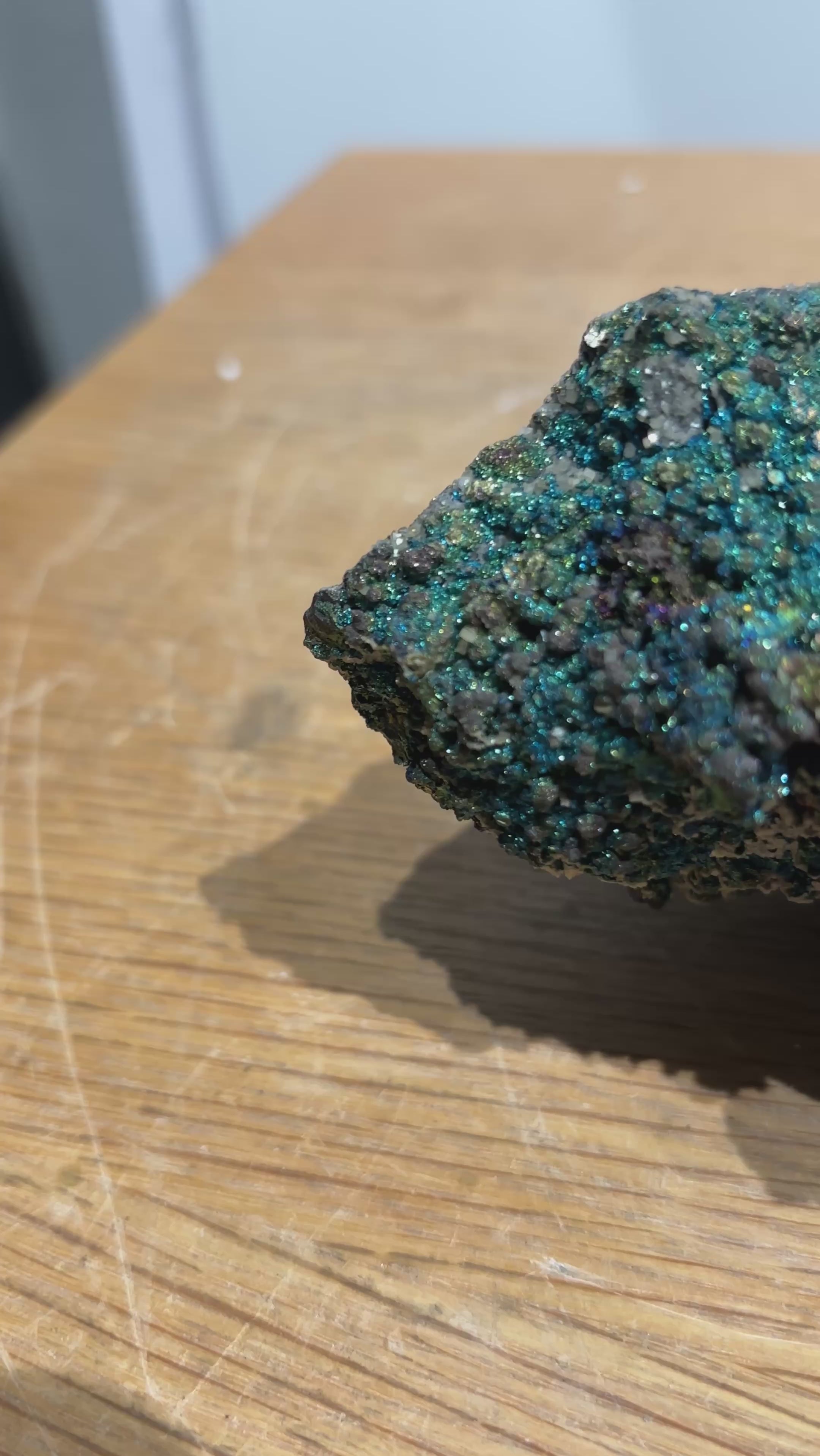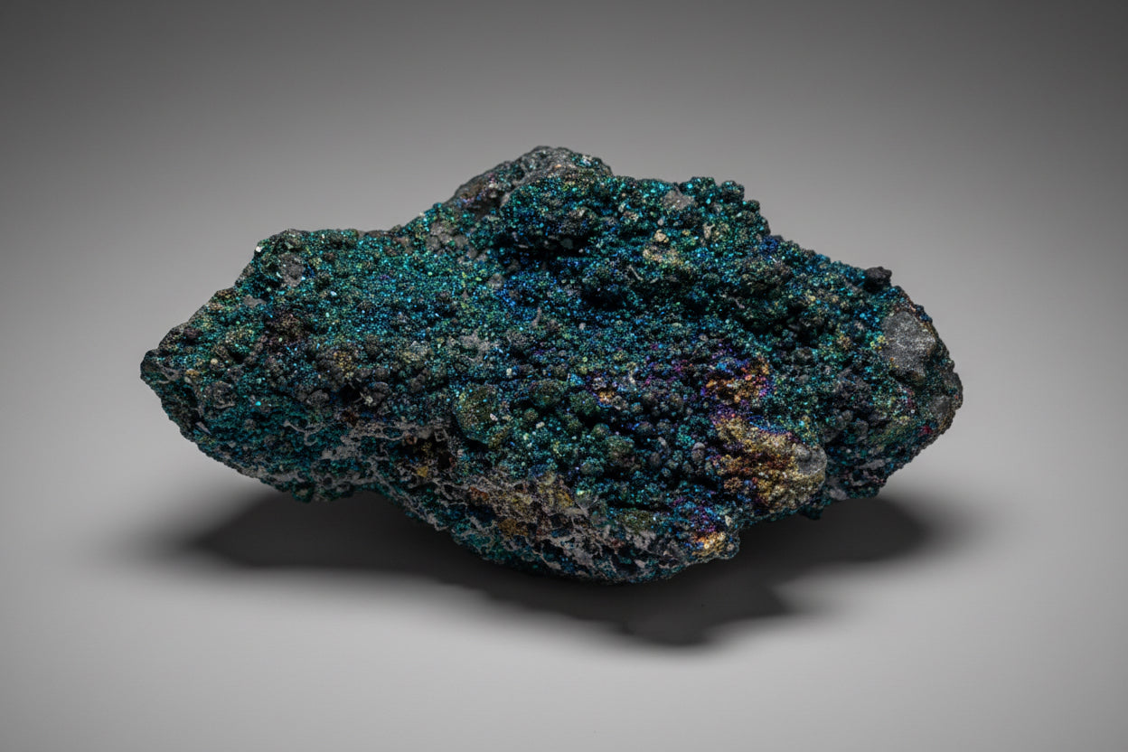 This Brushy Creek chalcopyrite specimen displays the striking iridescent tarnish that develops on oxidized copper-iron sulfide surfaces, creating vivid rainbow hues across its brassy foundation. The play of purples, blues, and yellows characteristic of chalcopyrite's oxidation layer makes this piece visually distinctive. Sourced from the renowned Brushy Creek locality, the specimen combines mineralogical significance with aesthetic appeal. A compelling addition for collectors valuing both scientific interest and natural color variation in their mineral assemblies.