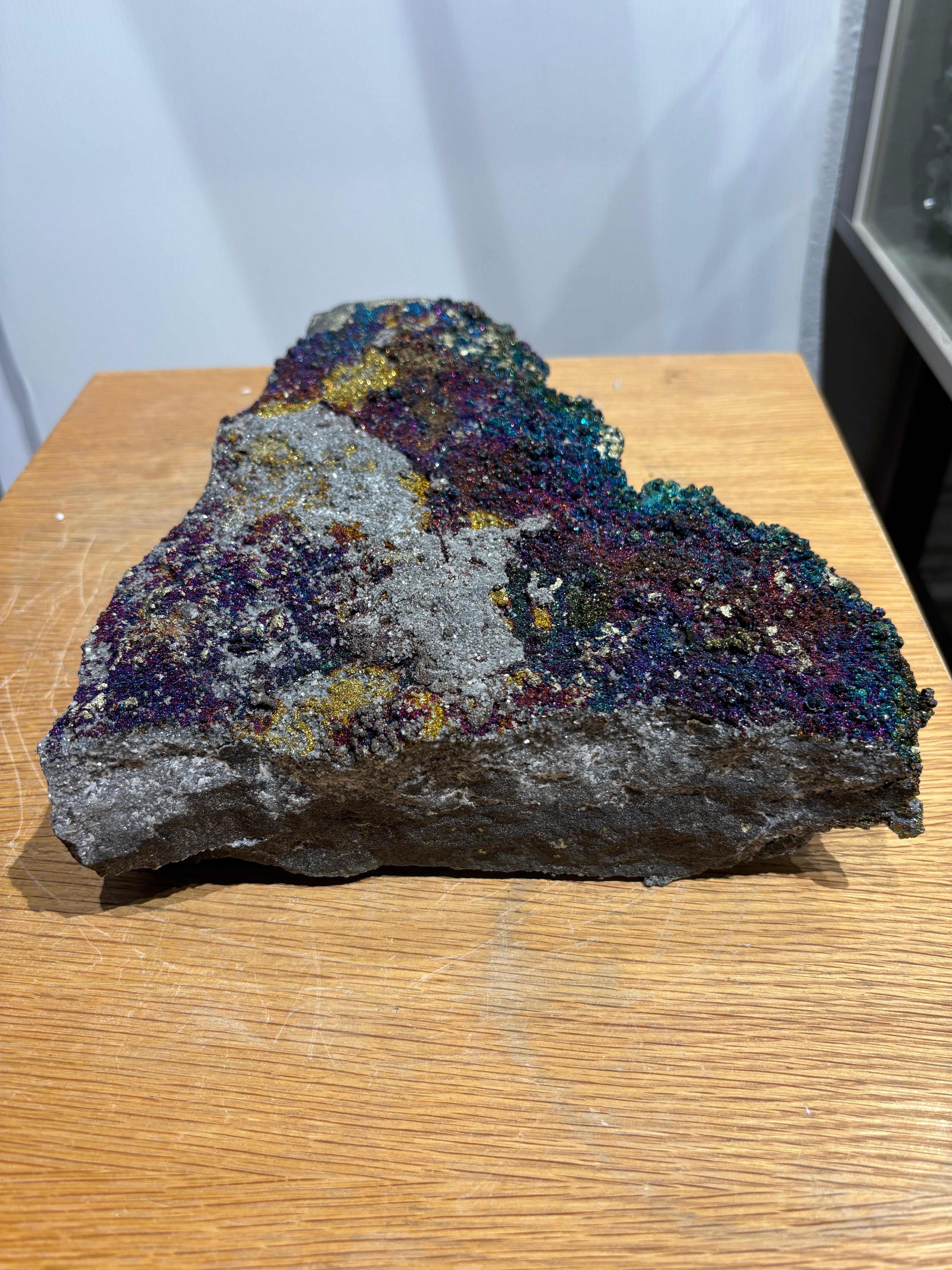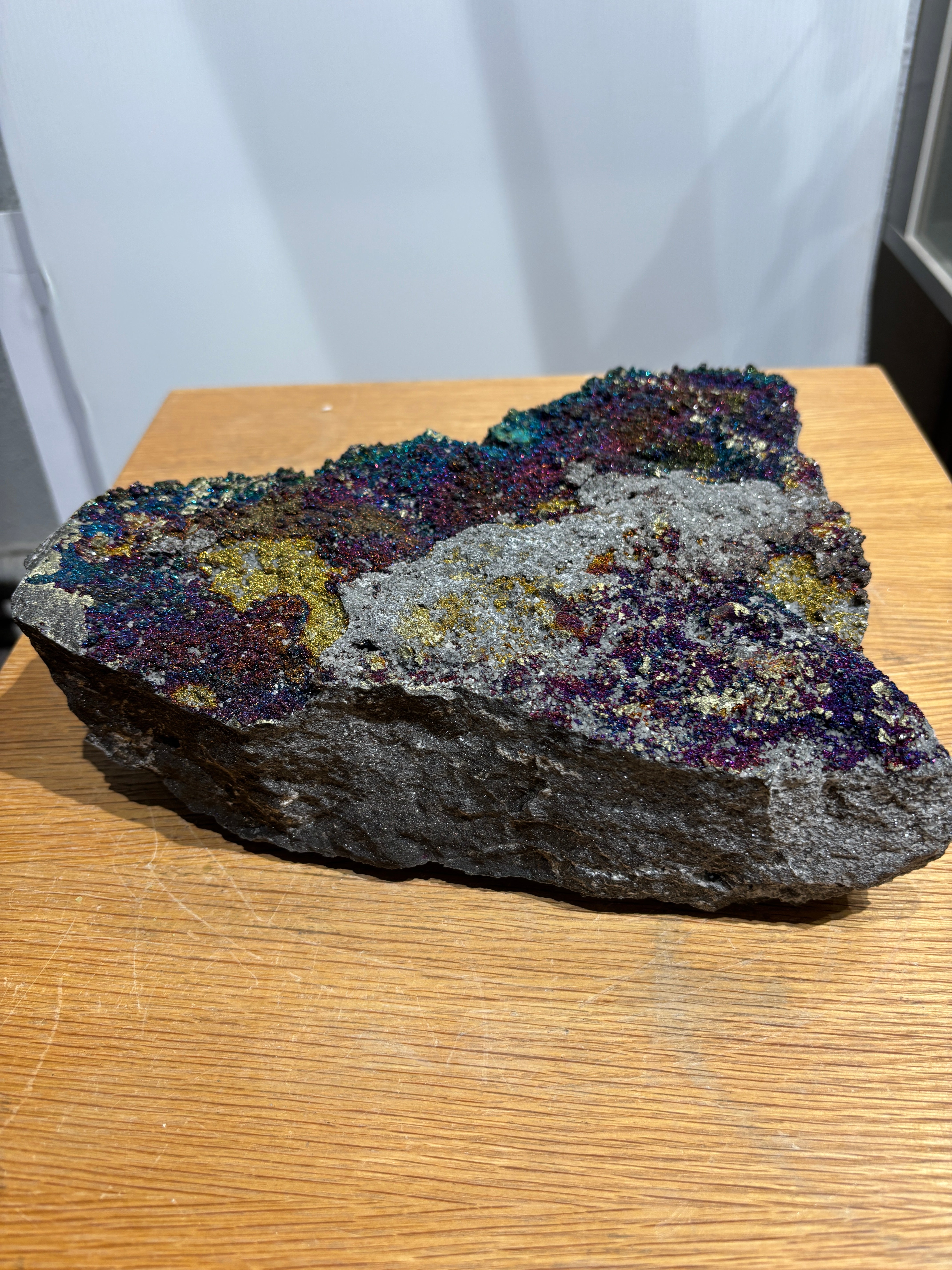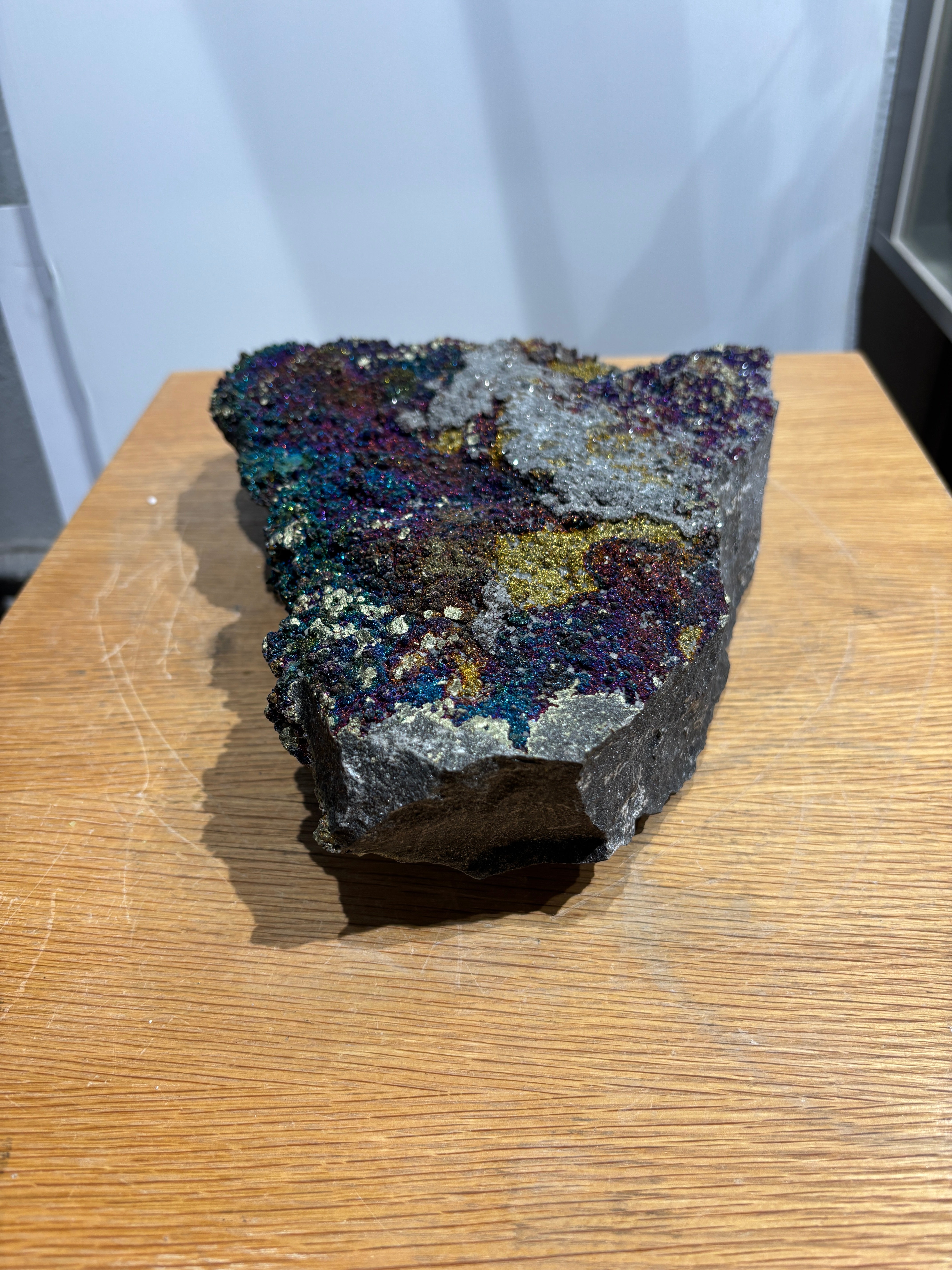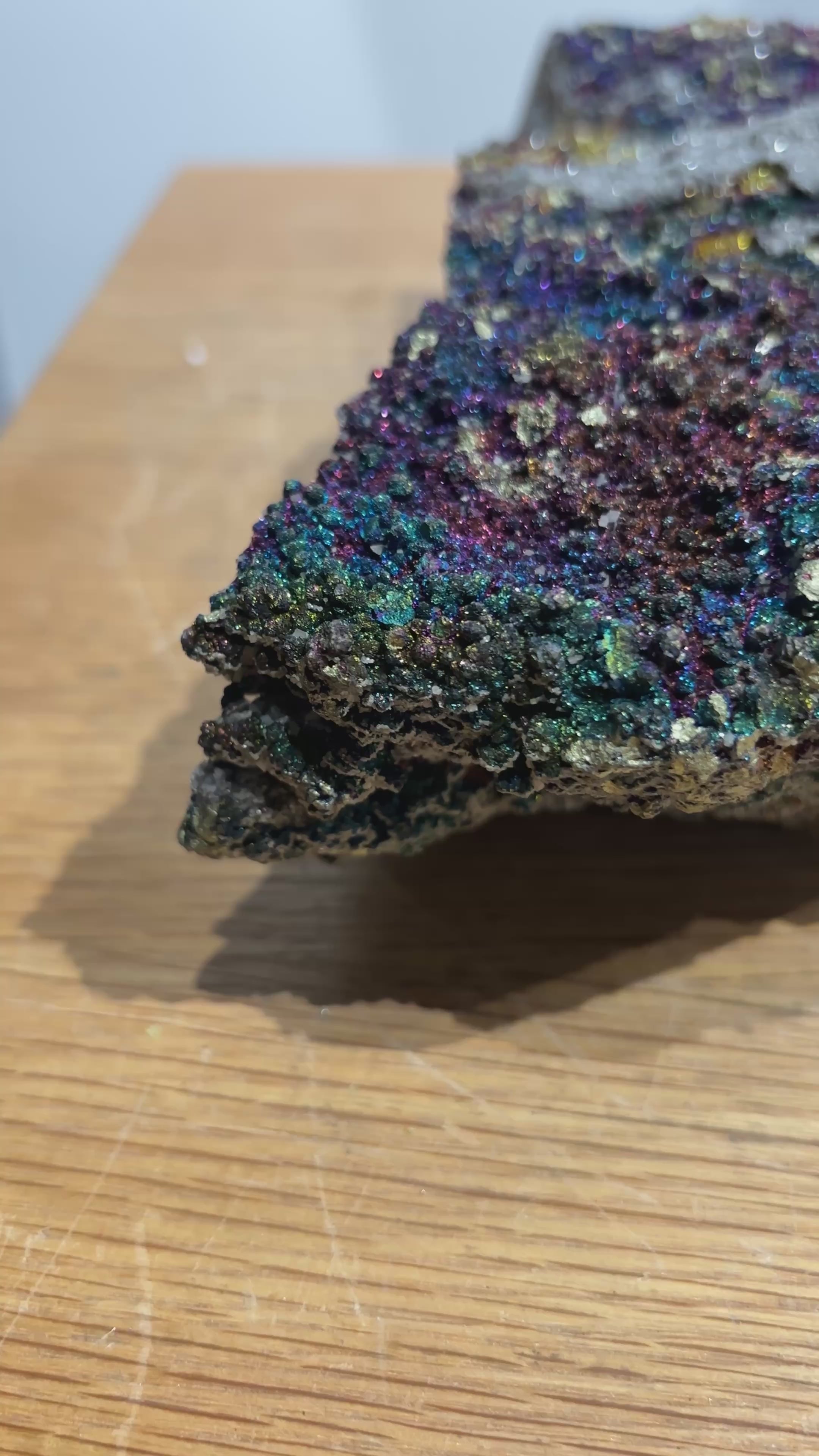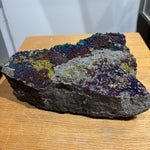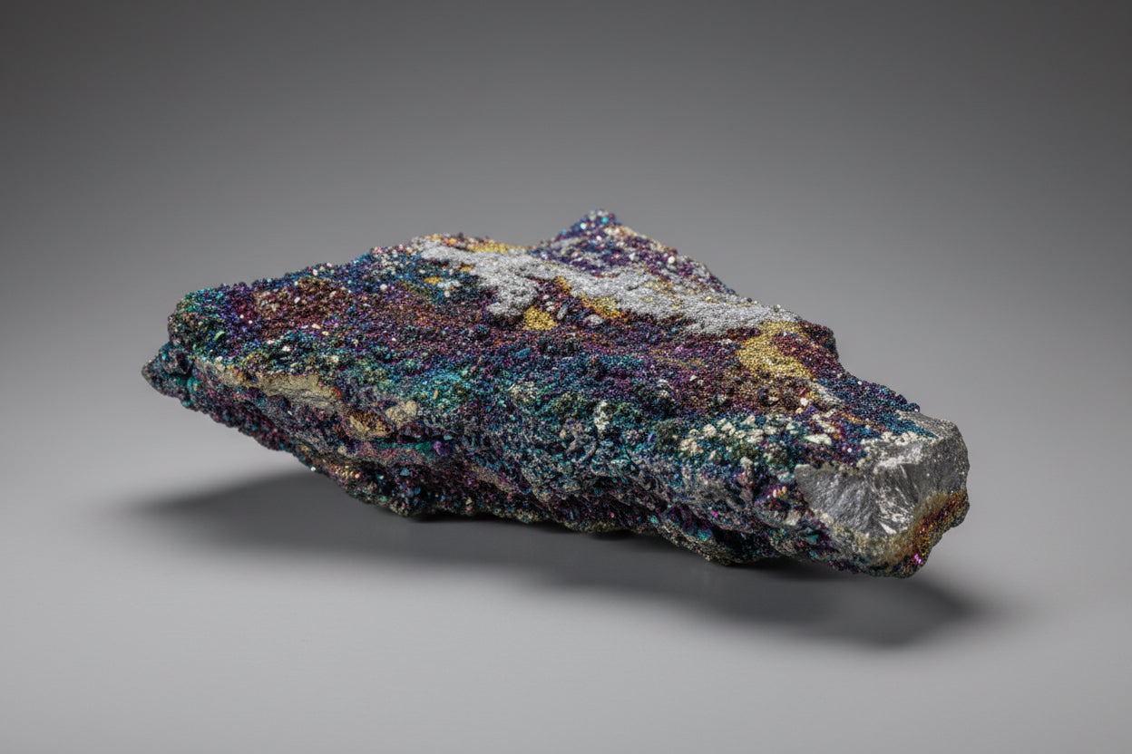 This Brushy Creek chalcopyrite specimen displays the striking iridescent tarnish that develops on oxidized copper-iron sulfide surfaces, creating vivid rainbow hues across its brassy foundation. The play of purples, blues, and yellows characteristic of chalcopyrite's oxidation layer makes this piece visually distinctive. Sourced from the renowned Brushy Creek locality, the specimen combines mineralogical significance with aesthetic appeal. A compelling addition for collectors valuing both scientific interest and natural color variation in their mineral assemblies.