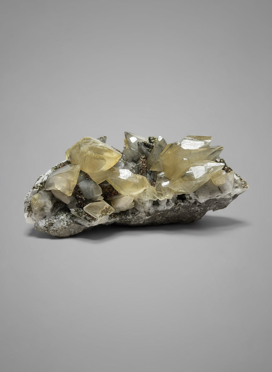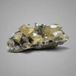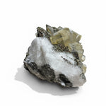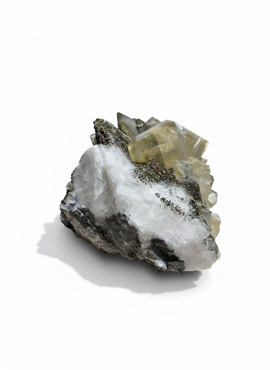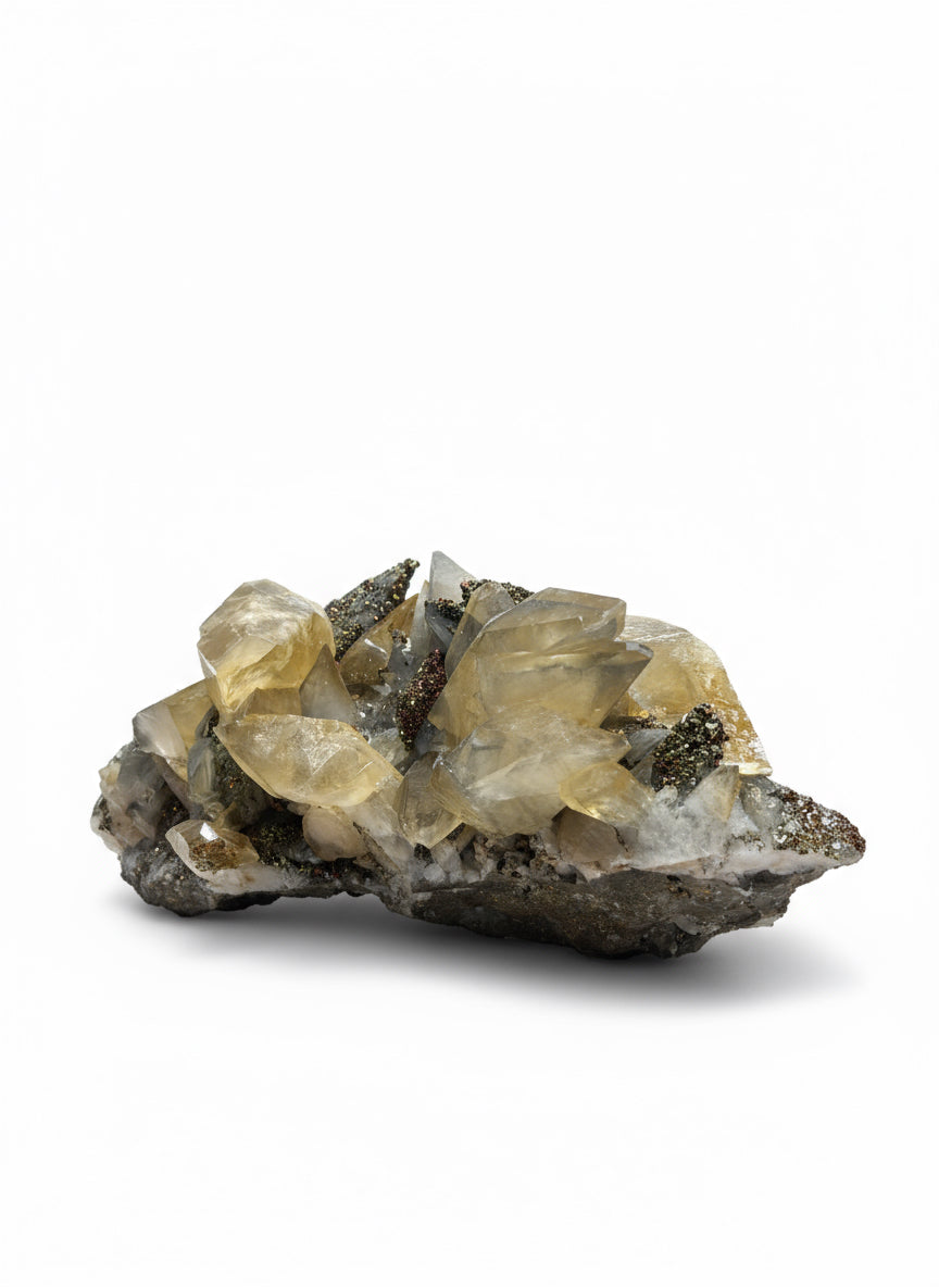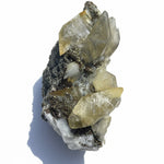 Calcite with Chalcopyrite specimens showcase striking contrasts between translucent calcite rhombohedra and metallic chalcopyrite. The prominent calcite crystals display excellent clarity and geometric form, while the associated chalcopyrite exhibits characteristic iridescent tarnish—displaying vibrant rainbow hues across its surface. This combination exemplifies classic mineral associations found in hydrothermal environments, making it an excellent addition to any serious collector's cabinet.