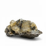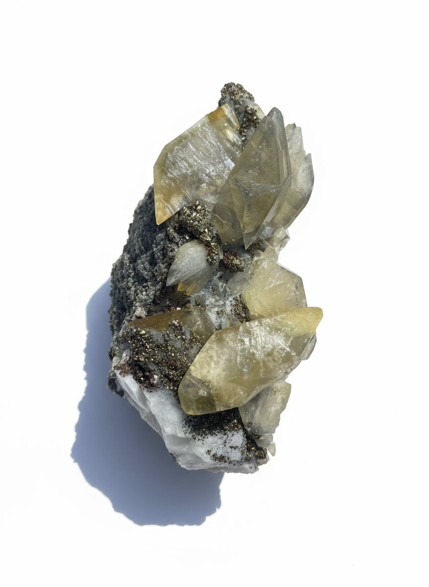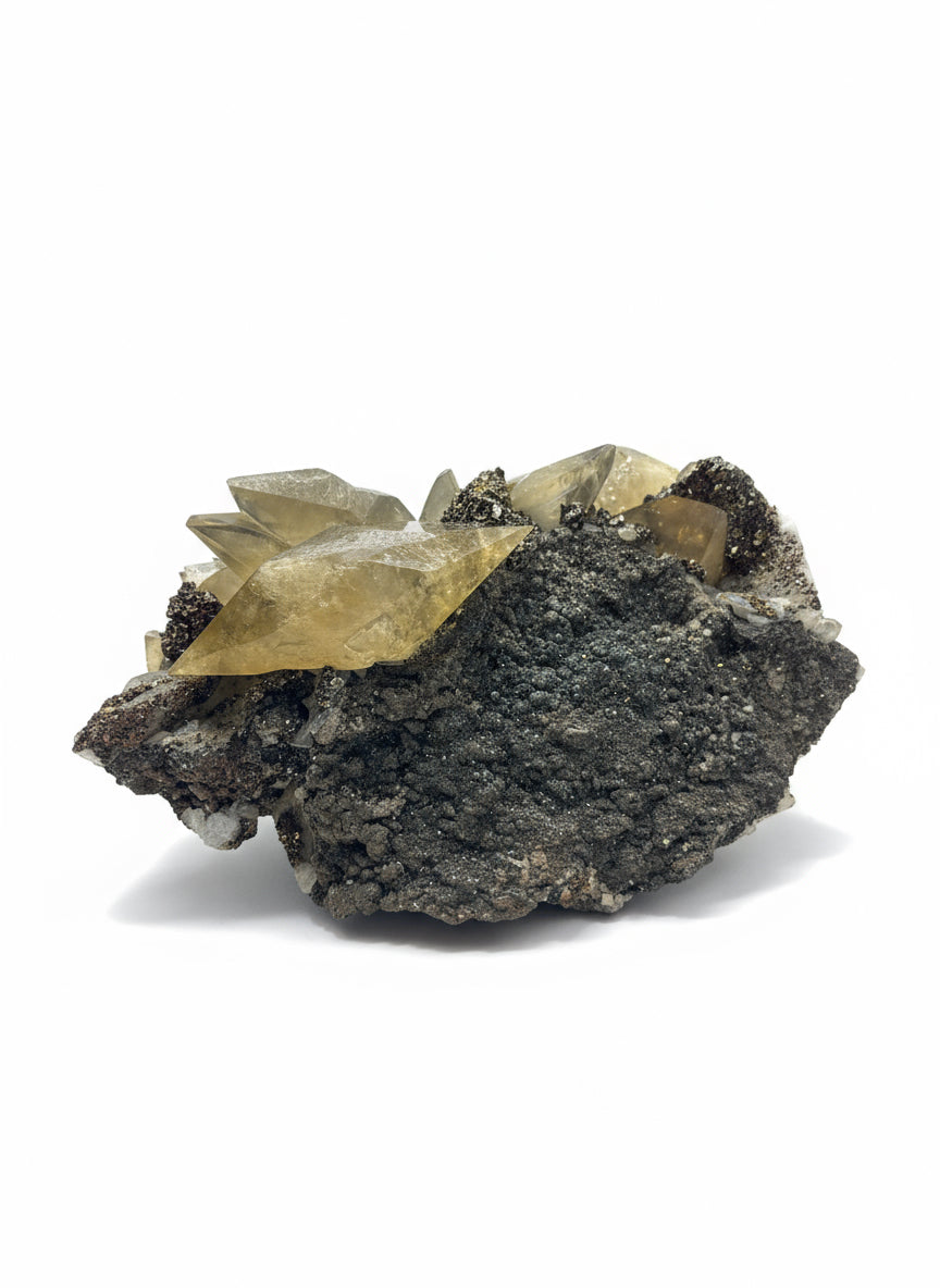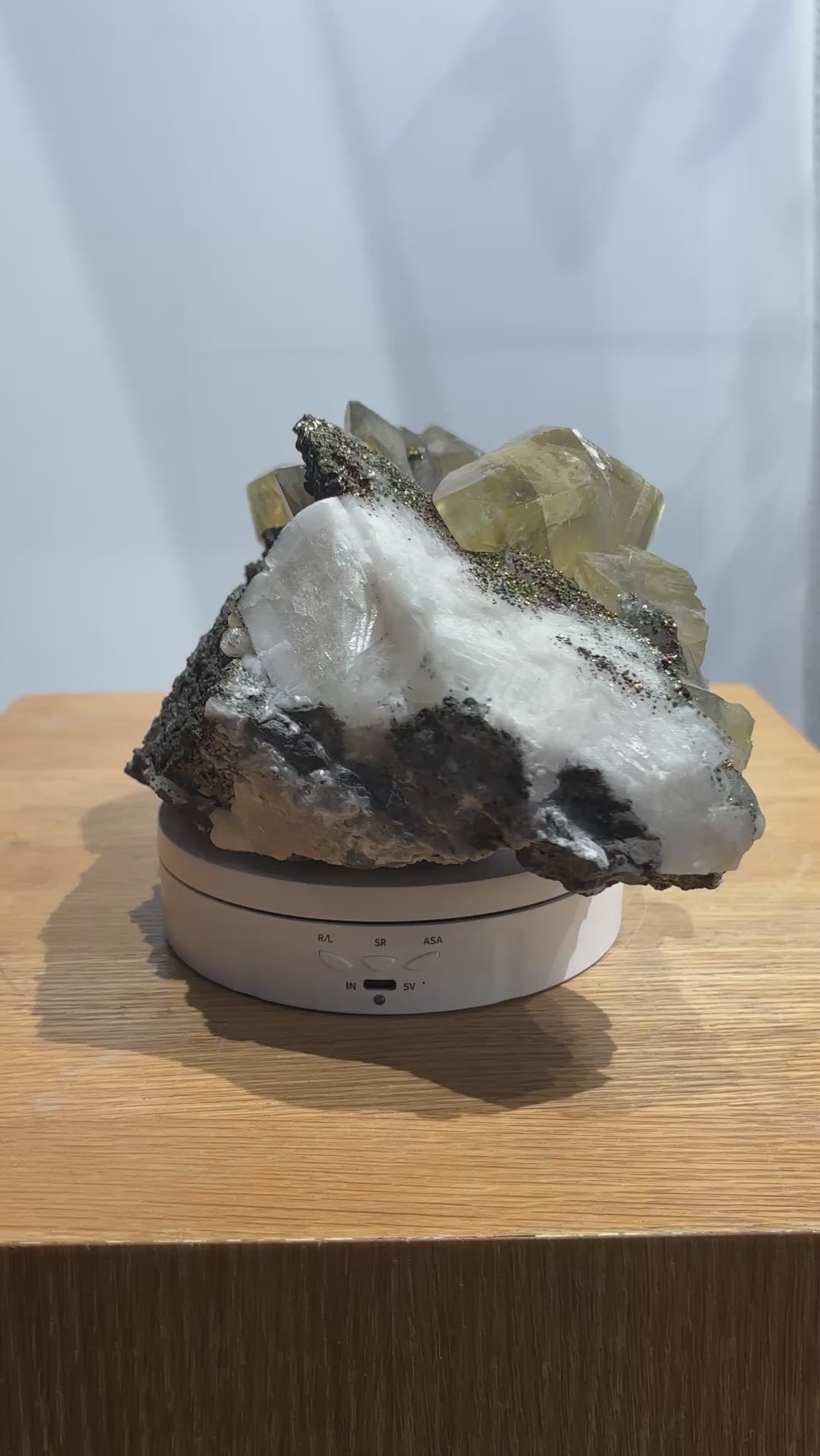 Calcite with Chalcopyrite specimens showcase striking contrasts between translucent calcite rhombohedra and metallic chalcopyrite. The prominent calcite crystals display excellent clarity and geometric form, while the associated chalcopyrite exhibits characteristic iridescent tarnish—displaying vibrant rainbow hues across its surface. This combination exemplifies classic mineral associations found in hydrothermal environments, making it an excellent addition to any serious collector's cabinet.