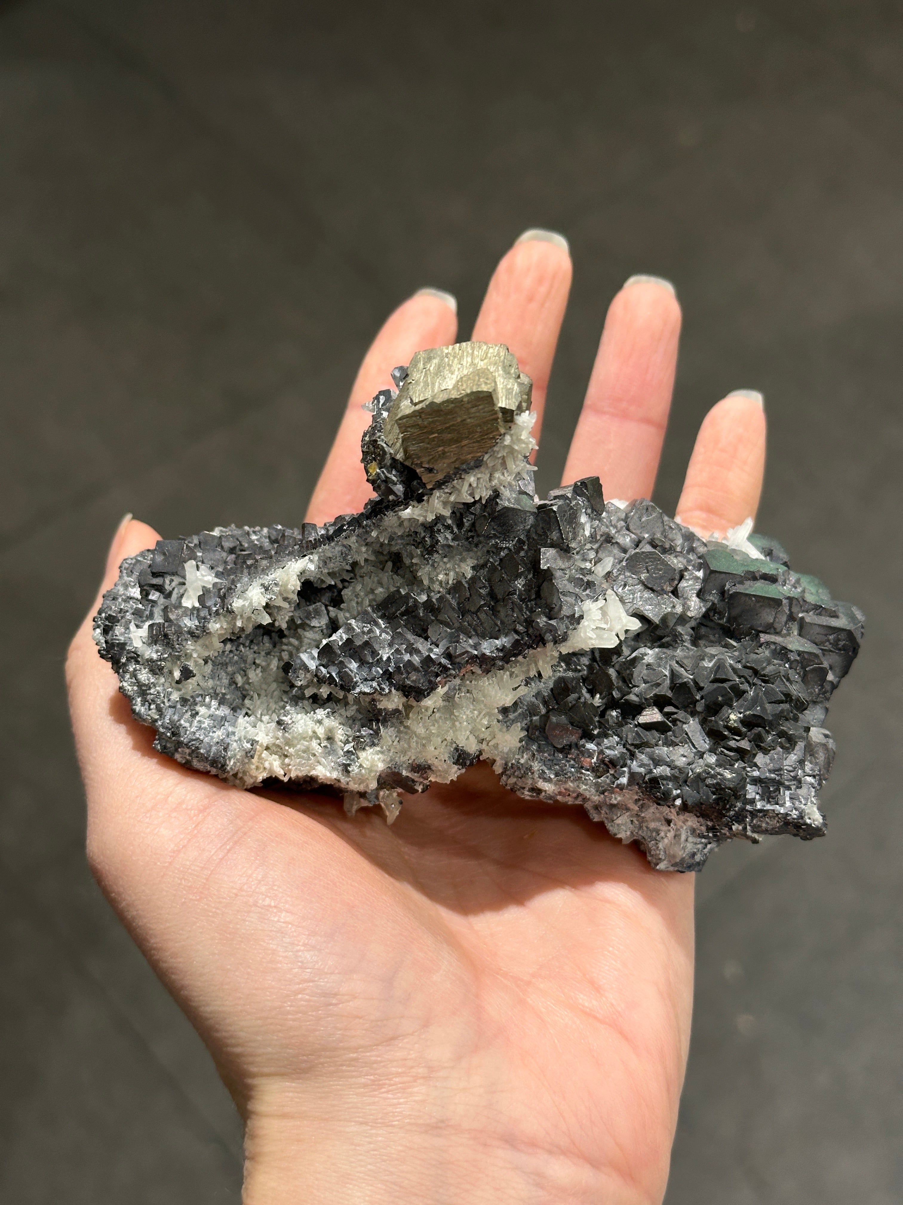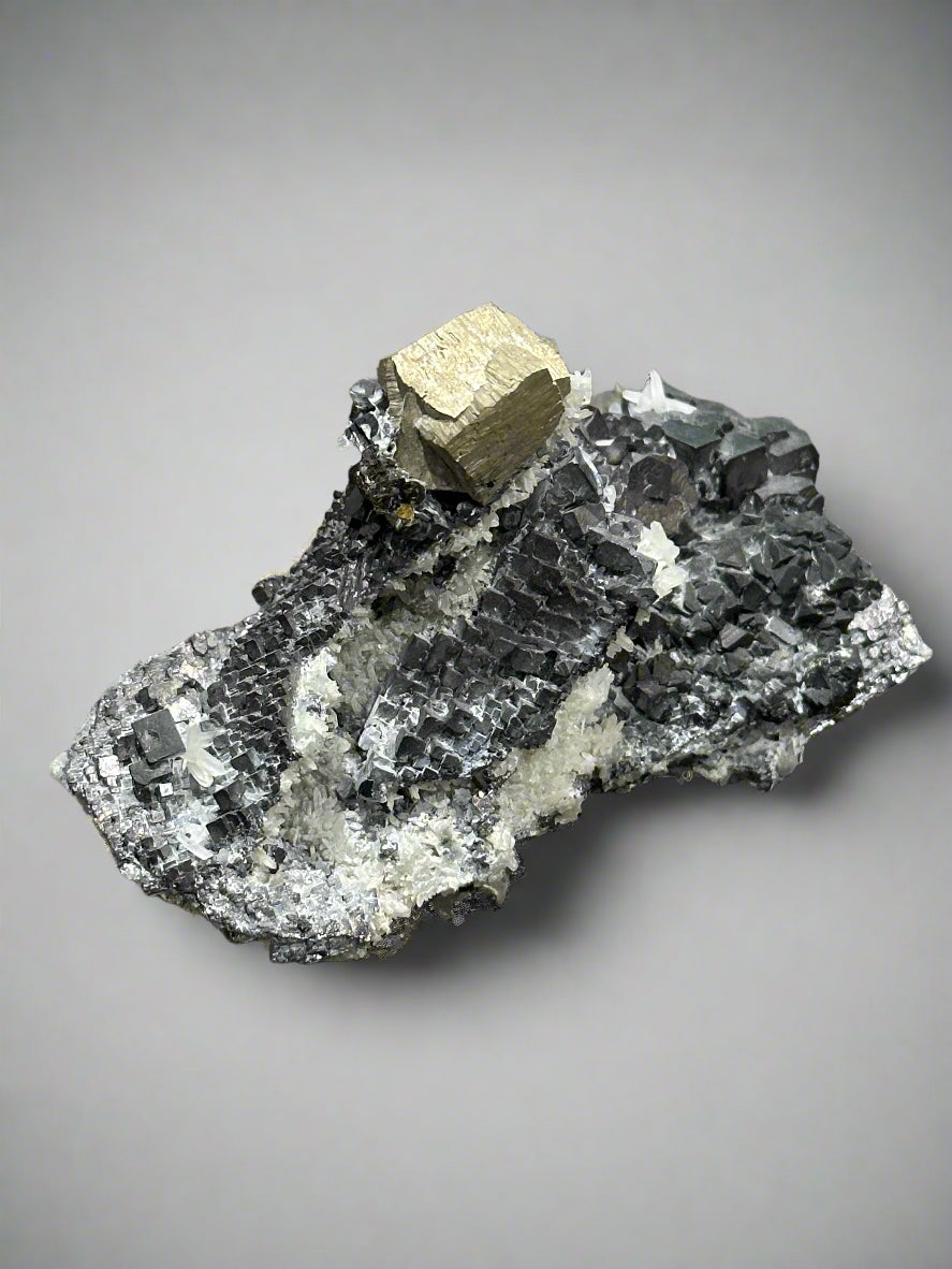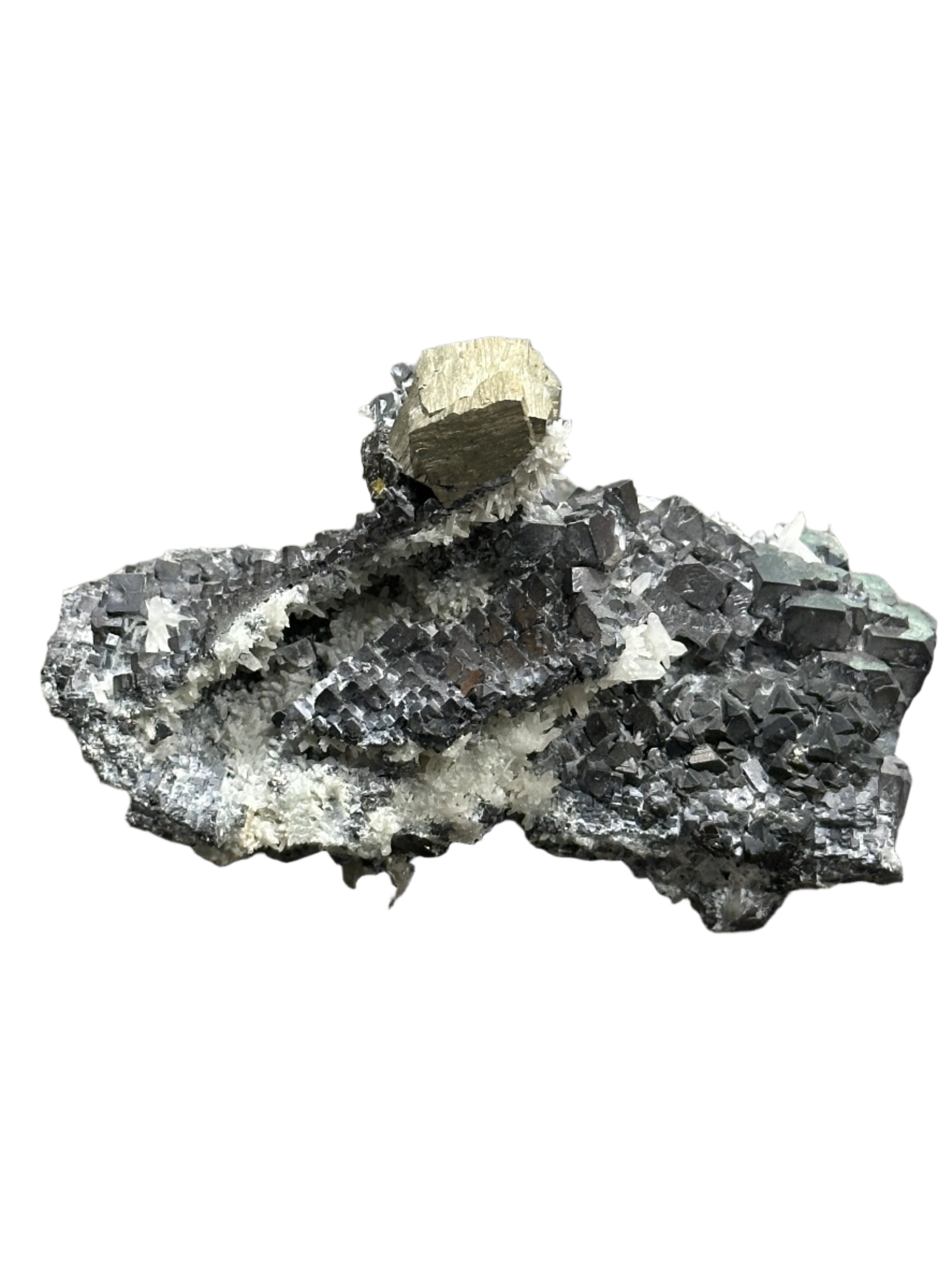 Explore the mineral world with this stunning Calcopyrite and Galena crystal. Sourced from Missouri, these crystals offer a unique composition and aesthetic appeal. Appreciate the intricate patterns and colors while learning about their geological significance. Perfect for any collector or enthusiastic scientist.