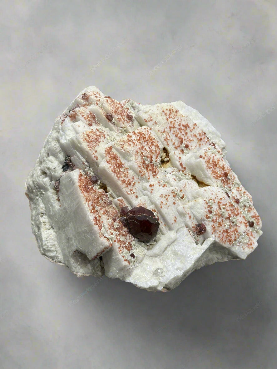 This Garnet on Albite crystal from Pakistan is a strikingly beautiful gemstone that combines the unique properties of garnet and albite. With its deep red hue and contrasting white base, this crystal is a mesmerizing addition to any collection.
