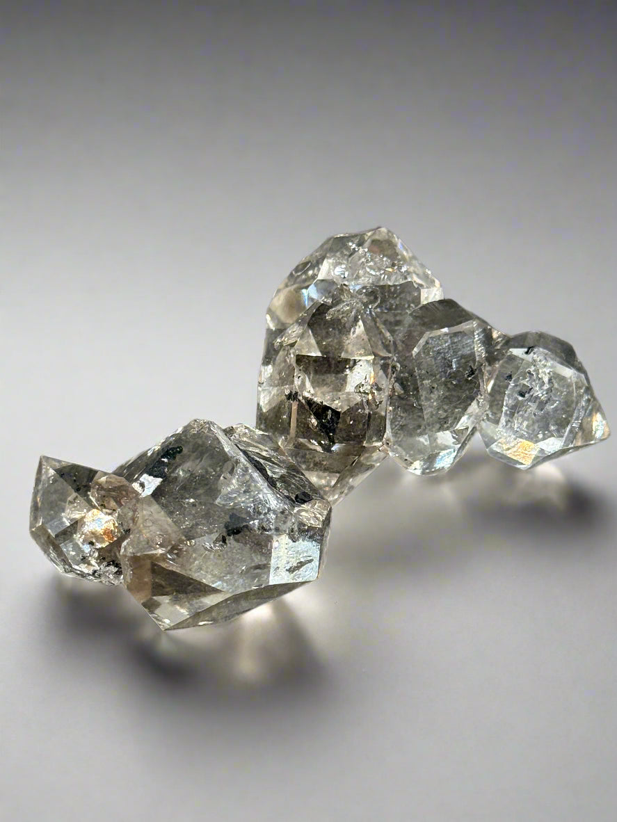Herkimer Diamonds are exceptional double-terminated quartz crystals exclusively from Herkimer County, New York. These rare specimens feature natural faceting and exceptional clarity, making them prized by collectors and metaphysical practitioners alike. Their distinctive geometric structure and diamond-like brilliance represent the pinnacle of natural quartz formation, developed over millions of years in dolomite limestone cavities. Each crystal exhibits unique characteristics while maintaining the signature clarity that defines authentic Herkimer specimens.