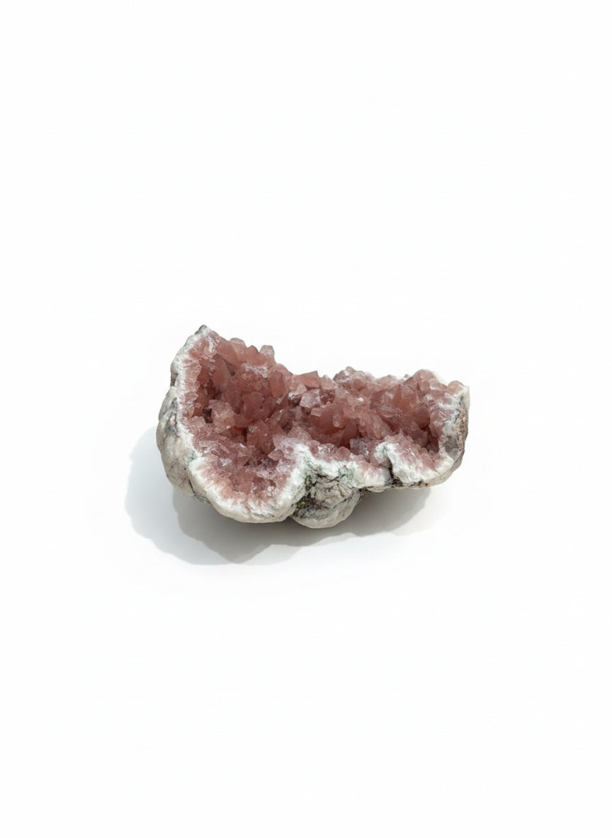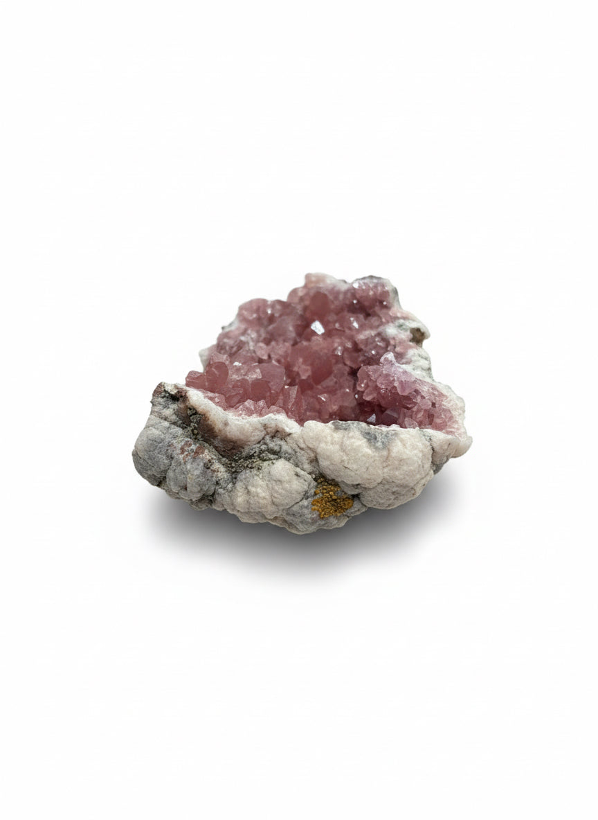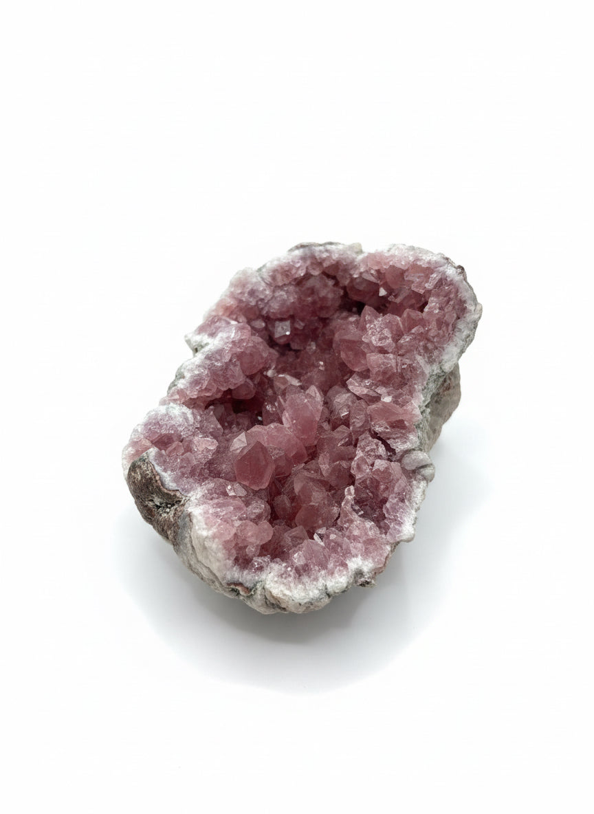 Pink Amethyst specimens showcase delicate rose-hued crystals nestled within natural rock formations, creating striking contrast between the vibrant interior and earthy exterior. Each piece displays the distinctive crystalline structure characteristic of amethyst, with soft pink tones that range from pale blush to deeper mauve. The surrounding matrix provides authentic geological context, making these specimens ideal for collectors, mineral enthusiasts, and those seeking natural decorative elements with genuine geological significance. Perfect for display, study, or adding refined natural beauty to any space.