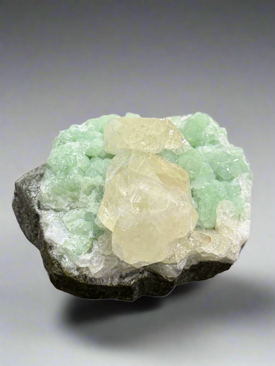 Rare mineral specimen featuring lustrous Datolite crystals perched on a matrix of vibrant green Prehnite from the renowned Lane Quarry in Massachusetts. This exceptional piece showcases the classic paragenesis of these minerals, with well-formed crystal structures displaying characteristic morphology. A significant addition for serious collectors of New England mineralogy.
