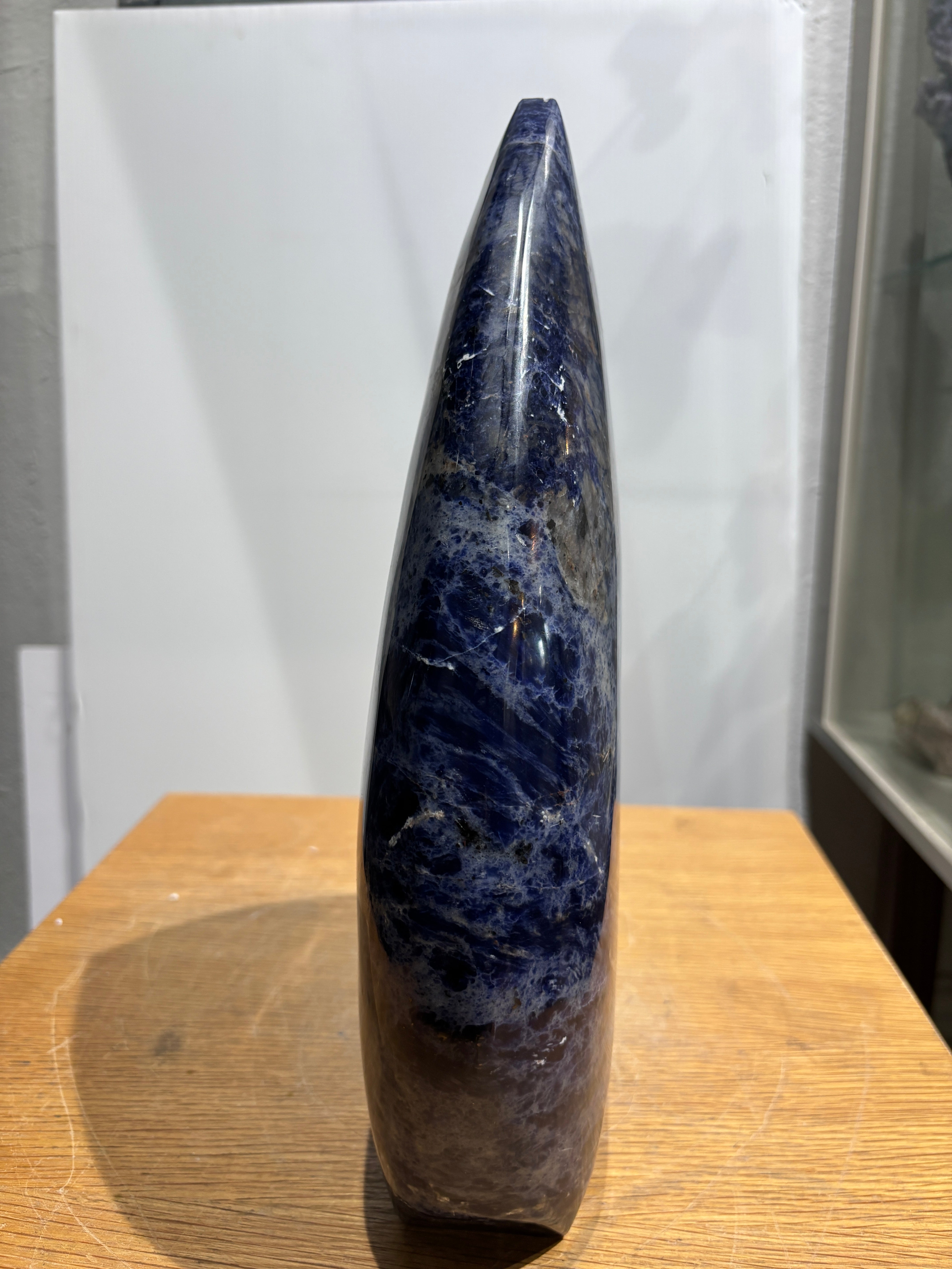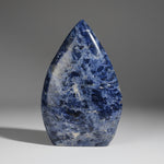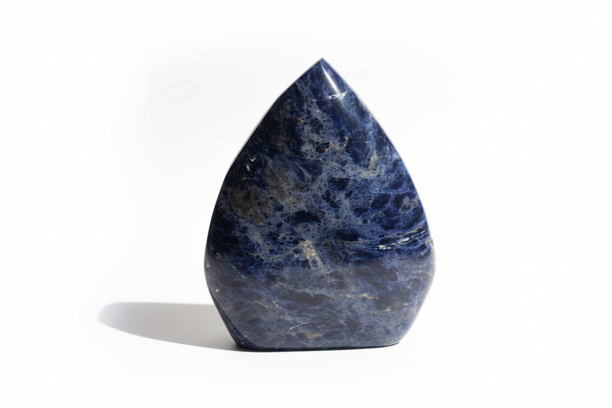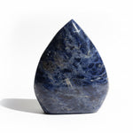 Sodalite is a striking deep blue mineral prized by collectors and designers for its rich color and distinctive white veining. This smooth specimen showcases the stone's natural beauty with a polished finish that highlights its vibrant azure hues. Sodalite is valued in both lapidary work and mineral collections for its aesthetic appeal and relative durability. Each piece displays unique patterns, making it a distinctive addition to any geological or decorative collection.