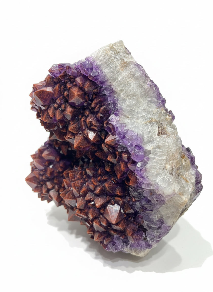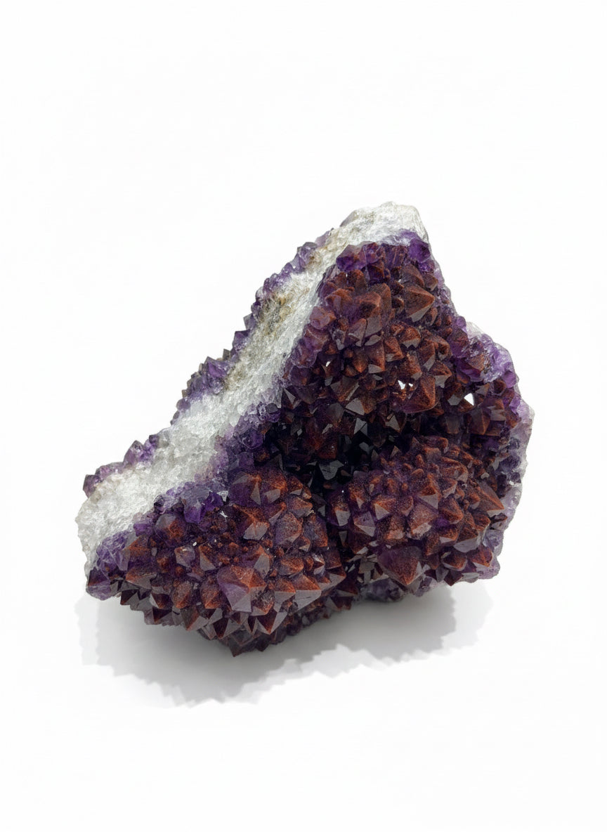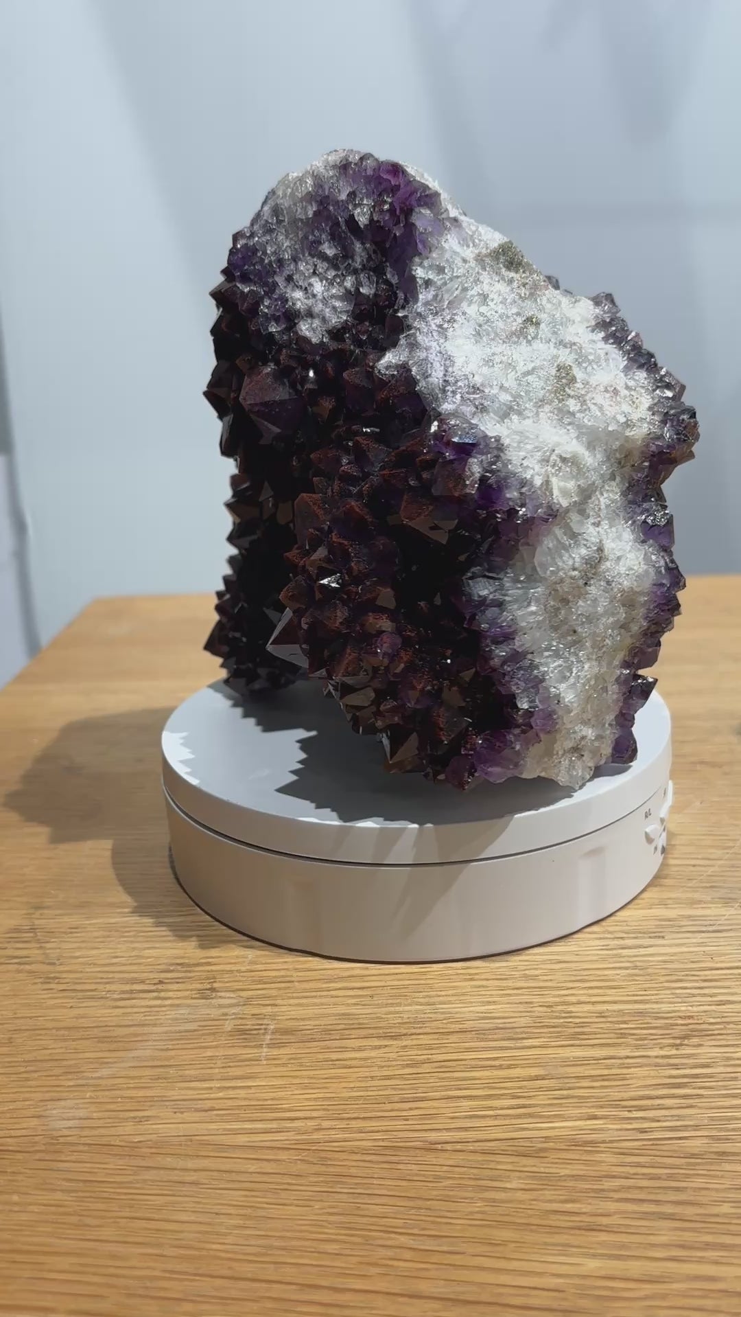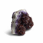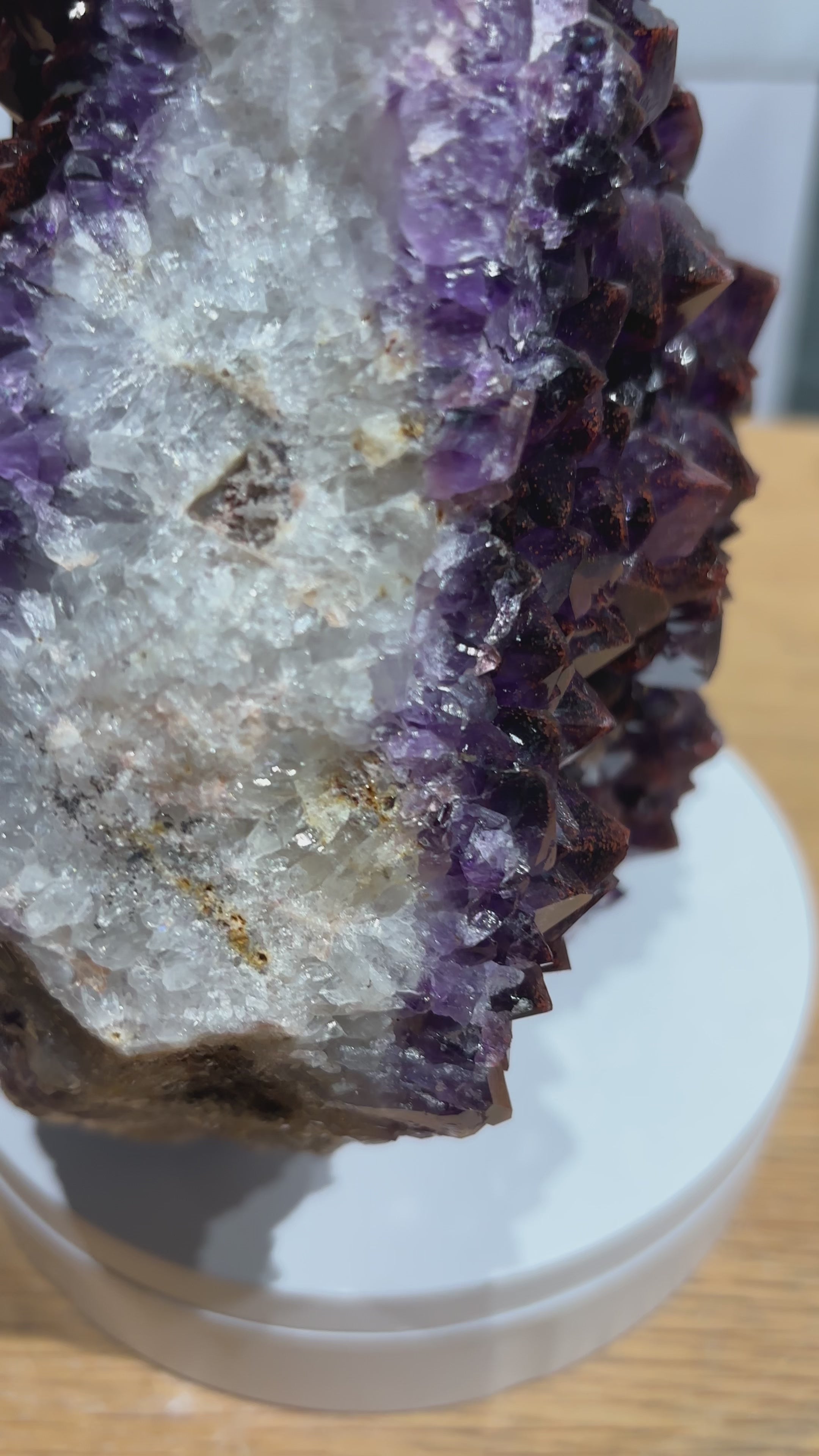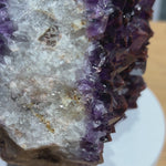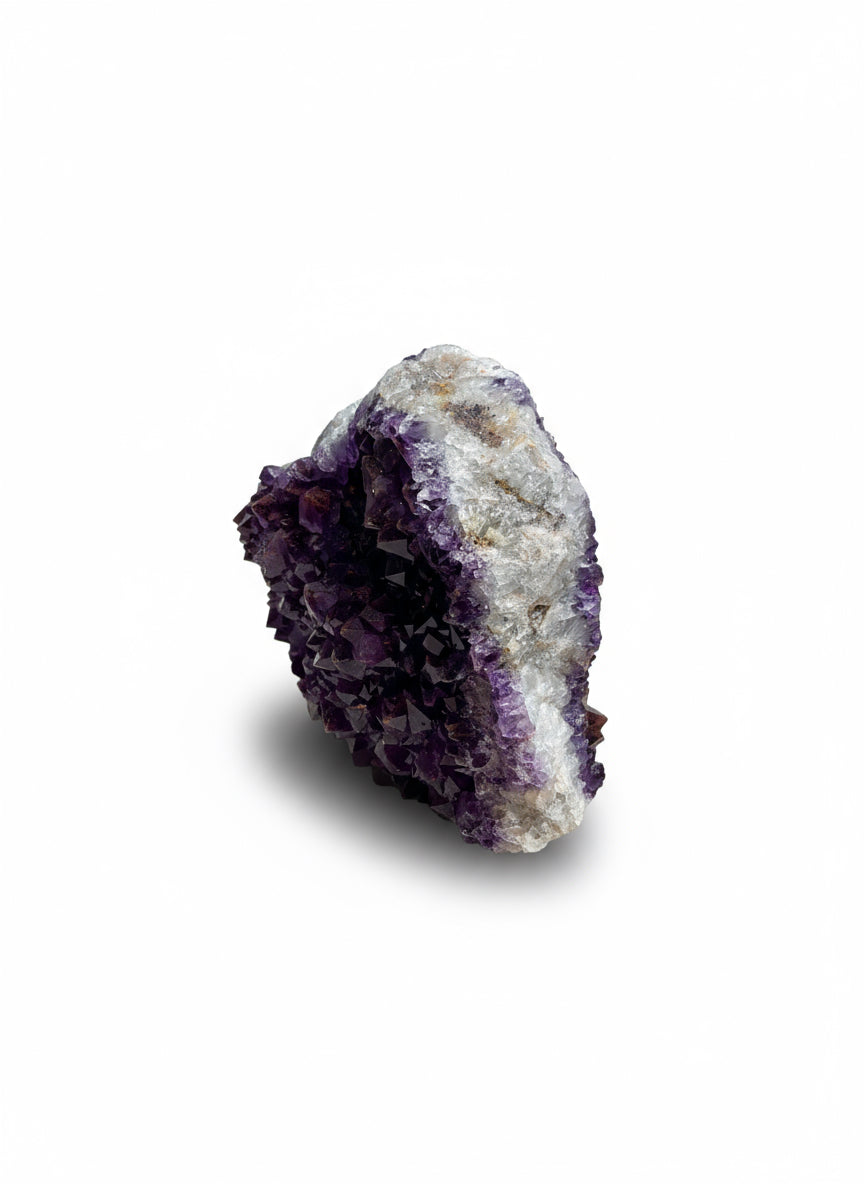This exquisite Thunder Bay amethyst showcases deep purple hues unique to its origin, framed by a striking hematite ring at its center. The natural contrast emphasizes the stone’s rich color and enhances its overall visual appeal. Ideal for collectors and connoisseurs, this specimen offers both geological significance and aesthetic sophistication.