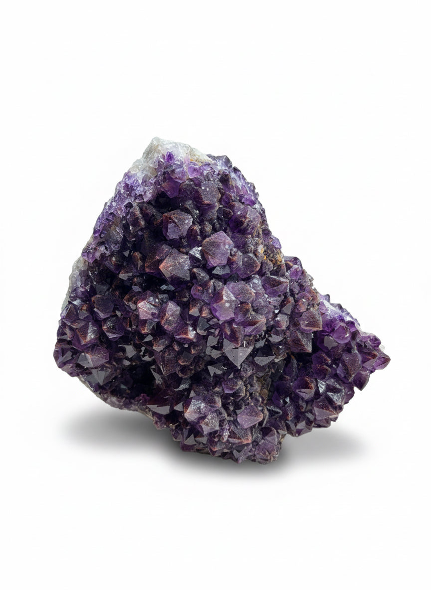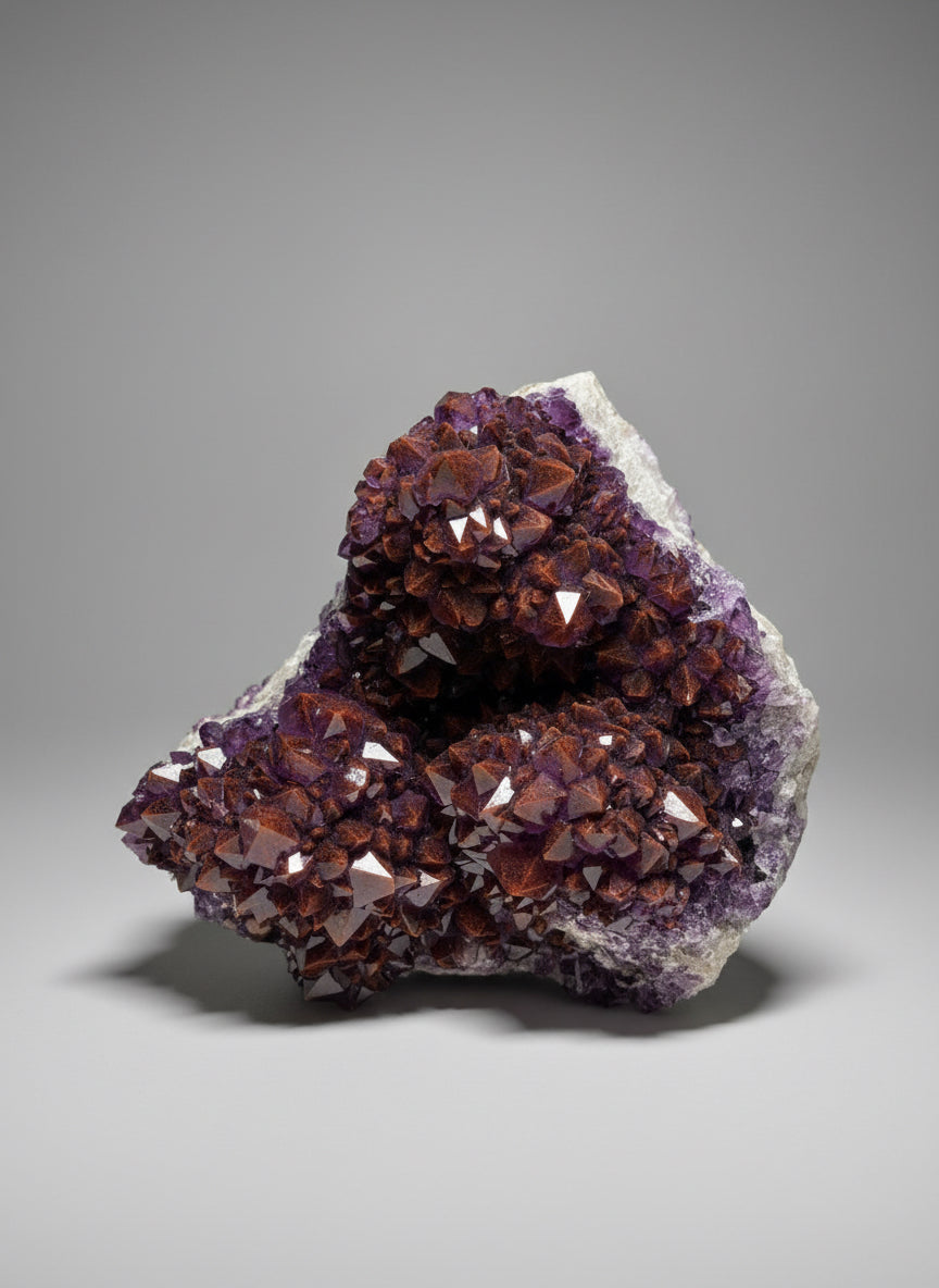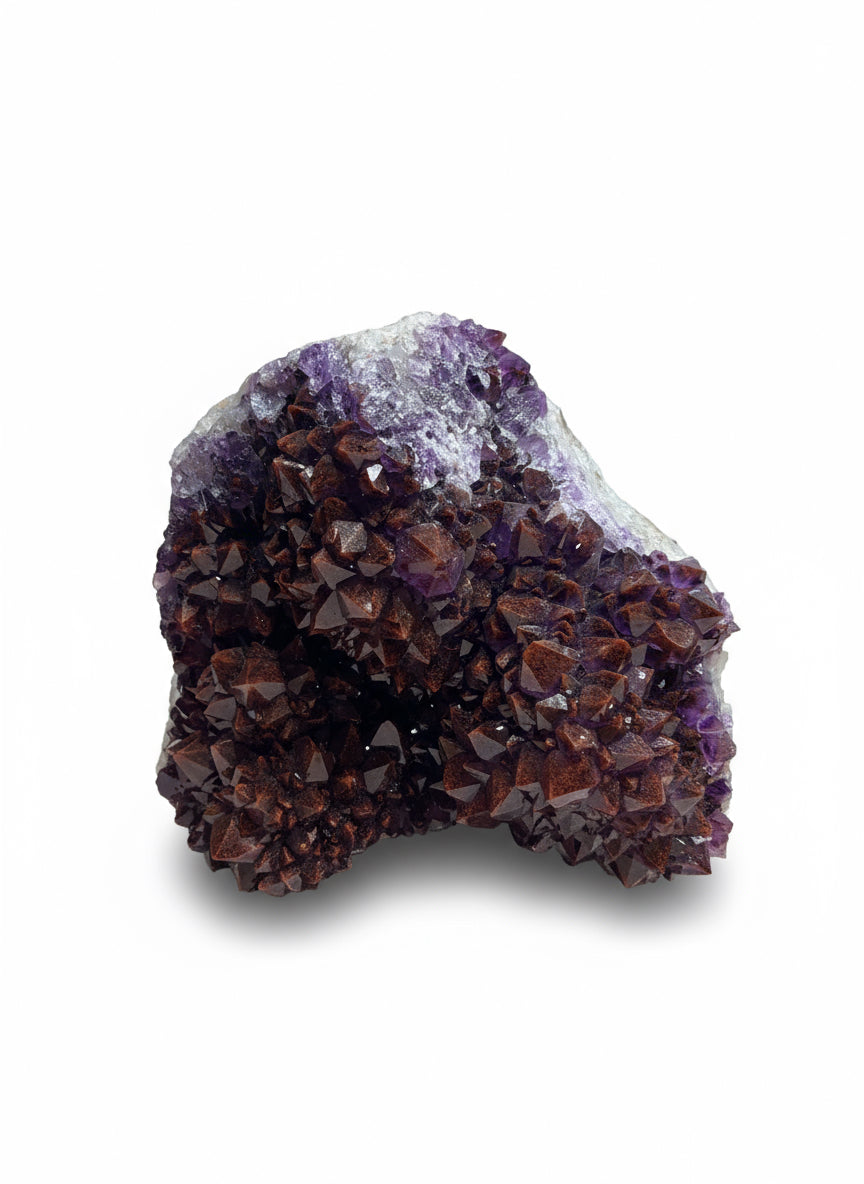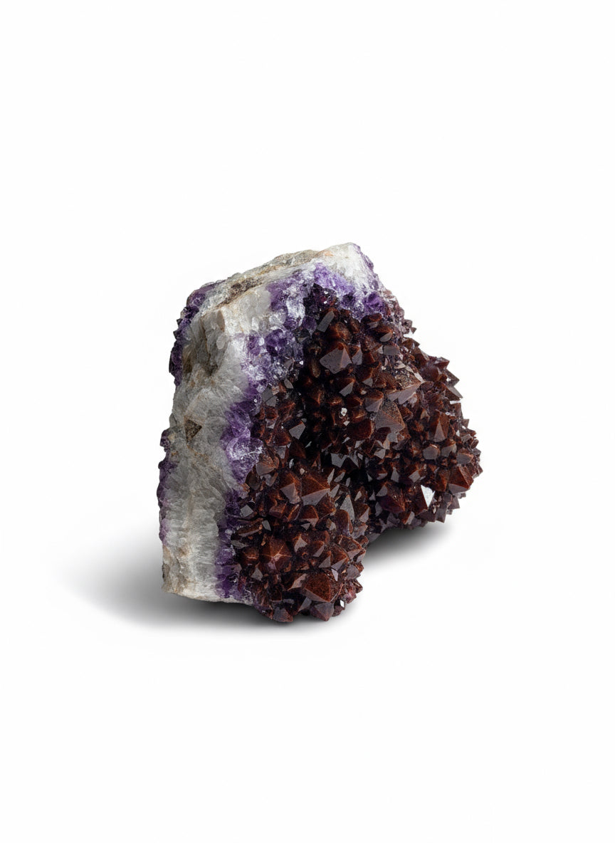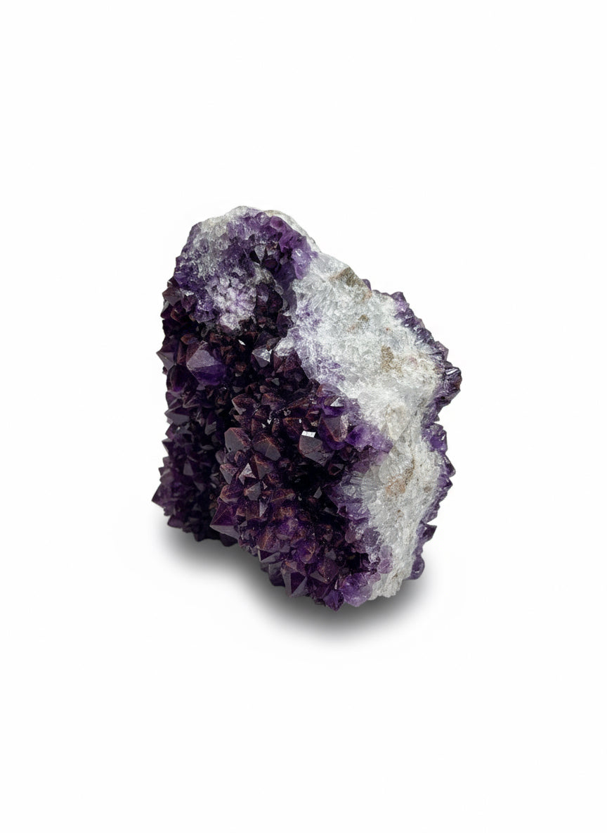 This exquisite Thunder Bay amethyst showcases deep purple hues unique to its origin, framed by a striking hematite ring at its center. The natural contrast emphasizes the stone’s rich color and enhances its overall visual appeal. Ideal for collectors and connoisseurs, this specimen offers both geological significance and aesthetic sophistication.