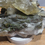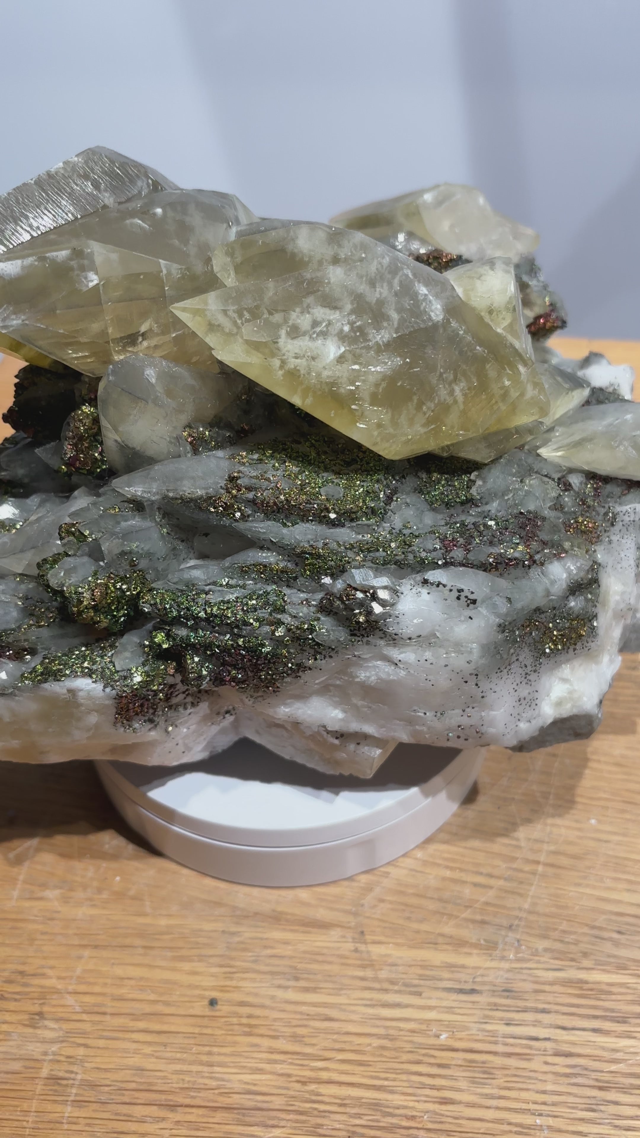 Calcite with Chalcopyrite specimens showcase striking contrasts between translucent calcite rhombohedra and metallic chalcopyrite. The prominent calcite crystals display excellent clarity and geometric form, while the associated chalcopyrite exhibits characteristic iridescent tarnish-displaying vibrant rainbow hues across its surface. This combination exemplifies classic mineral associations found in hydrothermal environments, making it an excellent addition to any serious collector's cabinet.
