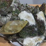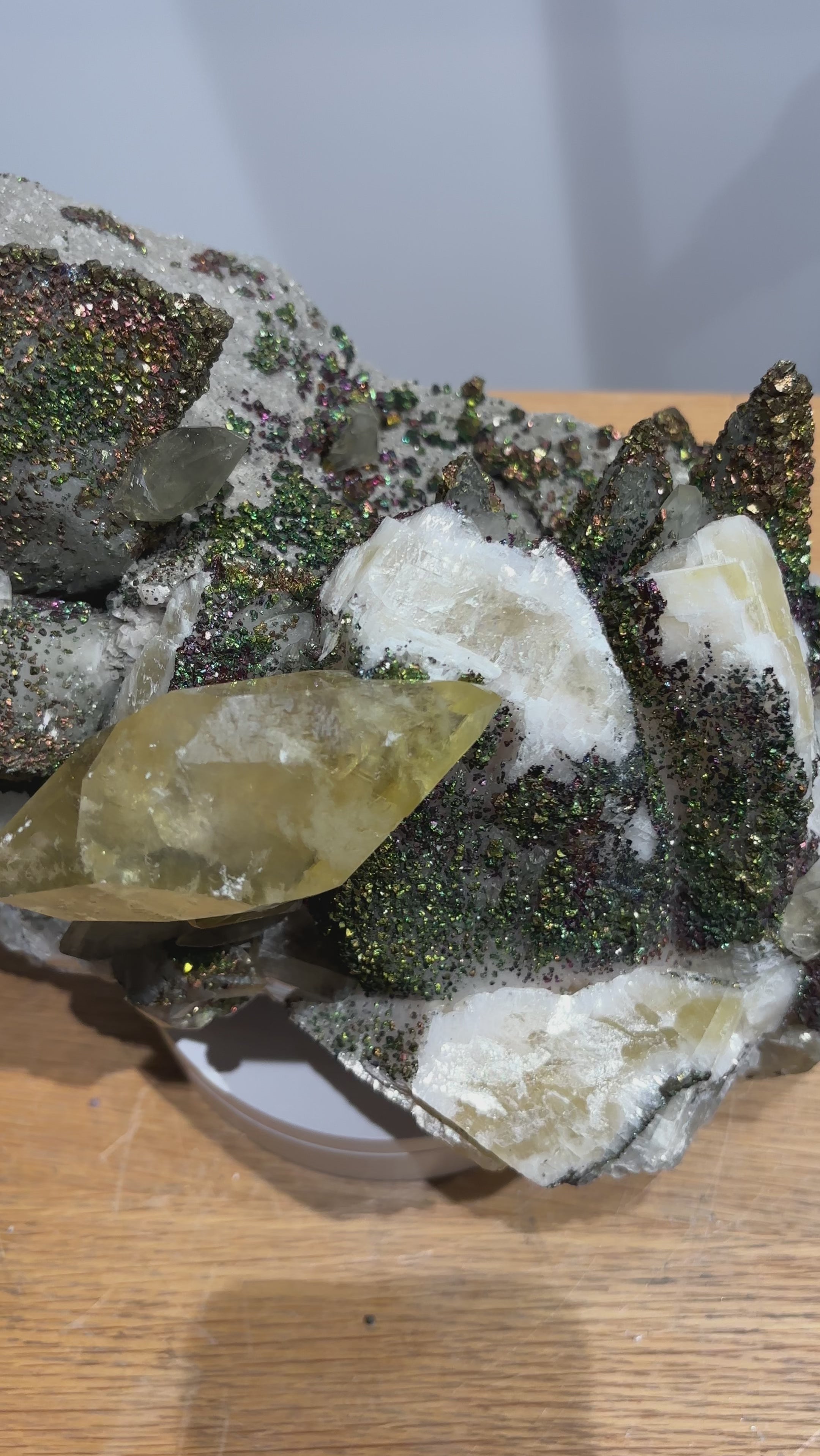 Calcite with Chalcopyrite specimens showcase striking contrasts between translucent calcite rhombohedra and metallic chalcopyrite. The prominent calcite crystals display excellent clarity and geometric form, while the associated chalcopyrite exhibits characteristic iridescent tarnish-displaying vibrant rainbow hues across its surface. This combination exemplifies classic mineral associations found in hydrothermal environments, making it an excellent addition to any serious collector's cabinet.