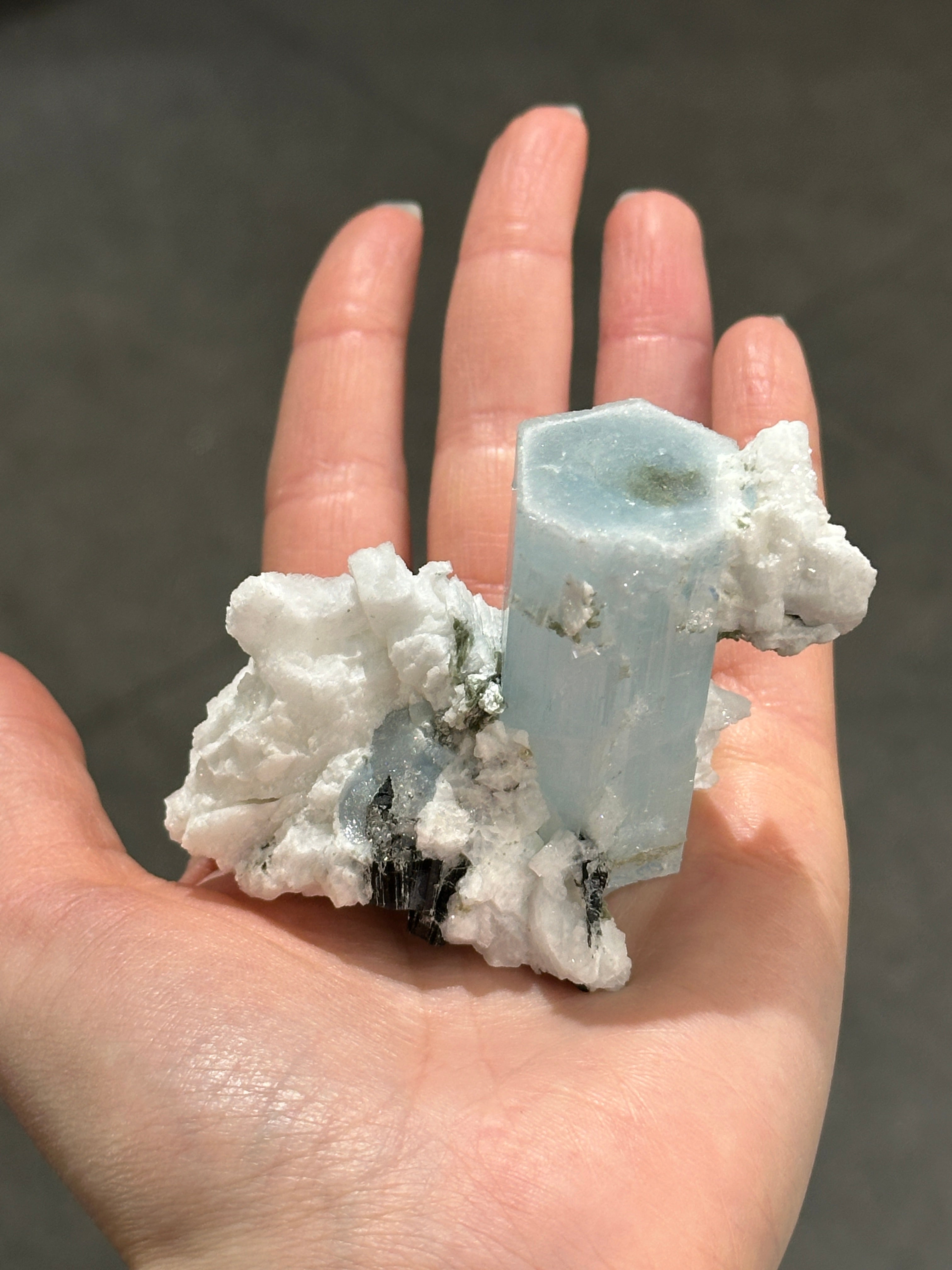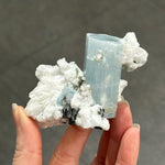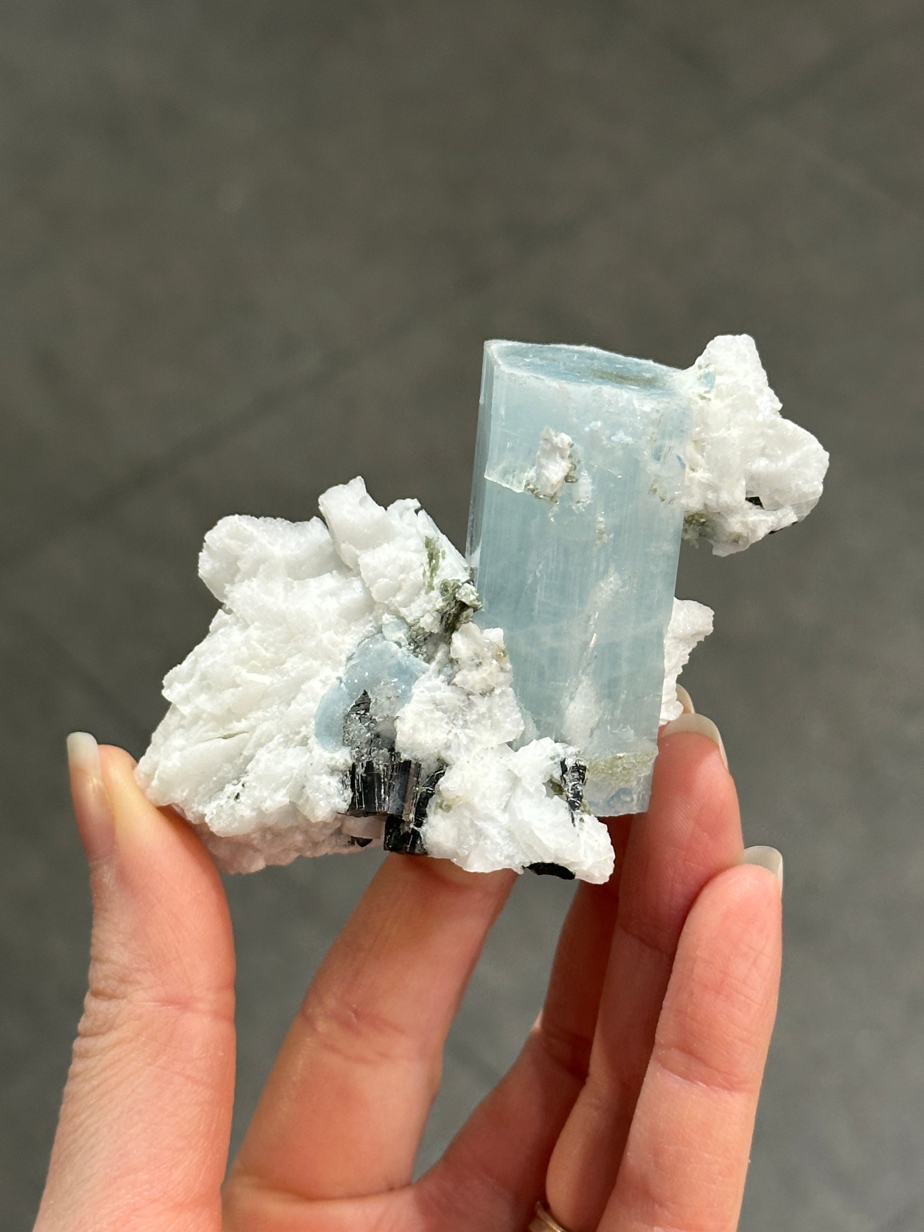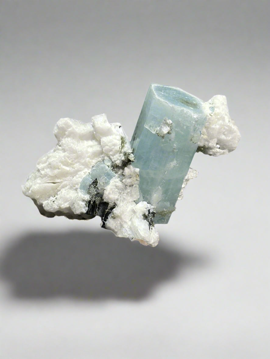 Discover the natural beauty of Aquamarine with Albite and Black Tourmaline from Pakistan. This stunning combination offers a unique blend of translucent blue hues and smoky undertones, creating a mesmerizing visual appeal. This gemstone trio is perfect for collectors and enthusiasts alike.