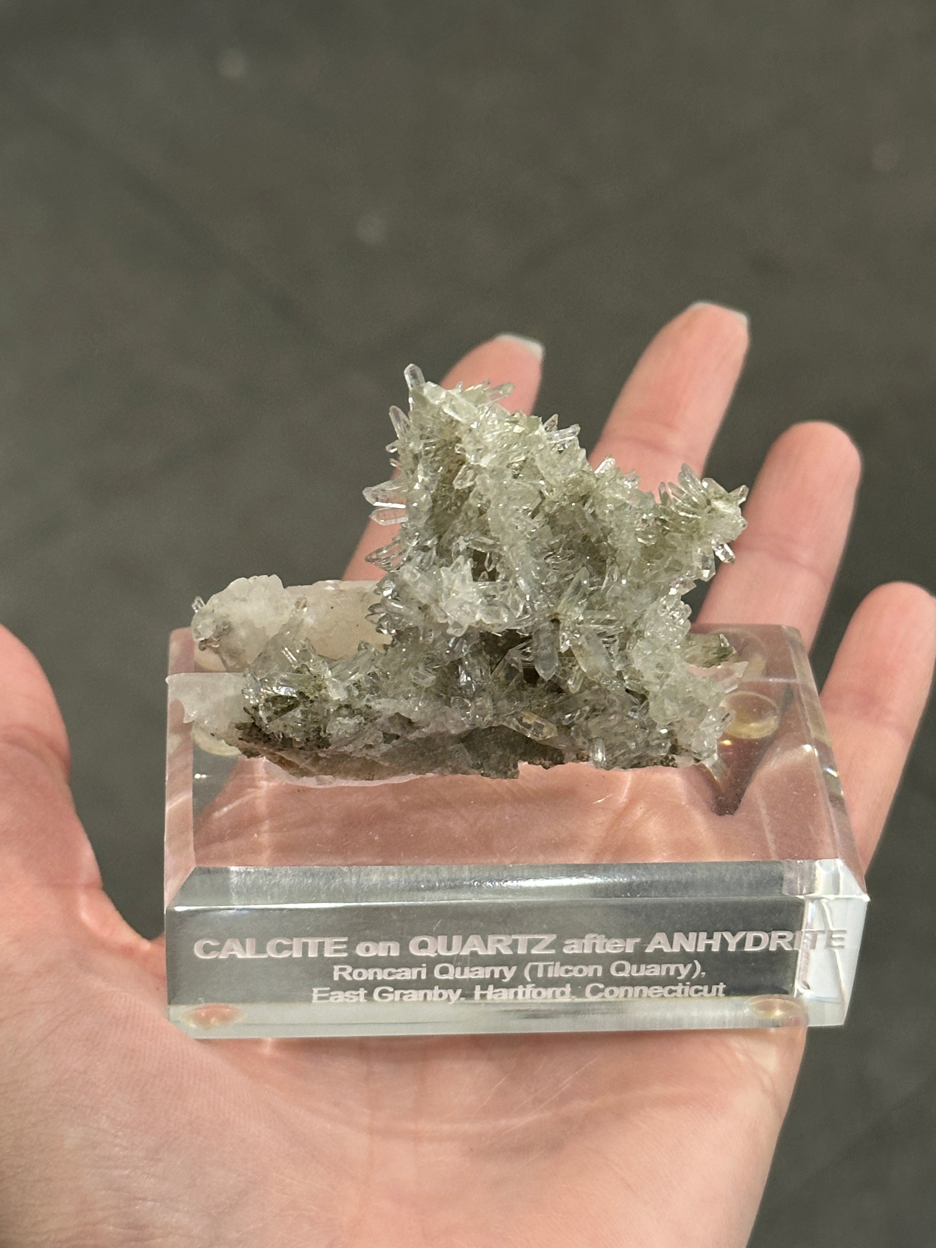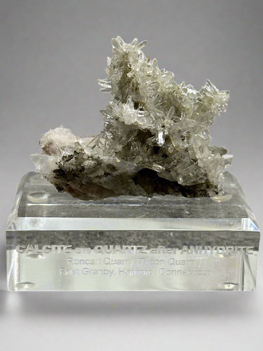 Experience a rare natural occurrence with our Calcite on Quartz after Anhydrite specimen from East Granby, Connecticut. This unique formation showcases the transformation of Anhydrite into Calcite on Quartz, offering a stunning display of geological processes. A must-have for any mineral collector or geology enthusiast.
