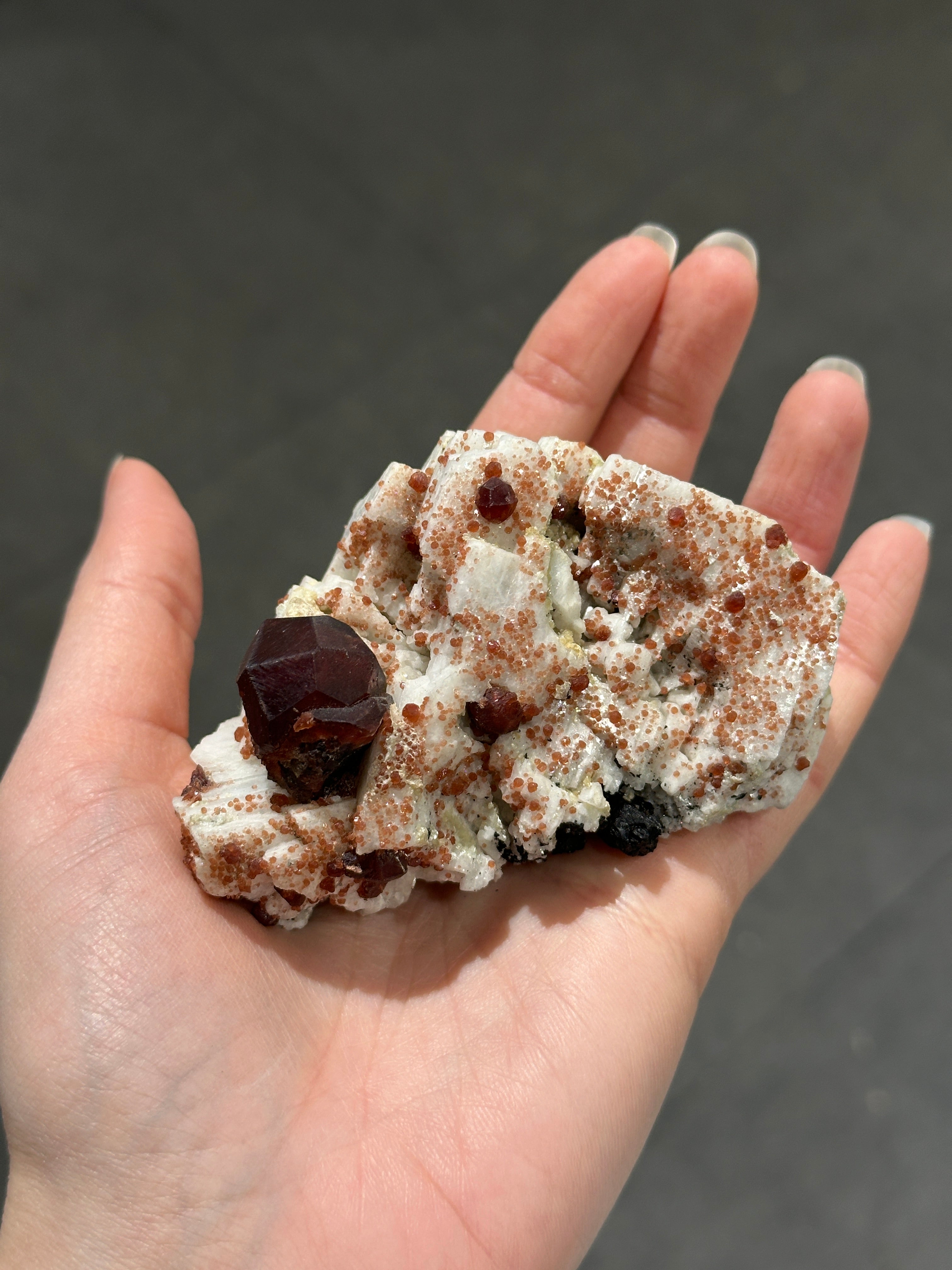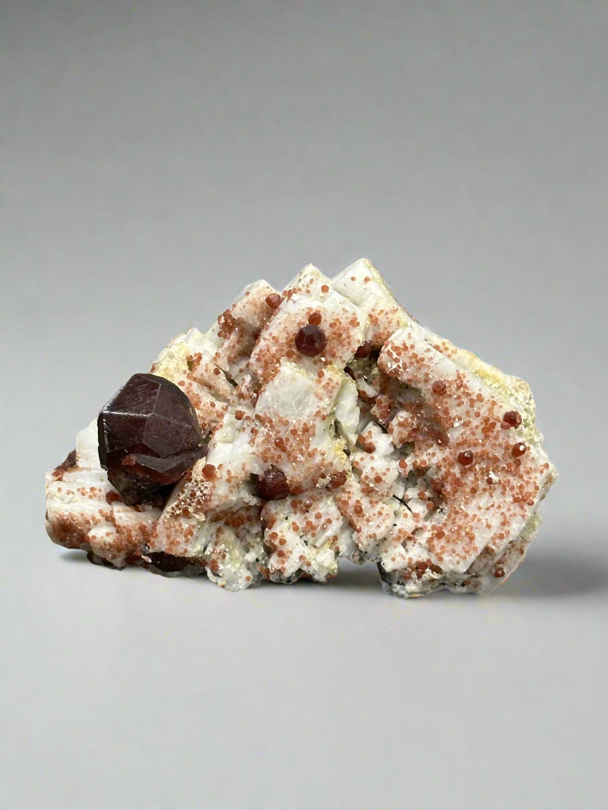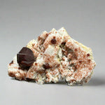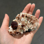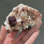 This Garnet on Albite crystal from Pakistan is a strikingly beautiful gemstone that combines the unique properties of garnet and albite. With its deep red hue and contrasting white base, this crystal is a mesmerizing addition to any collection.