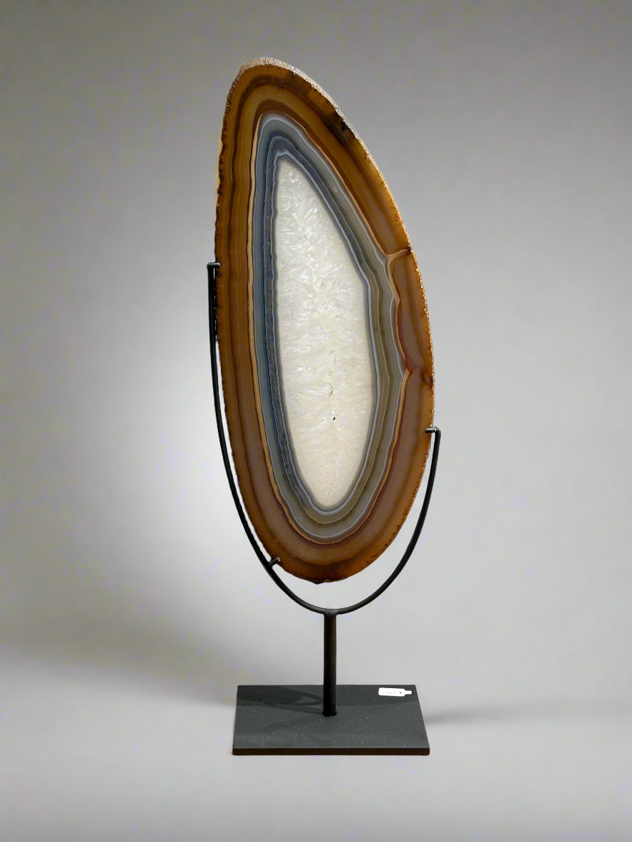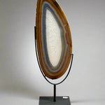 This Agate Slice from Brazil showcases the natural beauty and intricate banding characteristic of high-quality agate. Perfect for collectors, designers, or those seeking a unique decorative element, it offers both aesthetic appeal and geological interest. Its polished surface highlights vibrant colors and patterns formed over millennia, making it an exceptional specimen for display or incorporation into artistic projects.