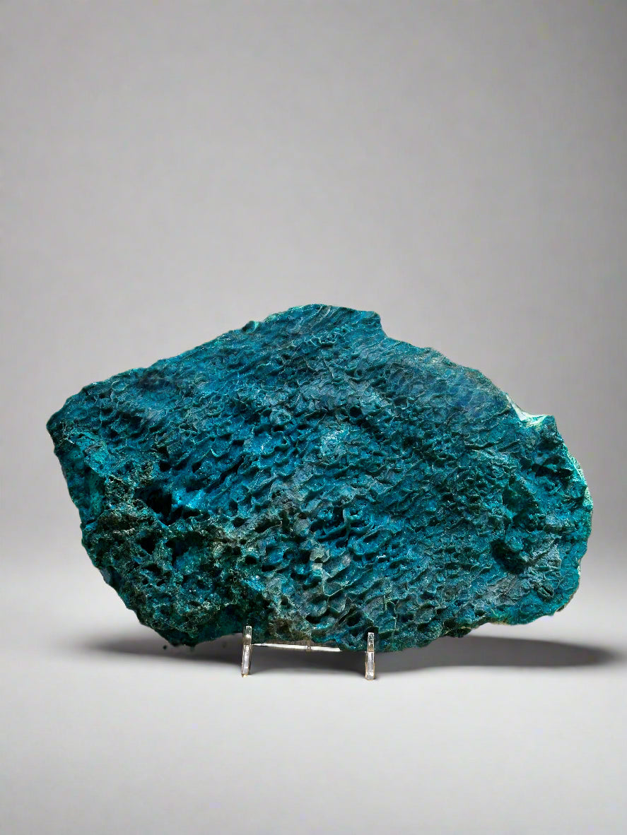 This Chrysocolla crystal originates from Peru and is known for its vibrant blue-green color and unique patterns. Its natural beauty makes it a striking statement piece and perfect addition to any crystal collection.