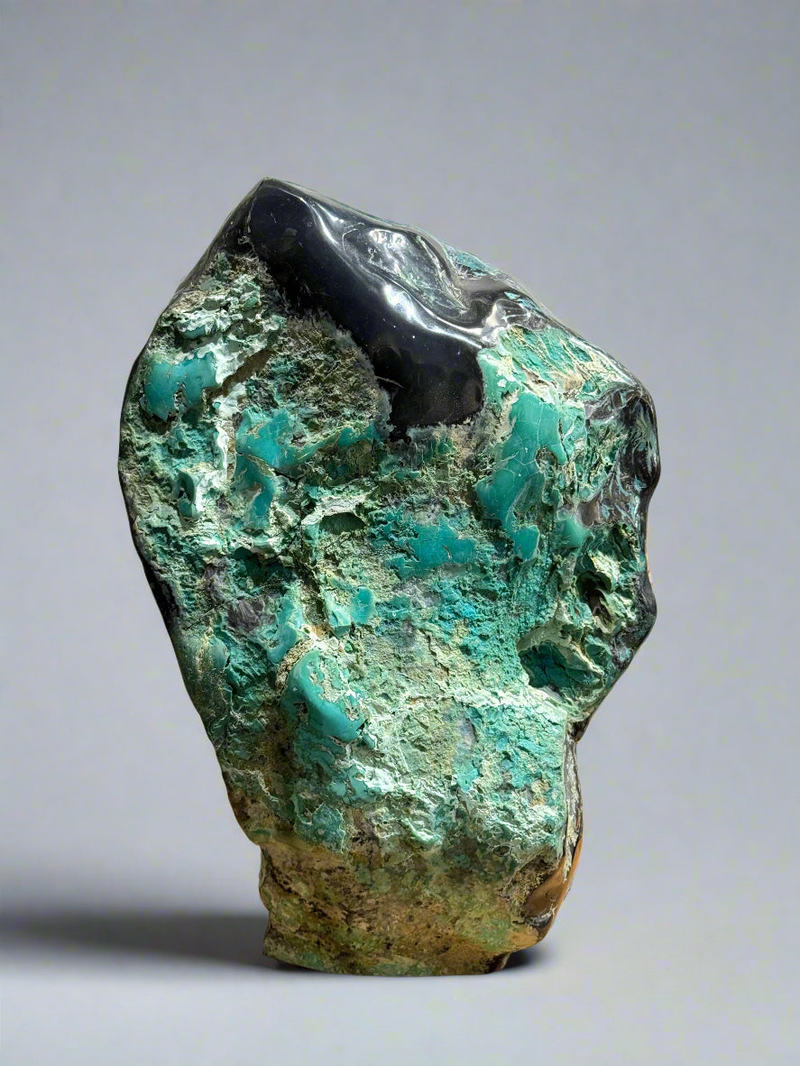 Chrysocolla on Petrified Wood from Indonesia showcases a unique fusion of vibrant blue-green chrysocolla mineralization atop ancient fossilized wood. This specimen highlights the intricate interplay between mineral and organic textures, offering both aesthetic appeal and geological significance. Ideal for collectors and researchers, it provides insight into mineral formation processes and the preservation of prehistoric flora. Its striking coloration and natural patterns make it a valuable addition to any mineralogical collection or educational display.