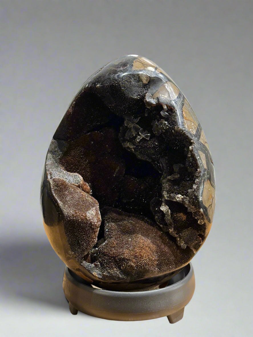 This Dragon’s Egg, aka Septarian Nodule from Madagascar, is a unique geological specimen prized for its distinctive patterns and mineral composition. Formed over millions of years, these nodules feature a striking combination of calcite, aragonite, and limestone, creating intricate, angular cavities filled with crystalline structures. Ideal for collectors and geologists, Dragon’s Egg offers insight into sedimentary processes and mineral growth, making it both a fascinating study piece and a captivating natural artifact.