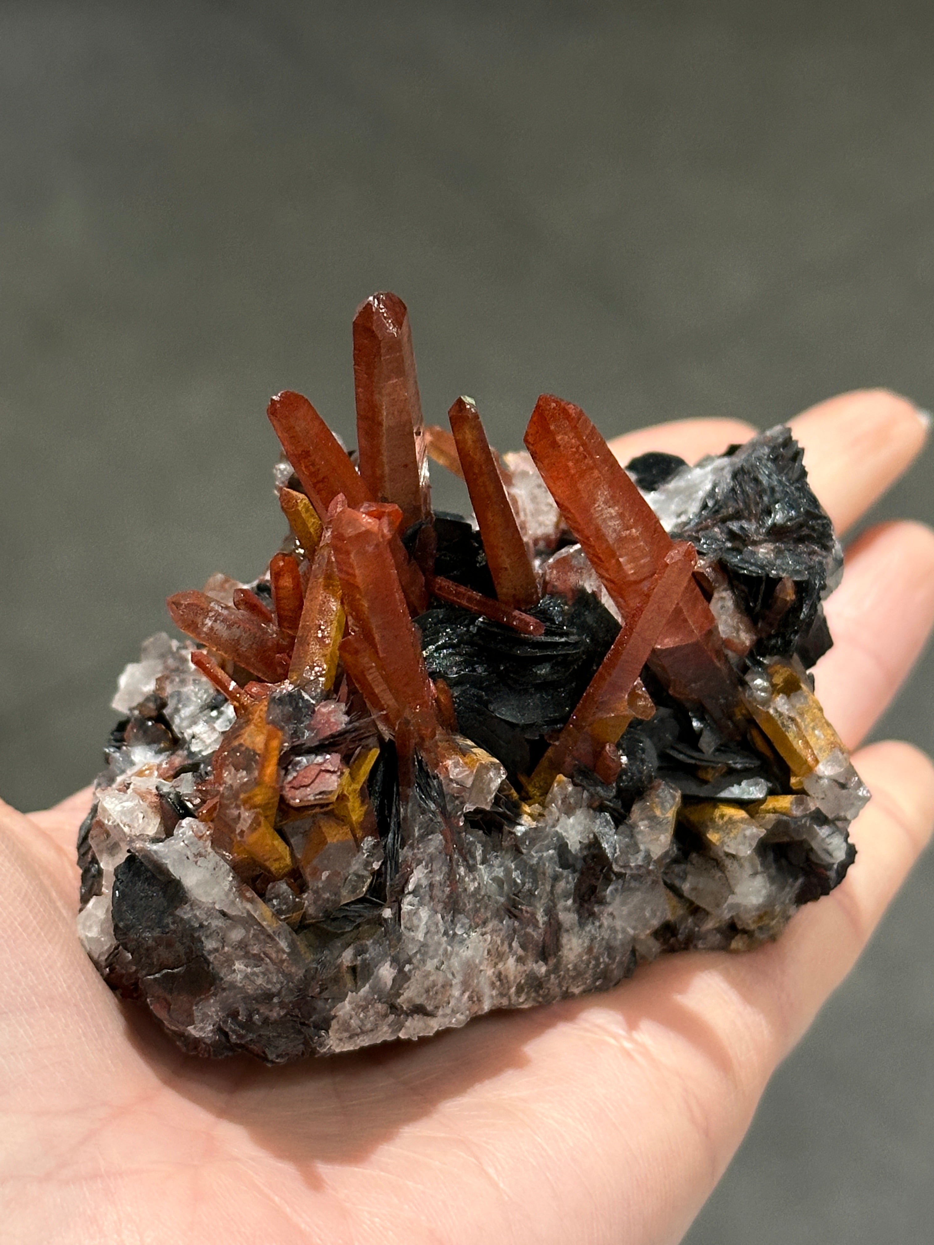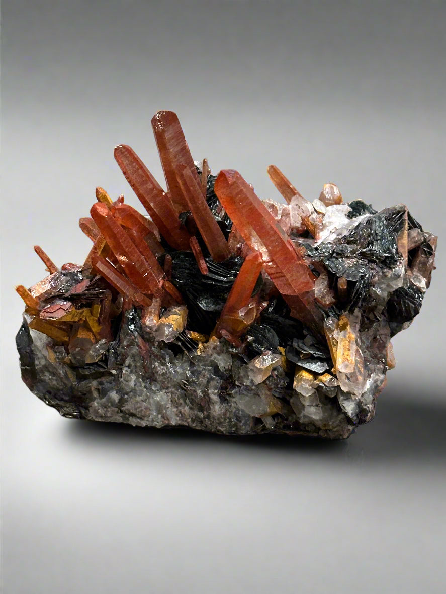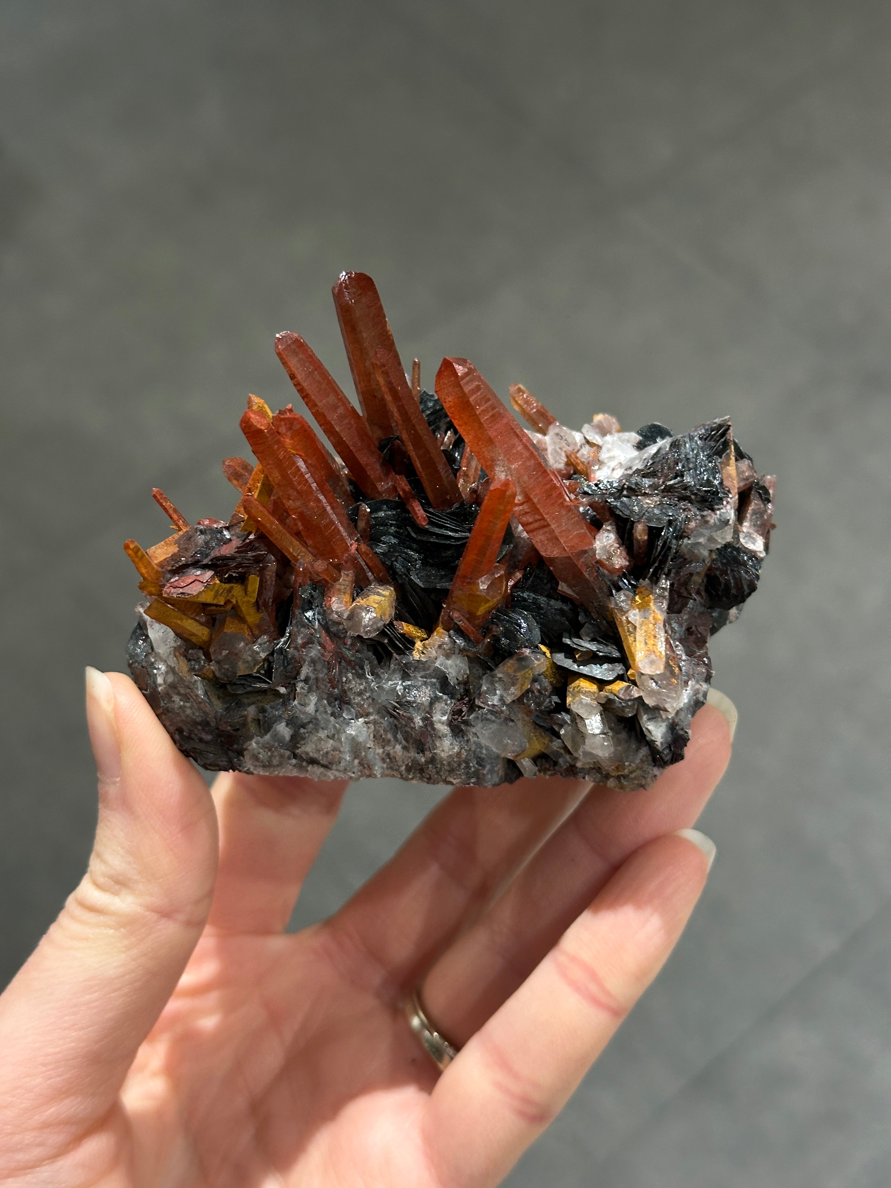 This Red Quartz with Hematite Roses crystal from China is a stunning addition to any collection. Its vibrant red color and unique hematite rose formations give this crystal a unique and eye-catching appearance. Don't miss out on this one-of-a-kind piece!